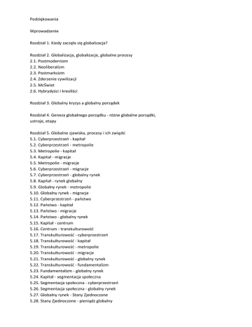 Podziękowania Wprowadzenie Rozdział 1. Kiedy zaczęła się globalizacja? Rozdział 2. Globalizacja, globalizacje, globalne procesy 2.1. Postmodernizm 2.2. Neoliberalizm 2.3. Postmarksizm 2.4. Zderzenie cywilizacji 2.5. McŚwiat 2.6. Hybrydyści i kreoliści Rozdział 3. Globalny kryzys a globalny porządek Rozdział 4. Geneza globalnego porządku - różne globalne porządki, ustroje, etapy Rozdział 5. Globalne zjawiska, procesy i ich związki 5.1. Cyberprzestrzeń - kapitał 5.2. Cyberprzestrzeń - metropolie 5.3. Metropolie - kapitał 5.4. Kapitał - migracje 5.5. Metropolie - migracje 5.6. Cyberprzestrzeń - migracje 5.7. Cyberprzestrzeń - globalny rynek 5.8. Kapitał - rynek globalny 5.9. Globalny rynek - metropolie 5.10. Globalny rynek - migracje 5.11. Cyberprzestrzeń - państwo 5.12. Państwo - kapitał 5.13. Państwo - migracje 5.14. Państwo - globalny rynek 5.15. Kapitał - centrum 5.16. Centrum - transkulturowość 5.17. Transkulturowość - cyberprzestrzeń 5.18. Transkulturowość - kapitał 5.19. Transkulturowość - metropolie 5.20. Transkulturowość - migracje 5.21. Transkulturowość - globalny rynek 5.22. Transkulturowość - fundamentalizm 5.23. Fundamentalizm - globalny rynek 5.24. Kapitał - segmentacja społeczna 5.25. Segmentacja społeczna - cyberprzestrzeń 5.26. Segmentacja społeczna - globalny rynek 5.27. Globalny rynek - Stany Zjednoczone 5.28. Stany Zjednoczone - pieniądz globalny Rozdział 6. Pieniądz globalny i jego historia 6.1. Ogród o rozwidlających się ścieżkach 6.2. Dolar amerykański 6.2.1. Zależności amerykańsko-chińskie 6.2.2. Rozwój globalnego rynku finansowego 6.2.3. Porządek Bretton Woods 6.2.4. Amerykańska gospodarka, polityka, technologia i złoto 6.3. Brytyjskie imperium, funt i Ameryka 6.4. Hiszpańskie ośmiorealówki 6.4.1. Początki amerykańskiego dolara 6.4.2. Hiszpańskie talary i ich globalny obieg 6.4.3. Hiszpańskie talary w angielskiej Ameryce 6.5. Guldengroschen i talary 6.5.1. Guldiner arcyksięcia Zygmunta 6.5.2. Następcy guldinera: talary, korony, ośmiorealówki 6.5.3. Dalsza globalna kariera talara 6.6. Floreny i dukaty 6.6.1. Niemieckie guldeny 6.6.2. Weneckie dukaty 6.6.3. Kontynuacje dukatowego wzorca 6.6.4. Weneckie dukaty i XIII-wieczny system światowy 6.6.5. Florenckie floreny 6.7. Funty, denary, marki 6.7.1. Reforma Karola Wielkiego 6.7.2. Funty i marki 6.7.3. Funty i denary 6.8. Rzymski i bizantyjski solid 6.8.1. Solidy germańskie 6.8.2. Nomisma, czyli bezant 6.8.3. Rzymski solidus, denar i as 6.9. Drachma i stater 6.9.1. Grecka drachma i srebro 6.9.2. Azja Mniejsza, elektron, stater i pierwsze monety 6.10. Pieniądze metalowe i inne 6.10.1. Mezopotamia, jęczmień, srebro, mina i szekle 6.10.2. Morze Śródziemne: sztaby miedzi i cyny 6.10.3. Waga balansowa i systemy wagowe: od Morza Śródziemnego do Indusu 6.11. Afro-Eurazja, brązy, kamienie, tokeny i inne dobra 6.11.1. Światowy system epoki brązu: koncepcja i kontrowersje 6.11.2. Afro-Eurazja i metalurgia brązu 6.11.3. Kamienie, muszle, kości 6.11.4. Rachunki, jednostki wartości i tokeny 6.11.5. Woły, topory, obole, motyki, noże, sól i wiele innych różnych dóbr 6.12. Różne historie i różne globalności Rozdział 7. Historia globalna czy historie globalne Bibliografia Summary Indeks nazw osobowych Indeks nazw geograficznych Indeks nazw (w tym: pieniędzy, jednostek wagi i czystości)