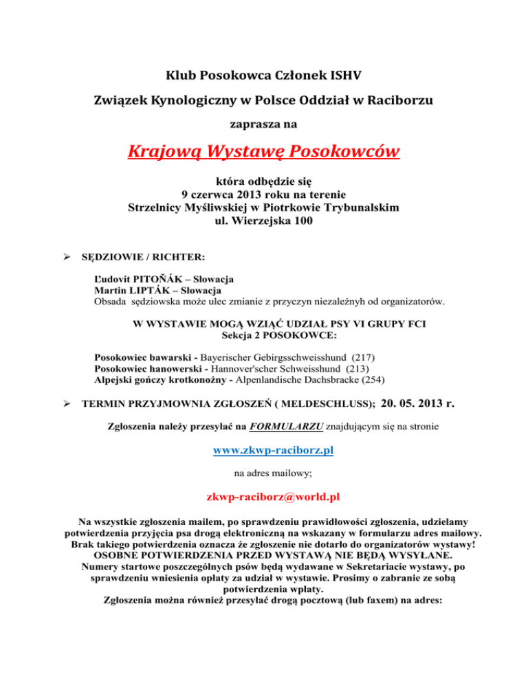 Klub Posokowca Członek ISHV Związek Kynologiczny w Polsce Oddział w Raciborzu zaprasza na Krajową Wystawę Posokowców która odbędzie się 9 czerwca 2013 roku na terenie Strzelnicy Myśliwskiej w Piotrkowie Trybunalskim ul. Wierzejska 100 SĘDZIOWIE / RICHTER: Ľudovít PITOŇÁK – Słowacja Martin LIPTÁK – Słowacja Obsada sędziowska może ulec zmianie z przyczyn niezależnyh od organizatorów. W WYSTAWIE MOGĄ WZIĄĆ UDZIAŁ PSY VI GRUPY FCI Sekcja 2 POSOKOWCE: Posokowiec bawarski - Bayerischer Gebirgsschweisshund (217) Posokowiec hanowerski - Hannover'scher Schweisshund (213) Alpejski gończy krotkonożny - Alpenlandische Dachsbracke (254) TERMIN PRZYJMOWNIA ZGŁOSZEŃ ( MELDESCHLUSS); 20. 05. 2013 r. Zgłoszenia należy przesyłać na FORMULARZU znajdującym się na stronie www.zkwp-raciborz.pl na adres mailowy; [email protected] Na wszystkie zgłoszenia mailem, po sprawdzeniu prawidłowości zgłoszenia, udzielamy potwierdzenia przyjęcia psa drogą elektroniczną na wskazany w formularzu adres mailowy. Brak takiego potwierdzenia oznacza że zgłoszenie nie dotarło do organizatorów wystawy! OSOBNE POTWIERDZENIA PRZED WYSTAWĄ NIE BĘDĄ WYSYŁANE. Numery startowe poszczególnych psów będą wydawane w Sekretariacie wystawy, po sprawdzeniu wniesienia opłaty za udział w wystawie. Prosimy o zabranie ze sobą potwierdzenia wpłaty. Zgłoszenia można również przesyłać drogą pocztową (lub faxem) na adres: Związek Kynologiczny w Polsce – Oddział w Raciborzu ul. Ks. Londzina 49 skr. poczt. 87 47- 400 RACIBÓRZ tel. 32 415 59 44, fax. 32 415 54 90 Wpłat należy dokonywać na konto ZKwP Oddział Racibórz (NIE NA KONTO KLUBU POSOKOWCA); Nr konta: ING BSK S.A. o/Racibórz 62 1050 1328 1000 00 22 4267 44 10 Dla wystawców zagranicznych: NR BIC ( SWIFT) INGBPLPW Nr. konta IBAN PL 62 1050 1328 1000 00 22 4267 4410 OPŁATY / GEBÜHREN: – za pierwszego psa (z katalogiem) – 70,00 zł, – za każdego następnego psa tego samego właściciela ( bez katalogu) – 60,00 zł, – za zgłoszenie do klasy baby, szczeniąt i weteranów ( bez katalogu) – 30,00 zł, Opłata w dniu wystawy wynosi 100 zł niezależnie od klasy i ilości zgłoszonych psów. Każdy zgłoszony pies podlega opłacie bez względu na to, czy zostanie wystawiony czy nie. Opłaty za reklamy w katalogu: – reklamy hodowlane, czarno-białe, 1 strona A5 – 50,00 zł, – reklamy niehodowlane, czarno-białe, 1 strona A5 – 100,00 zł. KLASY WYSTAWOWE / KLASSEN: Psa można zgłosić do jednej z następujących klas: - baby ( Baby - 3-6 Monaten ) - od 3 do 6 miesięcy - szczeniąt ( Jüngsten - 6-9 Monaten) - od 6 do 9 miesięcy - młodzieży ( Jugend - 9-18 Monaten ) - od 9 do 18 miesięcy - pośrednia ( Zwischen - 15-24 Monaten) - od 15 do 24 miesięcy - otwarta ( Offene - ab 15 Monaten ) - powyżej 15 miesięcy - użytkowa ( Gebrauchs - mit Bestätigung ) - z certyfikatem użytkowości - championów ( Champion - mit Championat ) - z tytułem championa - weteranów ( Veteranen - ab 8 Jahren ) - powyżej 8 lat Informacje regulaminowe Na wystawę mogą być zgłoszone psy i suki posiadające rodowody organizacji kynologicznych uznanych przez FCI. Datą decydującą o wieku psa jest dzień wystawienia (np. pies urodzony 15 maja może być wystawiony w klasie szczeniąt najwcześniej 16 listopada). Zgodnie z regulaminem wystawowym przy zgłoszeniach od klasy pośredniej wzwyż wymagane jest podanie numeru rodowodu. Psy z wpisem „rodowód w przygotowaniu” mogą być wystawiane wyłącznie w klasie baby, szczeniąt i młodzieży. W przypadku zgłoszeń do klasy użytkowej lub championów wymagane jest dostarczenie kopii championatu lub certyfikatu użytkowości. Inne dokumenty nie będą honorowane. Zgłoszenia bez tego dokumentu będą automatycznie przesuwane do klasy otwartej. Wszelkie zmiany, w tym zmiany klas możliwe są jedynie w wyjątkowych wypadkach, tylko do dnia zakończenia przyjmowania zgłoszeń, osobiście lub listem poleconym. Po zamknięciu katalogu zmiana klasy nie będzie możliwa. W wystawie mogą wziąć udział jedynie posokowce zamieszczone w katalogu. Organizator zastrzega sobie prawo odmowy przyjęcia zgłoszenia bez podania przyczyny. Tytuły Na wystawie przyznawane będą tytuły i wyróżnienia: - certyfikat na Championa Polski – CWC ( tzw. duże CWC ) - Zwycięzca Młodzieży - Zwycięzca (pies, suka) - Zwycięzca Rasy - Najpiękniejszy Pies Wystawy - Best In Show Konkurencje hodowlane Najlepszy Reproduktor Najlepsza Suka Hodowlana Najlepsza Hodowla Najlepsza Para hodowlana Najlepszy Reproduktor ( minimum trójka potomstwa, z co najmniej dwóch miotów ) Najlepsza Suka Hodowlana ( minimum trójka potomstwa, z co najmniej dwóch miotów ) Najlepsza Hodowla ( minimum trójka psów z tym samym przydomkiem hodowlanym ) Najlepsza Para Hodowlana ( pies i suka będące własnością jednego właściciela ) Reproduktor/Suka hodowlana reprezentowana przez potomstwo – nie musi być zgłoszona na wystawę! DLA WSZYSTKICH UCZESTNIKÓW WYSTAWY KLUB POSOKOWCA CZŁONEK ISHV ZAPEWNIA DODATKOWE ATRAKCJE !!! Dodatkowych informacji na temat wystawy udziela; Wojciech Galwas, tel. 605 850 288. W terminie późniejszym podamy informację o możliwości zakwaterowania. DODATKOWE INFORMACJE W przeddzień Wystawy Posokowców t.j. w dniu 8 czerwca Zarząd Okręgowy PZŁ w Piotrkowie Trybunalskim organizuje Międzynarodowy Konkurs Posokowców. Wszystkie informacje związane z udziałem w konkursie dostępne są na stronie; www.piotrkow.pzlow.pl Również 8 czerwca w godzinach popołudniowych, odbędzie się Walne Zebranie Klubu Posokowca Członka ISHV. Po zakończeniu zebrania tradycyjna biesiada. O godzinie i miejscu zebrania poinformujemy w późniejszym terminie. Wszystkich miłośników posokowców zapraszamy w dniach 8 – 9 czerwca do Piotrkowa Trybunalskiego do czynnego uczestnictwa w Święcie Posokowców.