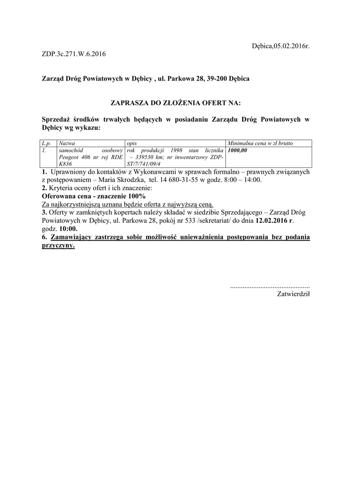 Dębica,05.02.2016r. ZDP.3c.271.W.6.2016 Zarząd Dróg Powiatowych w Dębicy , ul. Parkowa 28, 39-200 Dębica ZAPRASZA DO ZŁOŻENIA OFERT NA: Sprzedaż środków trwałych będących w posiadaniu Zarządu Dróg Powiatowych w Dębicy wg wykazu: L.p. 1. Nazwa opis Minimalna cena w zł brutto samochód osobowy rok produkcji 1998 stan licznika 1000,00 Peugeot 406 nr rej RDE – 339530 km; nr inwentarzowy ZDPK836 ST/7/741/09/4 1. Uprawniony do kontaktów z Wykonawcami w sprawach formalno – prawnych związanych z postępowaniem – Maria Skrodzka, tel. 14 680-31-55 w godz. 8:00 – 14:00. 2. Kryteria oceny ofert i ich znaczenie: Oferowana cena - znaczenie 100% Za najkorzystniejszą uznana będzie oferta z najwyższą ceną. 3. Oferty w zamkniętych kopertach należy składać w siedzibie Sprzedającego – Zarząd Dróg Powiatowych w Dębicy, ul. Parkowa 28, pokój nr 533 /sekretariat/ do dnia 12.02.2016 r. godz. 10:00. 6. Zamawiający zastrzega sobie możliwość unieważnienia postępowania bez podania przyczyny. ............................................. Zatwierdził MATERIAŁY DLA KUPUJĄCYCH ZAMAWIAJĄCY: Zarząd Dróg Powiatowych w Dębicy SIEDZIBA : 39-200 Dębica, ul. Parkowa 28 tel. 146-80-31-55; e-mail: [email protected] ZAMÓWIENIE: Sprzedaż środków trwałych będących w posiadaniu Zarządu Dróg Powiatowych w Dębicy tj.: L.p. Nazwa środków Ilość sztuk trwałych 1. samochód osobowy 1 Peugeot 406 nr rej RDE K836 SPIS TREŚCI: 1. Instrukcja dla kupujących. 2. Wzór formularza oferty. 3. Wzór umowy. INSTRUKCJA DLA OFERENTÓW-KUPUJĄCYCH DOTYCZY POSTĘPOWANIA: „Sprzedaż środka trwałego będącego w posiadaniu Zarządu Dróg Powiatowych w Dębicy” Termin składania ofert – 12.02.2016 r. godz. 10:00. pok. nr 533 1. Zamówienie obejmuje : Sprzedaż środka trwałego będącego w posiadaniu Zarządu Dróg Powiatowych w Dębicy tj.: 2. Zakres sprzedaży obejmuje: L.p. Nazwa opis 1. samochód osobowy rok produkcji 1998 stan licznika Peugeot 406 nr rej – 339530 km; nr inwentarzowy RDE K836 ZDP-ST/7/741/09/4 3. Zakupiony środek trwały w/w powinien być zabrany z placu w godzinach pracy ODM Pilzno ul. Lwowska 66 tj. w dni powszednie w godz. 7:00 – 15:00 w terminie do 7 dni od dnia podpisania umowy i przedłożeniu dowodu zapłaty. 4. Zaleca się, aby każdy oferent przed złożeniem oferty dokonał oceny wizualnej na placu ODM Pilzno, ul. Lwowska 66. 5.W przypadku powstania szkody na rzecz osób trzecich podczas wykonania prac będących przedmiotem umowy Kupujący ponosi odpowiedzialność prawną za zaistniałe szkody łącznie ze skutkami finansowymi. 7. Każdy Oferent może złożyć tylko jedną ofertę podając cenę (brutto) . 8. Oferent przed opracowaniem oferty powinien zapoznać się z wzorem umowy oraz obejrzeć środki trwałe w/w będące przedmiotem postępowania w obecności upoważnionego pracownika Sprzedającego. Możliwość obejrzenia będzie w dni robocze w godz. 7:00- 15:00 po uprzednim telefonicznym uzgodnieniu. 9. Oferta powinna być sporządzona w języku polskim, na maszynopisie lub nieścieralnym atramentem (czytelnie) opieczętowana pieczęcią oferenta i osób/osoby uprawnionych do składania oświadczeń woli w jego imieniu oraz podpisana przez te osoby. Powinna zawierać dane pozwalające zidentyfikować oferenta, jego adres lub siedzibę, dane kontaktowe, oferowaną cenę nabycia brutto. 10. Ofertę należy złożyć w zamkniętej kopercie. Koperta winna być oznaczona napisem oraz posiadać oznaczenie „Nie otwierać przed 12.02.2016 r. godz. 10:10”. 11. Osoby do kontaktów z oferentami: W sprawach formalno-prawnych związanych z materiałami przetargowymi i zawarciem umowy – Pani Maria Skrodzka, w sprawach technicznych Pan Marek Ligęzka tel.146 72 10 10 . 12. Dokumenty wymagane w ofercie: 1) wypełniony i podpisany formularz oferty 2) podpisany wzór umowy Dębica 05.02.2016 r. ZATWIERDZIŁ: wzór formularza oferty ……………………………. (pieczęć Wykonawcy) Nazwa Wykonawcy............................................................................................... Adres : .................................................................................................................. TEL. .........…………................……………………………………………………….. FAX*:………………………………………. e-mail*: ……………………………………. */ dane, na które Zamawiający ma przesyłać korespondencję OFERTA Do Zarządu Dróg Powiatowych w Dębicy 39-200 Dębica, ul. Parkowa 28 Nawiązując do zapytania ofertowego na : 1.Oferujemy zakup ……………………………………………za następującą cenę: Część…. - brutto ............................................ zł, (słownie........................................... ...........................................................................................), 2. Oświadczamy, że dokonaliśmy oględzin , zapoznaliśmy się z treścią instrukcji dla oferentów i wzorem umowy oraz akceptujemy warunki w nich zawarte. 3. Zobowiązujemy się do zapłaty i odbioru ………………będącego przedmiotem Sprzedaży w terminie określonym przez Sprzedającego tj. w ciągu 7 dni od dnia podpisania umowy. 4. Zobowiązujemy się w przypadku sprzedaży nam przedmiotu zamówienia do zapłaty ceny umownej przelewem w ciągu 7 dni od dnia podpisania umowy na podstawie noty obciążeniowej wystawionej przez Sprzedającego na rachunek ZDP. Data ................................ ............................................. (podpis osoby/ osób upoważnionej) wzór umowy UMOWA NR ......... W dniu .............2016 r. pomiędzy Zarządem Dróg Powiatowych w Dębicy, 39-200 Dębica, ul. Parkowa 28, zwanym dalej „Sprzedającym” którego reprezentuje: Pan mgr inż. Jacek Drobot– Dyrektor a ………………………………………………………………………………………………… zw