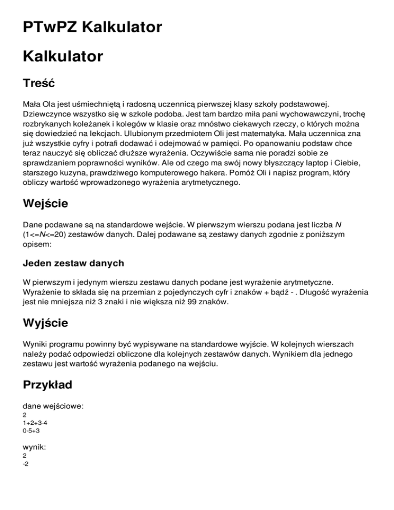 PTwPZ Kalkulator Kalkulator Treść Mała Ola jest uśmiechniętą i radosną uczennicą pierwszej klasy szkoły podstawowej. Dziewczynce wszystko się w szkole podoba. Jest tam bardzo miła pani wychowawczyni, trochę rozbrykanych koleżanek i kolegów w klasie oraz mnóstwo ciekawych rzeczy, o których można się dowiedzieć na lekcjach. Ulubionym przedmiotem Oli jest matematyka. Mała uczennica zna już wszystkie cyfry i potrafi dodawać i odejmować w pamięci. Po opanowaniu podstaw chce teraz nauczyć się obliczać dłuższe wyrażenia. Oczywiście sama nie poradzi sobie ze sprawdzaniem poprawności wyników. Ale od czego ma swój nowy błyszczący laptop i Ciebie, starszego kuzyna, prawdziwego komputerowego hakera. Pomóż Oli i napisz program, który obliczy wartość wprowadzonego wyrażenia arytmetycznego. Wejście Dane podawane są na standardowe wejście. W pierwszym wierszu podana jest liczba N (1<=N<=20) zestawów danych. Dalej podawane są zestawy danych zgodnie z poniższym opisem: Jeden zestaw danych W pierwszym i jedynym wierszu zestawu danych podane jest wyrażenie arytmetyczne. Wyrażenie to składa się na przemian z pojedynczych cyfr i znaków + bądź - . Długość wyrażenia jest nie mniejsza niż 3 znaki i nie większa niż 99 znaków. Wyjście Wyniki programu powinny być wypisywane na standardowe wyjście. W kolejnych wierszach należy podać odpowiedzi obliczone dla kolejnych zestawów danych. Wynikiem dla jednego zestawu jest wartość wyrażenia podanego na wejściu. Przykład dane wejściowe: 2 1+2+3-4 0-5+3 wynik: 2 -2