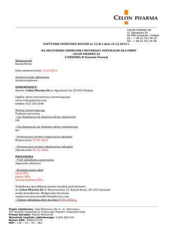 CELON PHARMA SA ul. Ogrodowa 2A 05-092 Łomianki / Kiełpin tel.: + 48 22 751 59 33 fax: + 48 22 751 44 58 ZAPYTANIE OFERTOWE ROCZNE nr 13/K z dnia 15.12.2015 r. Miejscowość Kazuń Nowy NA ODCZYNNIKI CHEMICZNE I MATERIAŁY ZUŻYWALNE DLA FIRMY CELON PHARMA SA Z SIEDZIBĄ W Kazuniu Nowym Data zamieszczenia: 15.12.2015 Zamieszczanie ogłoszenia nieobowiązkowe ZAMAWIAJĄCY: Nazwa: Celon Pharma SA ul. Ogrodowa 2a, 05-092 Kiełpin Ogólny adres internetowy zamawiającego www.celonpharma.com telefon: 022 2011340 Rodzaj zamawiającego Podmiot prywatny · Czy dopuszcza się złożenie oferty częściowej tak · Czy dopuszcza się złożenie oferty wariantowej nie · Orientacyjny termin rozpoczęcia zakupów Rozpoczęcie: 07.01.2016 · Orientacyjny termin zakończenia zakupów Zakończenie 31-12-2016 PROCEDURA · Tryb udzielenia zamówienia Zapytanie ofertowe · Kryteria oceny ofert cena 25% jakość 50% termin dostawy 25% dodatkową specyfikację można uzyskać pod adresem: ul. Celon Pharma SA ul. Marymoncka 15, Kazuń Nowy, 05-152 Czosnów osoby kontaktowe: Małgorzata Duczman [email protected] · Termin składania ofert do dnia 05-01-2016 r. Organ rejestrowy: Sąd Rejonowy dla m. st. Warszawy, XXI Wydział Gospodarczy Krajowego Rejestru Gospodarczego Prezes Zarządu: Maciej Wieczorek Wysokość kapitału zakładowego: 3 000 000 PLN Numer KRS: 0000437778 NIP : 118 – 16 – 42 – 061 CELON PHARMA SA ul. Ogrodowa 2A 05-092 Łomianki / Kiełpin tel.: + 48 22 751 59 33 fax: + 48 22 751 44 58 Kazuń Nowy, dn. 15.12.2015 PRZEDMIOT ZAPYTANIA 13/K LP. 1. NAZWA TOWARU R2A 2. Agar z hydrolizatem kazeiny i soi 3. 4. Bulion z hydrolizatem kazeiny i soi Agar Sabouraud z dekstrozą Agar Sabouraud z chloramfenikolem 5. Bulion Sabouraud 6. Zbuforowany roztwór chlorku sodu o ph 7,0 zgodnie z metodą zharmonizowaną (proszek lub granulat) 7. Zbuforowany roztwór chlorku sodu z peptonem pH=7,0 8. Zbuforowany roztwór chlorku sodu z peptonem pH=7,0 i Tween 80 1g/l 9. Bulion Mossel Organ rejestrowy: Sąd Rejonowy dla m. st. Warszawy, XXI Wydział Gospodarczy Krajowego Rejestru Gospodarczego Prezes Zarządu: Maciej Wieczorek Wysokość kapitału zakładowego: 3 000 000 PLN Numer KRS: 0000437778 NIP : 118 – 16 – 42 – 061 RODZAJ I POJEMNOŚĆ PRODUKTU. płytka 90 mm temp. przechowywania 25°C (pokojowa) płytki Count Tact z neutralizatorami temp. przechowywania 25°C (pokojowa) butelka 200 ml temp. przechowywania 25°C (pokojowa) płytka 90 mm temp. przechowywania 25°C (pokojowa) 100/200 ml temp. przechowywania 25°C (pokojowa) 200 ml temp. przechowywania 25°C (pokojowa) płytka 90 mm temp. przechowywania 25°C (pokojowa) 200 ml temp. przechowywania 25°C (pokojowa) płytka 90 mm temp. przechowywania 25°C (pokojowa) probówka 10 ml temp. przechowywania 25°C (pokojowa) 500 g 1000 g 5000 g 90 ml/100 ml temp. przechowywania 25°C (pokojowa) 500 ml temp. przechowywania 25°C (pokojowa) 1000 ml temp. przechowywania 25°C (pokojowa) 90 ml/100 ml temp. przechowywania 25°C (pokojowa) 500 ml temp. przechowywania 25°C (pokojowa) 100 ml temp. przechowywania 25°C (pokojowa) CELON PHARMA SA ul. Ogrodowa 2A 05-092 Łomianki / Kiełpin tel.: + 48 22 751 59 33 fax: + 48 22 751 44 58 10. Agar z fioletem krystalicznym, czerwienią obojętną, żółcią i glukozą płytka 90 mm temp. przechowywania 25°C (pokojowa) płytki Count Tact 11. Bulion MacConkey 12. Agar MacConkey 13. Bulion Rappaport Vassiliadis 14. Agar z ksylozą, lizyną i deoksycholanem 15. Agar z cetrymidem 16. 17. Agar z certymidem+fucidyna+cefaleksyna Agar z mannitolem i chlorkiem sodu 18. Neutralny rozcieńczalnik z mięsnym lub kazeinowym peptonem o pH 7,1±0,2 do badania jałowości 19. 21. 22. Płynne podłoże tioglikolanowe do badania jałowości Płynne podłoże kazeinowo-sojowe do badania jałowości Columbia agar +5% SH.BL. Sterisart NF 23. 24. 25. 26. 27. 28. 29. 30. 31. 32. 33. 34. Oksydaza Katalaza Koagulaza Slidex Staph plus Slidex Staph Kit Test Api 20E Api 20 NE NaCL 0,85% MEDIUM 5ml ZN Api 20 E Reganet Kit TDA JAMES 100 ml temp. przechowywania 25°C (pokojowa) płytka 90 mm temp. przechowywania 25°C (pokojowa) 10 ml temp. przechowywania 25°C (pokojowa) płytka 90 mm temp. przechowywania 25°C (pokojowa) płytka 90 mm temp. przechowywania 25°C (pokojowa) płytki Count Tact płytka 90 mm płytka 90 mm temp. przechowywania 25°C (pokojowa) płytki Count Tact 300 ml temp. przechowywania 25°C (pokojowa) 600 ml temp. przechowywania 25°C (pokojowa) 1000 ml temp. przechowywania 25°C (pokojowa) 100 ml temp. przechowywania 25°C (pokojowa) 100 ml temp. przechowywania 25°C (pokojowa) płytki 90 mm kanistry wraz z igłą i membraną filtracyjną paski butelka ampułka testy testy testy testy odczynniki odczynnki odczynniki odczynniki odczynniki 20. Organ rejestrowy: Sąd Rejonowy dla m. st. Warszawy, XXI Wydział Gospodarczy Krajowego Rejestru Gospodarczego Prezes Zarządu: Maciej Wieczorek Wysokość kapitału zakładowego: 3 000 000 PLN Numer KRS: 0000437778 NIP : 118 – 16 – 42 – 061 CELON PHARMA SA ul. Ogrodowa 2A 05-092 Łomianki / Kiełpin tel.: + 48 22 751 59 33 fax: + 48 22 751 44 58 35. 36. 37. 38. 39. 40. 41. 42. 43. 44. 45. 46. 47. 48. 49. 50. 51. 52. 53. 54. 55. 56. 57. 58. 59. 60. 61. 62. 63. 64. 65. 66. 67. 68. 69. 70. 71. 72. 73. VP1+ VP2 Test Api Staph NIT1+NIT2 ZYM A ZYM B Api Suspension Medium 5 ml Sterylne filtry Sterylne leje Sterylne ezy Niesterylne końcówki do pipet Niesterylne końcówki do pipet Eppendorf Sterylne pojemniki Sterylne pojemniki Sterylne płytki Petriego z wentylacją Worki do sterylizacji w temp. 121°c Zestaw odczynników do barwienia Grama Olej mineralny Olejek immersyjny do mikroskopu Sterylne głaszczki w kształcie litery l, Test Bowie-Dick Taśma wskaźnikowa do sterylizacji Szkiełka mikroskopowe podstawowe Pipety Pasteura sterylne Wymazówki sterylne z płynem transportowym Wskaźniki biologiczne do kontroli procesu sterylizacji materiałów stałych Wskaźniki biologiczne do kontrol