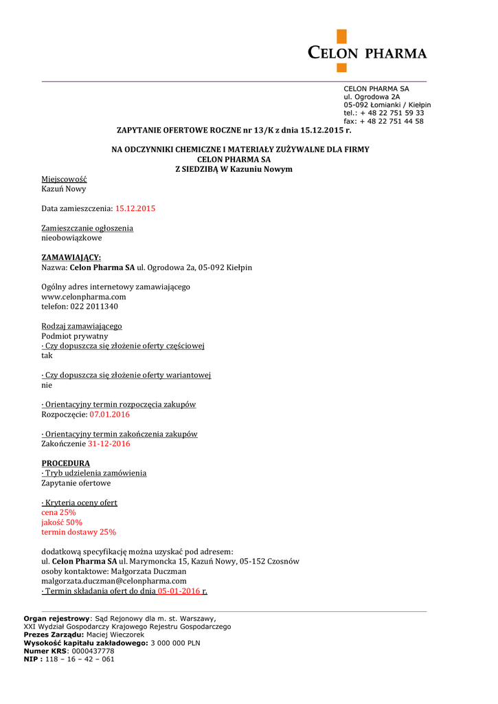 ZAPYTANIE OFERTOWE ROCZNE nr 13/K z dnia