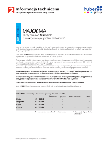 2 Informacja techniczna 20.23 | 09.2009 | Druk offsetowy | Farby skalowe Farby skalowe !nkredible o maxxymalnym profilu zastosowań Stały wzrost tempa produkcji a także ciągły rozwój maszyn drukarskich powodują zmianę wymagań stawianych farbom. Coraz częściej również dominują zlecenia o niskich nakładach i wysokich wymaganiach dotyczących jakości druku. Farby serii MAXXIMA są jedynymi, które charakteryzują się najszerszym spektrum zastosowań i zapewniają uzyskiwanie optymalnych efektów drukowania w każdej sytuacji. Zastosowane w farbie pigmenty o najwyższym możliwym stopniu transparentności i czystości zapewniają zgodność z wymaganiami normy ISO 2846-1 oraz wymogami barwometrycznymi normy ISO 12647-2. Potwierdza to certyfikat Instytutu FOGRA nr 23328. Natomiast najwyższej jakości, wyselekcjonowane spoiwa zapewniają stabilny, bardzo niski zakres przyrostu punktów rastrowych farb barwnych i neutralny balans szarości, w trakcie całego procesu drukowania. Seria MAXXIMA to farby szybkoschnące, zapewniające wysoką odporność na obciążenia mechaniczne druków i przeznaczone są do drukowania na różnego rodzaju podłożach. Niezwykła intensywność i czystość odcieni, w połączeniu z idealną charakterystyką przyjmowania farby przez farbę zapewniają najwyższy możliwy efekt kontrastowości wydruku. Farby gwarantują również maxxymalną stabilność podczas drukowania całego nakładu. Seria MAXXIMA produkowana jest w wersji fresh, nie zasychającej na wałkach i w kałamarzu. Parametry odporności wg normy ISO 2836 / 12 040 Światło WS Spirytus Rozpuszczalniki Alkalia Żółta 41 F 50 MX 5 + + +* Magenta 42 F 50 MX 5 + + –* Cyjan 43 F 50 MX 8 + + + Czarna 49 F 50 MX 8 + + + F – nie zasycha na wałkach i w kałamarzu Informacja techniczna hubergroup . 20.23 . Strona 1/2 * nie nadaje się do druku plakatów Właściwości specjalne • • • • • • • • • Maxxymalny zakres zastosowań: - optymalna charakterystyka wsiąkania w podłoże, - optymalna odporność na ścieranie, - optymalny połysk, - optymalna podatność do druku z odwracaniem. Najwyższe bezpieczeństwo procesu drukowania. Doskonała stabilność podczas drukowania nakładu. Minimalna ilość makulatury początkowej. Kolorystyka zgodna z normami DIN ISO 2846-1 oraz ISO 12647-2. Możliwość drukowania bez alkoholu przy zastosowaniu dodatku SUBSTYFIX®-AF. Natychmiastowe ustalanie się stabilnej równowagi farbowo-wodnej. Dobre zachowanie druków w warunkach stosu przy minimalnym proszkowaniu. Neutralny balans szarości. Zakres stosowań Farby skalowe serii MAXXIMA są idealne do produkcji szerokiego spektrum druków na bardzo wielu rodzajach podłoży. Spełniają wszelkie wymagania stawiane najlepszym farbom drukowym, zapewniają bardzo niski przyrost punktów rastrowych i charakteryzują się wysoką tolerancją na środek zwilżający. Środki pomocnicze Farby skalowe serii MAXXIMA dostarczane są w wersji gotowej do druku. Środki pomocnicze należy stosować tylko w wyjątkowych sytuacjach, aby dostosować farby do specyficznych warunków technologicznych. Powinny być to środki, których receptura dostosowana jest do wysokojakościowego spoiwa, a mianowicie: - w wypadku podłoży wrażliwych na zrywanie powierzchni w celu obniżenia ciągliwości - olej Drucköl 10 T 1405, -dla przyspieszenia schnięcia oksydacyjnego - suszka MONSUN 10 T 7265. Oznakowania Zgodnie z przepisami o niebezpiecznych substancjach - nie są wymagane Zgodnie z przepisami ppoż. - nie są wymagane Pozostałe informacje zawiera karta charakterystyki preparatu Opakowania Puszka o poj. 2,5 kg pakowana próżniowo Duże opakowania Tuby o poj. 2,0 kg Wskazówka dotycząca drukowania opakowań spożywczych Farby tej serii nie nadają się do produkcji opakowań na środki spożywcze, przy których podłoże wchodzi w bezpośredni kontakt z produktem lub nie są zastosowane odpowiednie warstwy barierowe. W takim przypadku zalecamy stosowanie farb serii MGA®, które są recepturowane w sposób ograniczający migrację niepożądanych substancji. Dalsze wskazówki dotyczące druku opakowań środków spożywczych i używek można znaleźć w biuletynie Związku Producentów Farb Drukarskich „Farby do zadruku opakowań spożywczych”, naszej informacji „Wskazówki dotyczące stosowania konwencjonalnych farb offsetowych do produkcji opakowań środków spożywczych” lub też naszej stronie internetowej www.futurepack.de Dalsze informacje i porady można uzyskać pod internetowym adresem: www.mhp.com.pl Niniejsza informacja techniczna odpowiada aktualnemu stanowi naszej wiedzy w tym temacie i spełnia tylko funkcję informacyjną i doradczą. Z tego względu nie może być podstawą do roszczeń prawnych. Zastrzeżone są zmiany wynikające z postępu technicznego. Informacja techniczna hubergroup . 20.23 . Strona 2/2