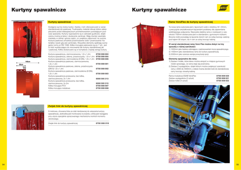 Kurtyny spawalnicze Kurtyny spawalnicze Kurtyny spawalnicze Rama VersiFlex do kurtyny spawalniczej Dostępne są trzy kolory kurtyn. Każda z nich oferowana jest w wersji standardowej lub paskowej. Trudnopalny materiał oferuje dobre zabezpieczenie przed niebezpiecznym promieniowaniem powstającym podczas spawania. Kurtyny wyposażone są w zatrzaski guzikowe, dzięki czemu można je łatwo i skutecznie zamknąć. Mają również zawinięte mankiety w dolnej i górnej części, co zwiększa odporność na zużycie. Kurtyna paskowa umożliwia przechodzenie osób i przenoszenie materiałów nawet gdy jest zamknięta. Wszystkie elementy spełniają wymagania normy pr EN 1598. Kółka mocujące pakowane są po 7 szt., jest to ilość wystarczająca do mocowania tak kurtyny standardowej jak i paskowej. Kółka dostarczane są w komplecie z każdą wersją kurtyny. Ta nowa rama wykonana jest z łączonych rurek o średnicy 32 i 22mm, z precyzyjnie ukształtowanymi łączeniami podstawy dla zapewniania solidniejszego połączenia. Niezwykle stabilna rama z rozstawem o szerokości 700mm dostarczana jest w standardzie z gumowymi nóżkami. Boczne nóżki pozwalają na łączenie dwóch ram ze sobą tworząc zasłonę pod kątem 90 stopni, lub 4 ram ze sobą tworząc kabinę. Kurtyna spawalnicza, ciemnoczerwona, 1,8 x 1,4m Kurtyna spawalnicza, zielona, przezroczysta, 1,8 x 1,4m Kurtyna spawalnicza, ciemnozielona (9 DIN), 1,8 x 1,4m Kurtyna spawalnicza paskowa, ciemnoczerwona, 1,8 x 1,4m Kurtyna spawalnicza paskowa, zielona, przeźroczysta (DIN 6) 1,8 x 1,4m Kurtyna spawalnicza paskowa, ciemnozielona (9 DIN), 1,8 x 1,4m Kurtyna spawalnicza przesuwna, bez kółka, ciemnoczerwona, 2x 1,4m Kurtyna spawalnicza przesuwna, bez kółka, ciemnoczerwona, 2x 2m Kółka mocujące PCV Kółka mocujące metalowe 0700 008 004 0700 008 005 0700 008 006 0700 008 001 0700 008 002 W wersji standardowej ramę Versi Flex można złożyć na trzy sposoby o różnej szerokości: 1) 1000mm jako bariera odcinająca z zastosowaniem koca spawalniczego. 2) 1400mm jako standardowa rama do kurtyny spawalniczej. 3) 2000mm jako szersza wersja powyższej opcji. Elementy opcjonalne dla ramy: 1) Zestaw 4 kółek, które łatwo można wkręcić w miejsce gumowych nóżek sprawiając, że rama staje się przenośna. 2) Zestaw 2 wysięgników, dzięki którym można zwiększyć szerokość ramy z 2000 do 4000mm, a także można dorobić boki do standardowej ramy tworząc otwartą kabinę. 0700 008 003 0000 595 313 Rama modułowa ESAB VersiFlex Zestaw wysięgników (2 sztuki) Zestaw kółek (4 sztuki) 0700 008 020 0700 008 021 0700 008 022 0000 595 315 0700 008 007 0700 008 008 Zwijak linki do kurtyny spawalniczej 8-metrowa, chowana linka ze stali nierdzewnej do wieszania kurtyny spawalniczej. Jednostka jest montowana na ścianie, a linka jest naciągana przy użyciu specjalnie opracowanego mechanizmu kontroli momentu obrotowego. Zwijak linki do kurtyny spawalniczej 54 0700 008 018 55 Kurtyny spawalnicze Kurtyny spawalnicze Kurtyny spawalnicze Rama VersiFlex do kurtyny spawalniczej Dostępne są trzy kolory kurtyn. Każda z nich oferowana jest w wersji standardowej lub paskowej. Trudnopalny materiał oferuje dobre zabezpieczenie przed niebezpiecznym promieniowaniem powstającym podczas spawania. Kurtyny wyposażone są w zatrzaski guzikowe, dzięki czemu można je łatwo i skutecznie zamknąć. Mają również zawinięte mankiety w dolnej i górnej części, co zwiększa odporność na zużycie. Kurtyna paskowa umożliwia przechodzenie osób i przenoszenie materiałów nawet gdy jest zamknięta. Wszystkie elementy spełniają wymagania normy pr EN 1598. Kółka mocujące pakowane są po 7 szt., jest to ilość wystarczająca do mocowania tak kurtyny standardowej jak i paskowej. Kółka dostarczane są w komplecie z każdą wersją kurtyny. Ta nowa rama wykonana jest z łączonych rurek o średnicy 32 i 22mm, z precyzyjnie ukształtowanymi łączeniami podstawy dla zapewniania solidniejszego połączenia. Niezwykle stabilna rama z rozstawem o szerokości 700mm dostarczana jest w standardzie z gumowymi nóżkami. Boczne nóżki pozwalają na łączenie dwóch ram ze sobą tworząc zasłonę pod kątem 90 stopni, lub 4 ram ze sobą tworząc kabinę. Kurtyna spawalnicza, ciemnoczerwona, 1,8 x 1,4m Kurtyna spawalnicza, zielona, przezroczysta, 1,8 x 1,4m Kurtyna spawalnicza, ciemnozielona (9 DIN), 1,8 x 1,4m Kurtyna spawalnicza paskowa, ciemnoczerwona, 1,8 x 1,4m Kurtyna spawalnicza paskowa, zielona, przeźroczysta (DIN 6) 1,8 x 1,4m Kurtyna spawalnicza paskowa, ciemnozielona (9 DIN), 1,8 x 1,4m Kurtyna spawalnicza przesuwna, bez kółka, ciemnoczerwona, 2x 1,4m Kurtyna spawalnicza przesuwna, bez kółka, ciemnoczerwona, 2x 2m Kółka mocujące PCV Kółka mocujące metalowe 0700 008 004 0700 008 005 0700 008 006 0700 008 001 0700 008 002 W wersji standardowej ramę Versi Flex można złożyć na trzy sposoby o różnej szerokości: 1) 1000mm jako bariera odcinająca z zastosowaniem koca spawalniczego. 2) 1400mm jako standardowa rama do kurtyny spawalniczej. 3) 2000mm jako szersza wersja powyższej opcji. Elementy opcjonalne dla ramy: 1) Zestaw 4 kółek, które łatwo można wkręcić w miejsce gumowych nóżek sprawiając, że rama staje się przenośna. 2) Zestaw 2 wysięgników, dzięki którym można zwiększyć szerokość ramy z 2000 do 4000mm, a także można dorobić boki do standardowej ramy tworząc otwartą kabinę. 0700 008 003 0000 595 313 Rama modułowa ESAB VersiFlex Zestaw wysięgników (2 sztuki) Zestaw kółek (4 sztuki) 0700 008 020 0700 008 021 0700 008 022 0000 595 315 0700 008 007 0700 008 008 Zwijak linki do kurtyny spawalniczej 8-metrowa, chowana linka ze stali nierdzewnej do wieszania kurtyny spawalniczej. Jednostka jest montowana na ścianie, a linka jest naciągana przy użyciu specjalnie opracowanego mechanizmu kontroli momentu obrotowego. Zwijak linki do kurtyny spawalniczej 54 0700 008 018 55