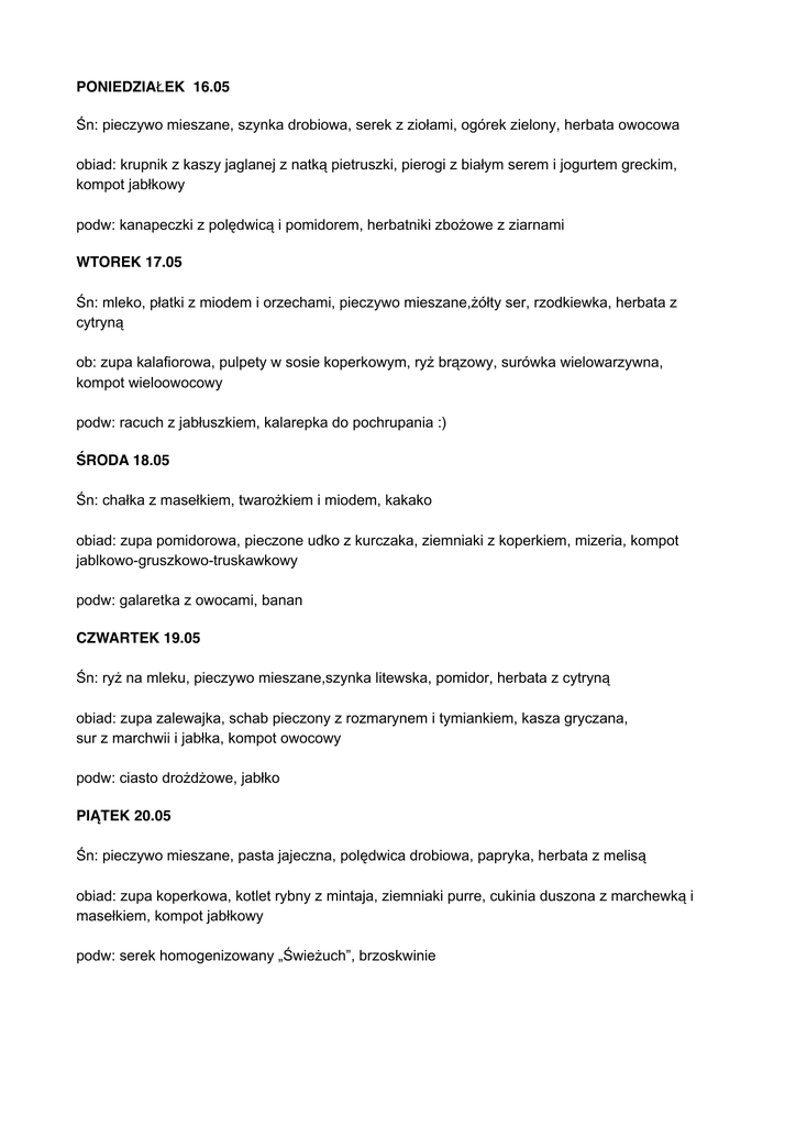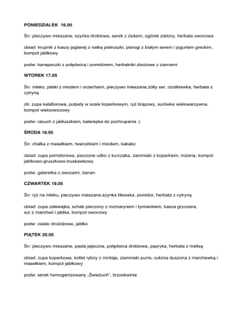 PONIEDZIAŁEK 16.05 Śn: pieczywo mieszane, szynka drobiowa, serek z ziołami, ogórek zielony, herbata owocowa obiad: krupnik z kaszy jaglanej z natką pietruszki, pierogi z białym serem i jogurtem greckim, kompot jabłkowy podw: kanapeczki z polędwicą i pomidorem, herbatniki zbożowe z ziarnami WTOREK 17.05 Śn: mleko, płatki z miodem i orzechami, pieczywo mieszane,żółty ser, rzodkiewka, herbata z cytryną ob: zupa kalafiorowa, pulpety w sosie koperkowym, ryż brązowy, surówka wielowarzywna, kompot wieloowocowy podw: racuch z jabłuszkiem, kalarepka do pochrupania :) ŚRODA 18.05 Śn: chałka z masełkiem, twarożkiem i miodem, kakako obiad: zupa pomidorowa, pieczone udko z kurczaka, ziemniaki z koperkiem, mizeria, kompot jablkowo-gruszkowo-truskawkowy podw: galaretka z owocami, banan CZWARTEK 19.05 Śn: ryż na mleku, pieczywo mieszane,szynka litewska, pomidor, herbata z cytryną obiad: zupa zalewajka, schab pieczony z rozmarynem i tymiankiem, kasza gryczana, sur z marchwii i jabłka, kompot owocowy podw: ciasto drożdżowe, jabłko PIĄTEK 20.05 Śn: pieczywo mieszane, pasta jajeczna, polędwica drobiowa, papryka, herbata z melisą obiad: zupa koperkowa, kotlet rybny z mintaja, ziemniaki purre, cukinia duszona z marchewką i masełkiem, kompot jabłkowy podw: serek homogenizowany „Świeżuch”, brzoskwinie