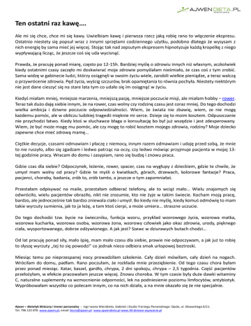 Ten ostatni raz kawę…. Ale mi się chce, chce mi się kawy. Uwielbiam kawę i pierwsza rzecz jaką robię rano to włączenie ekspresu. Ostatnio niestety się popsuł wraz z innymi sprzętami codziennego użytku, podobno dlatego że wysysam z nich energię by sama mieć jej więcej. Stojąc tak nad zepsutym ekspresem hipnotyzuje każdą kropelkę z niego wypływającą licząc, że jeszcze coś się uda wycisnąć. Prawda, że pracuję ponad miarę, często po 12-15h. Bardziej myślę o zdrowiu innych niż własnym, aczkolwiek kiedy ostatnimi czasy zaczęło mi doskwierać moje zdrowie pomyślałam nieśmiało, że czas coś z tym zrobić. Sama widzę w gabinecie ludzi, którzy osiągnęli w swoim życiu wiele, zarobili wielkie pieniądze, a teraz walczą o przywrócenie zdrowia. Pęd życia, wyścig szczurów, brak opamiętania to równia pochyła. Niestety niektórym nie jest dane cieszyć się na stare lata tym co udało się im osiągnąć w życiu. Kiedyś miałam mniej, mniejsze marzenia, mniejszą pasję, mniejsze poczucie misji, ale miałam hobby – rower. Teraz tak dużo daję siebie innym, że na rower, czas wolny czy rodzinę czasu jest coraz mniej. Do tego dochodzi wielka ambicja i dziwne poczucie odpowiedzialności. Wiem, że świata nie zbawię, wiem, ze nie mogę każdemu pomóc, ale w obliczu ludzkiej tragedii mięknie mi serce. Dzieje się to moim kosztem. Odpuszczanie nie przychodzi łatwo. Kiedy ktoś w słuchawce błaga o konsultację bo był już wszędzie i jest zdesperowany. Wiem, że być może mogę mu pomóc, ale czy mogę to robić kosztem mojego zdrowia, rodziny? Moje dziecko zapewne chce mieć zdrową mamę… Ciężkie decyzje, czasami odmawiam i płaczę z niemocy, innym razem odmawiam i udaję przed sobą, że mnie to nie ruszyło, albo się zgadzam i ledwo patrząc na oczy, czy ledwo mówiąc przyjmuje pacjenta w mojej 13tej godzinie pracy. Wracam do domu i zasypiam, rano się budzę i znowu praca. Gdzie czas dla siebie? Odpoczynek, leżenie, rower, spacer, czas na wygłupy z dzieckiem, gdzie te chwile, że umysł mam wolny od pracy? Gdzie te myśli o kwiatkach, górach, drzewach, kolorowe fantazje? Praca, pacjenci, choroby, badania, zrób to, zrób tamto, a jeszcze o tym zapomniałaś. Przestałam odpisywać na maile, przestałam odbierać telefony, ale to wciąż mało… Wielu znajomych się odwróciło, wielu pacjentów obraziło, nikt nie zrozumie, kto nie żyje w takim świecie. Kocham moją pracę, bardzo, ale jednocześnie tak bardzo zniewala ciało i umysł. Bo kiedy nie myślę, kiedy komuś odmówię to mam takie wyrzuty sumienia, jak to ja leżę, a tam ktoś cierpi, a może umiera… straszne uczucie. Do tego dochodzi tzw. bycie na świeczniku, funkcja wzoru, przykład wzorowego życia, wzorowa matka, wzorowa kucharka, wzorowa osoba, wzorowa żona, wzorowy człowiek jako okaz zdrowia, urody, pięknego ciała, wysportowanego, dobrze odżywionego. A jak jest? Szewc w dziurawych butach chodzi… Od lat pracuję ponad siły, mało śpię, mam mało czasu dla siebie, prawie nie odpoczywam, a jak już to robię to słyszę wyrzuty „tej to się powodzi” co jednak nieco odbiera smak urlopowej beztroski. Miesiąc temu po nieprzespanej nocy prowadziłam szkolenie. Cały dzień mówiłam, cały dzień na nogach. Wróciłam do domu, padłam. Rano poczułam, że rozkłada mnie przeziębienie. Od tego czasu chora byłam przez ponad miesiąc. Katar, kaszel, gardło, chrypa, 2 dni spokoju, chrypa – 2,5 tygodnia. Część pacjentów przełożyłam, w efekcie pracowałam jeszcze więcej. Znowu choroba. W tym czasie były duże dawki witaminy C, naturalne suplementy na wzmocnienie odporności, lek na podniesienie poziomu limfocytów, antybiotyk. Wypróbowałam wszystko co polecam innym, co na nich działa, a na mnie okazało się że nie specjalnie. Ajwen – dietetyk kliniczny i trener personalny - mgr Iwona Wierzbicka. Gabinet i Studio Treningu Personalnego: Opole, ul. Słowackiego 6/11. Tel. 796 122 070. www.ajwen.pl, email: [email protected]. www.ajwendieta.pl www.30-dniowe-wyzwanie.pl Ostatecznie jestem zdrowa, ale chora… Wciąż mam problem z głosem, mówienie powoduje zawroty głowy i ogromny wysiłek. Po wizycie u foniatry diagnoza: górny refluks, podrażnienie okolic strun głosowych, przerost mięśni (źle mówię), zbyt płytki oddech, zbytnie napięcie okolic szyi i barków, problem ze śluzówką, przekrwienie, wyjście nerwów na powierzchnię. Takie otwarte wrota, gdzie nie chroni je śluzówka powodują, że stale łapię infekcje. Mówiąc w uproszczeniu – wiem co jest nie tak… Nie będę udawała przed sobą, że nie wiem o co chodzi i skąd to się wzięło. Po pierwsze: Nigdy nikt mi nie powiedział, że jak się dużo mówi to trzeba się nauczyć na nowo mówić – lekcje oddychania, lekcje z emisji głosu. Picie siemienia lnianego, zakaz chrząkania. Po drugie: Zmęczony i przeciążony organizm, bez chwili wytchnienia i czasu na regenerację nie zareaguje na jakieś tam witaminy czy inne suplementy. Witamina C walczy ze stanem zapalnym, ale ze zmęczeniem – może tylko sen i relaks. Po trzecie: jestem po dwóch operacjach żołądka, miałam refluks, zgagę, astmę, wzdęcia. Operacja powinna zabezpieczyć przełyk przed działaniem refluksu, a jak widać tego nie zrobiła. Nie ma co zwalać, nie ma co patrzeć wstecz. Dla zdrowia odstawiłam już zboża, nabiał… Obecna moja dieta to dla niektórych hardcore, ale tylko to trzyma mnie przy zdrowiu. Teraz się okazało, że jednak to wciąż za mało. Powinnam jeszcze zrezygnować z kawy, smażenia, późnego jedzenia, żeby nie kłaść się z pełnym żołądkiem. Czasami myślę JAK BARDZO TRZEBA SIĘ KOCHAĆ ŻEBY ZREZYGNOWAĆ Z RZECZY, KTÓRE SIĘ KOCHA!!! Jak często słyszę narzekania moich pacjentów czy czytelników w internecie, jak żyć, to co ja mam jeść, a jak dużo jest obelg pod moim adresem, że wymyślam, że jestem nienormalna, tak się nie da