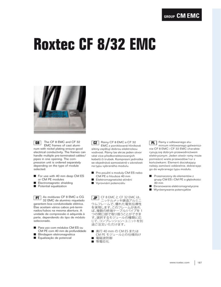 GROUP CM EMC Roxtec CF 8/32 EMC The CF 8 EMC and CF 32 EMC frames of cast aluminum with nickel plating ensure good electrical conductivity. The frames can handle multiple pre-terminated cables/ pipes in one opening. The compression unit is ordered separately depending on the type of module selected. GB ■ For use with 40 mm deep CM ES or CM PE modules ■ Electromagnetic shielding ■ Potential equalization As molduras CF 8 EMC e CG 32 EMC de alumínio niquelado garantem boa condutividade elétrica. Elas aceitam vários cabos pré-terminados/tubos na mesma abertura. A unidade de compressão é adquirida à parte, dependendo do tipo de módulo selecionado. PT ■ Para uso com módulos CM ES ou CM PE com 40 mm de profundidade ■ Blindagem eletromagnética ■ Equalização de potencial Rámy CF 8 EMC a CF 32 EMC z poniklované hliníkové slitiny zajišťují dobrou elektrickou vodivost. Rámy lze skrze jeden otvor vést více předkonektorovaných kabelů či trubek. Kompresní jednotka se objednává samostatně v závislosti na typu vybraného modulu. CZ ■ Pro použití s moduly CM ES nebo CM PE o hloubce 40 mm ■ Elektromagnetické stínění ■ Vyrovnání potenciálu Ramy z odlewanego aluminium niklowanego galwanicznie CF 8 EMC i CF 32 EMC charakteryzują się dobrym przewodnictwem elektrycznym. Jeden otwór ramy może pomieścić wiele przewodów/rur z końcówkami. Element dociskający należy zamówić oddzielnie, dobierając go do wybranego typu modułu. PL ■ Przeznaczony do elementów z grupy CM ES i CM PE o głębokości 40 mm ■ Ekranowanie elektromagnetyczne ■ Wyrównywanie potencjałów CF 8 EMC と CF 32 EMC は、 ニッケルメッキ鋳造アルミニ ウムフレームで、 優れた電気伝導性 を実現します。 このフレームがあれ ば、 複数の終端ケーブル/パイプを 1 つの開口部で取り扱うことができま す。 選択するモジュールの種類に応 じて、 コンプレッション・ユニットを別 途ご注文いただけます。 JP ■ 奥行 40 mm の CM ES または CM PE モジュールとの仕様向け ■ 電磁波防御 ■ 等電位化 www.roxtec.com 187 GROUP CM EMC CF 8/CF 32 frame EMC CF 8 / CF 32 rám, EMC ❱ Rama CF 8/CF 32 EMC ❱ Moldura CF 8 /CF 32, ECM ❱ CF 8/CF 32フレーム EMC Note: The compression unit is ordered separately. CF 8 EMC CF 32 EMC RATINGS Rama Wymiary zewnętrzne HxW (mm) HxW (in) フレーム Dimensões externas HxW (mm) HxW (pol) 外形寸法 HxW (mm) HxW (インチ) Frame External dimensions HxW (mm) HxW (in) Moldura Váha (kg) (lb) Označení výrobku (lb) Kod art. (lb) Nº art. Ciężar (kg) Peso (kg) 重量 (kg) (ポンド) 品番 Weight (kg) (lb) Art No. CF 8 EMC* 140 x 75 5.512 x 2.952 0.6 1.213 ECF0000080035 CF 32 EMC* 230 x 130 9.055 x 5.118 1.4 3.086 ECF0000320035 C Compression unit ES AISI 316 30 x 40 1.181 x 1.575 0.2 0.340 ECC0001001123 C Compression unit IP/PE AISI 316 30 x 40 1.181 x 1.575 0.2 0.340 CC00001001023 * Wall thickness Tloušťka stěny Grubość ścian Max 4 mm Max. 4 mm Maks. 4 mm Espessura da parede Máx 4 mm 壁の厚み 最大 4 mm CF 8/32 frame EMC, technical information/packing space CF 32 CF 8/32 Pos (mm) (in) e CF 8 h1 h2 80 3.150 160 6.299 w 40 1.575 e 30 1.181 For dimensions please see page 93. H GB Vnější rozměry HxW (mm) HxW (in) h2 JP Rám H PT UL/NEMA: 4, 4X, 12, 13 e PL C Compression unit IP/PE AISI 316 h1 CZ IP: 67 C Compression unit ES AISI 316 w w w W W 188 www.roxtec.com Note: All dimensions are nominal values Poznámka: všechny uvedené rozměry jsou v nominální hodnotě Uwaga: Wszystkie podane wymiary mają wartości nominalne Nota: Todas as dimensões são valores nominais 注:寸法はすべて公称値です。 CM CF 8 and 32 frames, holecut 10 mm (0.394") 15 mm (0.591") Rám CF 8/32, vyříznutí otvorů Rama CF 8/32, otwór pod montaż Moldura CF 8/32, corte do orifício CF 8/32フレーム取付孔 CF 32 216 mm (8.504") 127 mm (5.000") CF 8 10 mm (0.394") 10 mm (0.394") 61 mm (2.402") 10 mm (0.394") 15 mm (0.591") Templates, holecut pattern GROUP 15 mm (0.591") 110 mm (4.331") 15 mm (0.591") Area that must be unpainted (conductive) for EMC installations. Oblast, která musí být při instalacích EMC bez nátěru (vodivá) Obszar, który musi pozostać niepomalowany (przewodzić) w przypadku instalacji EMC. A região tem de estar sem pintura (condutora) para instalações EMC. EMC 設置において塗装を避けるべき (導電性の) 場所 Not scale 1:1 242 www.roxtec.com