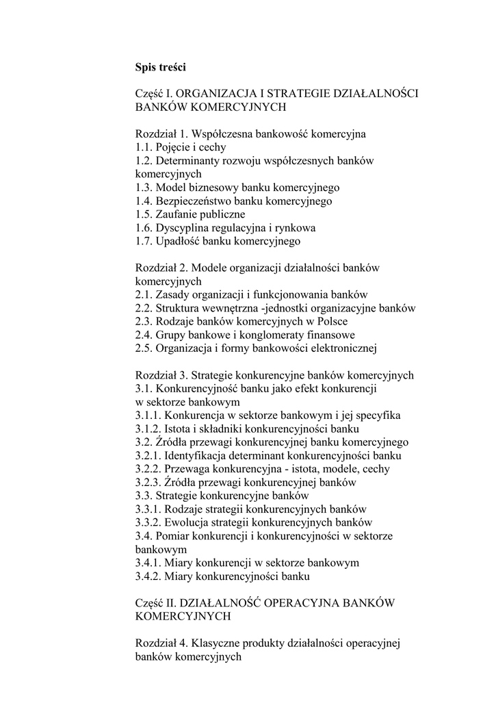 Spis treści Część I. ORGANIZACJA I STRATEGIE DZIAŁALNOŚCI BANKÓW KOMERCYJNYCH Rozdział 1. Współczesna bankowość komercyjna 1.1. Pojęcie i cechy 1.2. Determinanty rozwoju współczesnych banków komercyjnych 1.3. Model biznesowy banku komercyjnego 1.4. Bezpieczeństwo banku komercyjnego 1.5. Zaufanie publiczne 1.6. Dyscyplina regulacyjna i rynkowa 1.7. Upadłość banku komercyjnego Rozdział 2. Modele organizacji działalności banków komercyjnych 2.1. Zasady organizacji i funkcjonowania banków 2.2. Struktura wewnętrzna -jednostki organizacyjne banków 2.3. Rodzaje banków komercyjnych w Polsce 2.4. Grupy bankowe i konglomeraty finansowe 2.5. Organizacja i formy bankowości elektronicznej Rozdział 3. Strategie konkurencyjne banków komercyjnych 3.1. Konkurencyjność banku jako efekt konkurencji w sektorze bankowym 3.1.1. Konkurencja w sektorze bankowym i jej specyfika 3.1.2. Istota i składniki konkurencyjności banku 3.2. Źródła przewagi konkurencyjnej banku komercyjnego 3.2.1. Identyfikacja determinant konkurencyjności banku 3.2.2. Przewaga konkurencyjna - istota, modele, cechy 3.2.3. Źródła przewagi konkurencyjnej banków 3.3. Strategie konkurencyjne banków 3.3.1. Rodzaje strategii konkurencyjnych banków 3.3.2. Ewolucja strategii konkurencyjnych banków 3.4. Pomiar konkurencji i konkurencyjności w sektorze bankowym 3.4.1. Miary konkurencji w sektorze bankowym 3.4.2. Miary konkurencyjności banku Część II. DZIAŁALNOŚĆ OPERACYJNA BANKÓW KOMERCYJNYCH Rozdział 4. Klasyczne produkty działalności operacyjnej banków komercyjnych 4.1. Kredyty bankowe - tradycyjne źródło finansowania potrzeb klientów 4.2. Bankowe formy wykupu wierzytelności pieniężnych 4.3. Pozabilansowe operacje przejęcia ryzyka 4.4. Produkty działalności depozytowej banków 4.5. Bank jako uczestnik międzybankowych rozliczeń bezgotówkowych 4.6. Operacje handlowe banku Rozdział 5. Działalność inwestycyjna w bankach komercyjnych 5.1. Czynności inwestycyjne banków komercyjnych podstawowe zagadnienia 5.1.1. Pojęcie i podział czynności inwestycyjnych banków komercyjnych 5.1.2. Nadrzędne determinanty działalności inwestycyjnej banków komercyjnych 5.2. Działalność inwestycyjna banków komercyjnych na rynku pieniężnym i walutowym 5.3. Operacje banków komercyjnych na rynku papierów wartościowych 5.4. Sekurytyzacja aktywów banku komercyjnego 5.5. Tworzenie funduszy inwestycyjnych i kapitałowych oraz zarządzanie nimi w ramach działalności inwestycyjnej przez bank komercyjny 5.6. Doradztwo finansowe banku komercyjnego 5.7. Private banking Rozdział 6. Współczesna bankowość hipoteczna 6.1. Bank hipoteczny- prawne uwarunkowania działania 6.2. Kredyt jako podstawowy produkt banku hipotecznego 6.3. Pozostałe czynności banku hipotecznego 6.4. Zasady emisji listów zastawnych 6.5. Ryzyko i zabezpieczenia w bankowości hipotecznej 6.6. Odwrócona hipoteka Rozdział 7. Współczesna bankowość korporacyjna 7.1. Usługi depozytowo-lokacyjne 7.2. Usługi finansowe 7.2.1. Oferta kredytowa dla banków korporacyjnych 7.2.2. Leasing w ofercie banków korporacyjnych 7.2.3. Faktoring i bankowy wykup wierzytelności korporacyjnych 7.3. Usługi rozliczeniowe bankowości korporacyjnej 7.3.1. Firmowe rachunki bankowe 7.3.2. Usługi rozliczeniowe oferowane przedsiębiorstwom (trade finance) 7.3.2.1. Polecenie przelewu i zapłaty 7.3.2.2. Akredytywa 7.3.2.3. Inkaso 7.3.2.4. Gwarancje bankowe, poręczenia i awale 7.3.2.5. Rozliczenia z wykorzystaniem czeków 7.3.2.6. Usługi korporacyjnych kart płatniczych 7.3.2.7. Usługi cash management Rozdział 8. Współczesna bankowość detaliczna 8.1. Zmiany instytucjonalne i strukturalne w obszarze bankowości detalicznej 8.1.1. Tradycyjna i współczesna bankowość detaliczna 8.1.2. Bankowość detaliczna w nowych uwarunkowaniach rynkowych 8.2. Ewolucja oferty kierowanej do klientów indywidualnych 8.2.1. Nowe produkty oszczędnościowo-inwestycyjne 8.2.2. Zmiany w ofercie kredytowej banków dla klientów indywidualnych 8.2.3. Innowacyjne instrumenty płatnicze dla klientów indywidualnych 8.3. Przekształcenia w obszarze dystrybucji 8.3.1. Zmiany ilościowe i jakościowe w stacjonarnej sieci dystrybucji 8.3.2. Znaczenie elektronicznych kanałów sprzedaży usług bankowych w strategii wielokanałowej dystrybucji Część III. FINANSE BANKÓW KOMERCYJNYCH Rozdział 9. Cele i instrumenty ich realizacji w działalności banku komercyjnego 9.1. Identyfikacja celów strategicznych i operacyjnych 9.2. Zysk jako cel operacyjny banku komercyjnego 9.2.1. Funkcje, kategorie i determinanty zysku 9.2.2. Etapy powstawania zysku 9.3. Wartość jako cel strategiczny banku komercyjnego 9.4. Instrumenty realizacji celów banku komercyjnego 9.4.1. Odsetki 9.4.2. Opłaty i prowizje 9.4.3. Marże bankowe Rozdział 10. Struktura źródeł finansowania banku komercyjnego 10.1. Finansowy kapitał bankowy - klasyfikacja, struktura i funkcje 10.2. Analiza składników kapitałów własnych banku 10.3. Kapitały obce - źródła i procedura ich pozyskiwania 10.4. Koszta struktura kapitału bankowego 10.5. Dźwignia finansowa a rentowność kapitału własnego banku Rozdział 11. Ryzyko banku komercyjnego 11.1. Ryzyko banku komercyjnego i jego determinanty 11.2. Systematyzacja ryzyka bankowego 11.3. Ryzyko banku komercyjnego w aspekcie regulacji kapitałowych 11.4. Główne rodzaje ryzyka banku komercyjnego 11.4.1. Ryzyko kredytowe 11.4.2. Ryzyko rynkowe 11.4.3. Ryzyko operacyjne 11.5. Etapy procesu zarządzania ryzykiem bankowym 11.6. Zarządzanie ryzykiem kredytowym 11.7. Zarządzanie ryzykiem rynkowym 11.8. Zarządzanie ryzykiem operacyjnym Rozdział 12. Portfel aktywów bankowych 12.1. Pojęcie portfela aktywów bankowych 12.2. Zasady budowy portfela inwestycyjnego banku komercyjnego 12.3. Struktura portfela aktywów bankowych 12.4. Jakość portfela aktywów banku komercyjnego Rozdział 13. Alokacja kapitału własnego banku 13.1. Kapitał inwestycyj