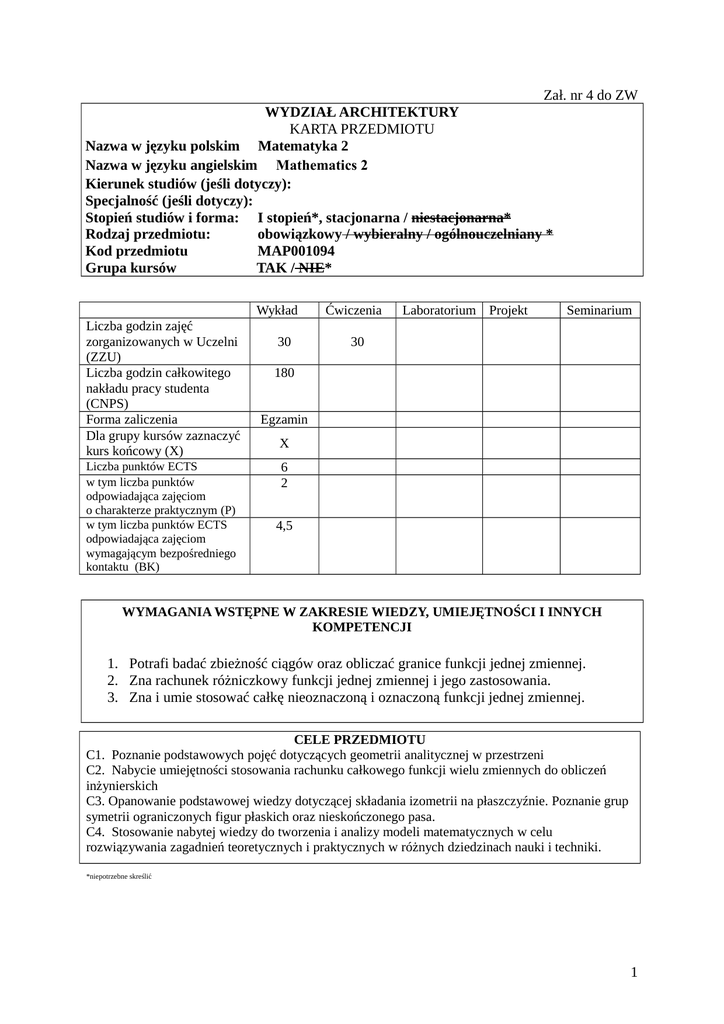 Zał. nr 4 do ZW WYDZIAŁ ARCHITEKTURY KARTA PRZEDMIOTU Nazwa w języku polskim Matematyka 2 Nazwa w języku angielskim Mathematics 2 Kierunek studiów (jeśli dotyczy): Specjalność (jeśli dotyczy): Stopień studiów i forma: I stopień*, stacjonarna / niestacjonarna* Rodzaj przedmiotu: obowiązkowy / wybieralny / ogólnouczelniany * Kod przedmiotu MAP001094 Grupa kursów TAK / NIE* Wykład Liczba godzin zajęć zorganizowanych w Uczelni (ZZU) Liczba godzin całkowitego nakładu pracy studenta (CNPS) Forma zaliczenia Dla grupy kursów zaznaczyć kurs końcowy (X) Liczba punktów ECTS w tym liczba punktów odpowiadająca zajęciom o charakterze praktycznym (P) w tym liczba punktów ECTS odpowiadająca zajęciom wymagającym bezpośredniego kontaktu (BK) 30 Ćwiczenia Laboratorium Projekt Seminarium 30 180 Egzamin X 6 2 4,5 WYMAGANIA WSTĘPNE W ZAKRESIE WIEDZY, UMIEJĘTNOŚCI I INNYCH KOMPETENCJI 1. Potrafi badać zbieżność ciągów oraz obliczać granice funkcji jednej zmiennej. 2. Zna rachunek różniczkowy funkcji jednej zmiennej i jego zastosowania. 3. Zna i umie stosować całkę nieoznaczoną i oznaczoną funkcji jednej zmiennej. CELE PRZEDMIOTU C1. Poznanie podstawowych pojęć dotyczących geometrii analitycznej w przestrzeni C2. Nabycie umiejętności stosowania rachunku całkowego funkcji wielu zmiennych do obliczeń inżynierskich C3. Opanowanie podstawowej wiedzy dotyczącej składania izometrii na płaszczyźnie. Poznanie grup symetrii ograniczonych figur płaskich oraz nieskończonego pasa. C4. Stosowanie nabytej wiedzy do tworzenia i analizy modeli matematycznych w celu rozwiązywania zagadnień teoretycznych i praktycznych w różnych dziedzinach nauki i techniki. *niepotrzebne skreślić 1 PRZEDMIOTOWE EFEKTY KSZTAŁCENIA Z zakresu wiedzy student: PEK_W01 zna rachunek wektorowy w przestrzeni, zna równania prostych i płaszczyzn PEK_W02 zna podstawy rachunku całkowego funkcji wielu zmiennych PEK_W03 ma podstawową wiedzę dotyczącą izometrii na płaszczyźnie oraz grup symetrii płaskich figur ograniczonych i nieskończonego pasa. Z zakresu umiejętności student: PEK_U01 potrafi stosować rachunek wektorowy do badania wzajemnego położenia prostych i płaszczyzn w przestrzeni PEK_U02 potrafi obliczać i interpretować całkę podwójną, potrafi rozwiązywać zagadnienia inżynierskie z wykorzystaniem całki podwójnej PEK_U03 potrafi wykonać podstawowe konstrukcje geometryczne przy składaniu izometrii, potrafi projektować ograniczone figury płaskie o zadanej grupie symetrii, potrafi wykonać deseń w pasie o zadanej grupie symetrii Z zakresu kompetencji społecznych: PEK_K01 rozumie konieczność samodzielnej pracy nad opanowaniem materiału kursu PEK_K02 rozumie rolę matematyki w dziedzinach technicznych i projektanckich TREŚCI PROGRAMOWE Wy1 Wy2 Wy3 Wy4 Wy5 Wy6 Wy7 Wy8 Wy9 Wy10 Wy11 Wy12 Forma zajęć - wykłady Wektory w R3. Dodawanie i mnożenie przez skalar wektorów. Iloczyn skalarny wektorów. Iloczyn wektorowy. Iloczyn mieszany. Zastosowanie tych iloczynów do obliczania pól obszarów i objętości brył. Równanie normalne, ogólne i parametryczne płaszczyzny. Wzajemne położenie płaszczyzn. Równanie parametryczne, kierunkowe i krawędziowe prostej. Wzajemne położenie prostych, wzajemne położenie prostej i płaszczyzny. Pojęcie funkcji dwóch zmiennych, dziedzina, warstwice, powierzchnie jako wykresy. Intuicja pojęcia granicy i ciągłości dla funkcji dwóch zmiennych. Całka podwójna jako objętość, zamiana całki podwójnej na całki iterowane. Obliczanie całek podwójnych po obszarach normalnych względem osi układu. Współrzędne biegunowe w całkach podwójnych Zastosowanie całek podwójnych w geometrii i mechanice. Rodzaje odwzorowań. Składanie przekształceń, przekształcenia odwrotne. Punkty stałe przekształcenia. Pojęcie izometrii, translacje, obroty, odbicia i odbicia z poślizgiem. Twierdzenie o postaci izometrii płaszczyzny jako złożenia co najwyżej trzech odbić. Składanie izometrii. Pojęcie izometrii zgodnej i przeciwnej – ich związek z zachowaniem orientacji płaszczyzny. Pojęcie grupy i podgrupy. Generatory grupy. Grupa wszystkich Liczba godzin 2 2 2 2 2 2 2 2 2 2 2 2 2 izometrii płaszczyzny. Grupy symetrii figury ograniczonej na płaszczyźnie – grupa cykliczna Wy13 obrotów i grupa dyedralna. Opis tych grup za pomocą generatorów. Klasyfikacja siedmiu grup symetrii szlaku (deseń w nieograniczonym Wy14 pasie). Motyw i obszar fundamentalny. Przykłady grup symetrii w architekturze. Klasyfikacja skończonych Wy15 grup symetrii płaszczyzny. Suma godzin Forma zajęć - ćwiczenia Ćw1 Ćw2 Ćw3 Ćw4 Ćw5 Ćw6 Ćw7 Ćw8 Ćw9 Ćw10 Ćw11 Działania na wektorach swobodnych. Obliczanie iloczynu skalarnego, wektorowego i mieszanego. Zastosowania do badania prostopadłości i równoległości wektorów. Wyznaczanie równań normalnych, ogólnych i parametrycznych płaszczyzn. Badanie wzajemnego położenia płaszczyzn. Obliczanie kąta między płaszczyznami. Wyznaczanie równań parametrycznych, kierunkowych i krawędziowych prostych. Obliczanie odległości dwóch prostych skośnych i równoległych. Wyznaczanie kąta pomiędzy prostą a płaszczyzną. Wyznaczanie rzutu prostej na płaszczyznę oraz odbicia punktu w prostej i w płaszczyźnie. Wyznaczanie dziedzin funkcji dwóch i trzech zmiennych. Rozpoznawanie funkcji opisującej powierzchnie obrotowe. Całkowanie po prostokącie. Zamiana całki podwójnej na całki iterowane. Zamiana całki podwójnej po obszarze normalnym ze względu na jedną zmienną na całki iterowane. Zmiana kolejności całkowania. Przechodzenie od współrzędnych kartezjańskich do biegunowych i odwrotnie. Obliczanie całek podwójnych z wykorzystaniem współrzędnych biegunowych. Zastosowanie całek podwójnych w geometrii – obliczanie pól obszarów i objętości brył. Zastosowanie całek podwójnych w fizyce obliczanie mas obszarów jednorodnych i niejednorodnyc