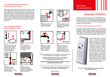 Czy podzielniki kosztów ogrzewania stosuje się tylko w Polsce? Informacja dla mieszkańców Podzielniki kosztów ogrzewania stosuje się w Europie ponad 50 lat. Najpierw stosowano podzielniki cieczowe, obecnie coraz szerzej elektroniczne. Rozliczanie kosztów zużycia ciepła przy użyciu podzielników kosztów ogrzewania to obecnie najskuteczniejsza i najtańsza metoda stosowana powszechnie w całej Europie, która nakłania odbiorców do racjonalnego gospodarowania ciepłem, zabezpiecza przed marnotrawieniem źródeł energii i przyczynia się do traktowania środowiska z należnym szacunkiem. Rys. 1 W pokoju wystarcza temperatura 20 stopni, a w kuchni jedynie 15 stopni. Każdy stopień temperatury mniej to ok. 6% oszczędności kosztów ogrzewania. Rys. 2 Drzwi i okna powinny być szczelne. Nie można pozwolić, aby ciepło, za które płacimy, uciekało z mieszkania. Rys. 5 Kaloryfer należy niezwłocznie odpowietrzyć, jeśli usłyszymy „bulgotanie”. Rys. 6 Nie należy suszyć prania na grzejnikach. Grzejnik bowiem będzie gorący, a w mieszkaniu będzie zimno. Rys. 7 Kapiący kran zwiększa niepotrzebnie zużycie wody o 10 I dziennie. Należy niezwłocznie wezwać instalatora. Rys. 8 Nie wietrzyć mieszkania dłużej niż 10 minut. Ciepło w ścianach i meblach pozostanie i ułatwi ogrzanie świeżego powietrza, które napłynęło podczas wietrzenia. Ze względu na trwałość zaworu i głowicy termostatycznej wskazane jest maksymalne otwarcie zaworu w lecie, po zakończeniu sezonu grzewczego. Uszkodzenie podzielnika lub plomby uniemożliwi rozliczenie według indywidualnego zużycia. Rys. 4 Grzejniki powinny być odsłonięte. Zbyt długie zasłony i meble stojące przy grzejnikach nie dopuszczają ciepła do mieszkania. podzielniki kosztów ogrzewania firmy Techem. Oszczędne zużycie ciepła jest możliwe przy zastosowaniu przyrządów, które je dokładnie rejestrują i wskazują. Przyrządy spełniające te trudne wymagania dostarczają dane do rozliczeń ciepła zgodnie z indywidualnym zużyciem. Każdy konsument jest zainteresowany rzetelną rejestracją wielkości zużycia. Przykrycie podzielnika zarówno suchymi jak i mokrymi materiałami może spowodować wzrost wskazań zużycia ciepła. Rys. 3 Temperaturę w nocy z powodzeniem można obniżyć o 5 stopni. Oszczędza się w ten sposób do ok. 30% ciepła. od bieżącego sezonu grzewczego ciepło dostarczane do Państwa mieszkań rozliczane będzie według faktycznego zużycia. Oznacza to, że od Państwa głównie będzie zależało, ile wyniesie rachunek za ciepło. W tym celu zamontowane zostały na każdym grzejniku Pracownicy firmy Techem wraz z Państwa administracją służą Państwu doradztwem i pełną informacją. www.techem.pl Techem Techniki Pomiarowe Sp. z o.o.zastrzega sobie prawo do pomyłek i zmian. Jak oszczędzać energię Osiem praktycznych rad? Szanowni Państwo W podzielniku optica, firma Techem, w Państwa interesie zawarła wszystkie możliwości elektroniki. Dzięki swojej funkcjonalności, dokładności, przejrzystości danych, jakości i trwałości, urządzenie to spełnia wszystkie wymagania stawiane nowoczesnej technice grzewczej. Jest to urządzenie o dużych perspektywach na przyszłość. Gwarantuje ono Państwu, że rozliczenie kosztów ogrzewania stale będzie odpowiadać faktycznemu zużyciu ciepła. Daje ono Państwu możliwość kontrolowania na bieżąco wielkości zużycia ciepła i porównywania wielkości zużycia. Techem to 60 lat doświadczeń w sprawiedliwym naliczaniu rachunków. Rejestruje i sprawdza z precyzją mechanizmu zegarka W każdym podzielniku optica jest zamontowany mikrokomputer. Wprowadzone są do niego wartości dotyczące miedzy innymi mocy cieplnej grzejników, dla którego jest przeznaczony. Podzielnik optica jest zaprogramowany z dokładnością do 1 W dla swojego grzejnika. Wartości te służą jako podstawa do rejestracji i wskazań. W zaprogramowanym dniu odczytu wszystkie podzielniki optica umieszczają swoje stany zużycia w pamięci i pokazują jako wartości zużycia w ubiegłym roku. Rozpoczynają równocześnie rejestrować od zera zużycie bieżące. W ten sposób rozliczenie następuje dokładnie za 1 rok. Co wskazuje podzielnik? Trzy wartości funkcyjne podzielnika optica pojawiają się automatycznie co około 4 sekundy. Aktualna wartość zużycia W zaprogramowanym dniu nastąpi ich automatyczne uruchomienie i będą wskazywać: Przykład numeru fabrycznego Jak rozliczane są koszty zużycia ciepła w Państwa mieszkaniach? Całkowity koszt zużycia ciepła dostarczonego do budynku dzielony jest na koszty stałe wynoszące 30% - 50% kosztu całkowitego oraz koszty zmienne - reszta. Koszty stałe dzielone są proporcjonalnie do powierzchni mieszkań i obejmują koszt ogrzania klatek schodowych, wspólnie użytkowanych pomieszczeń, takich jak pralnie, suszarnie, koszt eksploatacji węzła itp. Koszty zmienne są całkowicie zależne od zużycia ciepła w Państwa mieszkaniach. Zużycie za ubiegły rok Sprawiedliwy podział kosztów ogrzewania Liczba kontrolna Liczba kontrolna służy serwisowi do sprawdzenia poprawności odczytu. Podzielniki zamontowane na grzejnikach z zaprogramowaną datą startu wskazują tylko swój indywidualny numer. Rozliczenie kosztów centralnego ogrzewania na podstawie wskazań podzielników będzie więc zawsze zgodne z zasadą „każdy płaci za siebie”. Dla mieszkań „niekorzystnie położonych” pod względem komfortu cieplnego (np. mieszkania parterowe, szczytowe) stosuje się współczynniki redukcyjne. Niwelują one różnice w komforcie cieplnym wszystkich mieszkań w budynku. Elektroniczny podzielnik kosztów ogrzewania optica wraz z przynależnym systemem rozliczania kosztów ogrzewania spełnia wymagania normy PN EN 834. Oszczędności i komfort cieplny w mieszkaniu zapewnić może termostat grzejnikowy Termostaty umożliwiają nastawienie temperatury w pomieszczeniach w zakresie 8 do 26°C. Pos