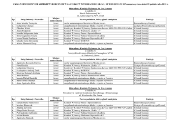 WYKAZ OBWODOWYCH KOMISJI WYBORCZYCH W JAWORZE W WYBORACH DO SEJMU RP I DO SENATU RP zarządzonych na dzień 25 października 2015 r. Obwodowa Komisja Wyborcza Nr 1 w Jaworze z siedzibą w: Szkole Podstawowej Nr 5 ul. Armii Krajowej Nr 9, Jawor Lp 1. 2. 3. 4. 5. 6. 7. 8. 9. Imię (Imiona) i Nazwisko Anna Monika Taratycka Małgorzata Charęza Zdzisław Witek Adam Podgórski Monika Małgorzata Jania Ilona Magdalena Trzyna Iwona Wanda Pawlinow Klaudia Daria Stawiarska Adrian Sławomir Knop Miejsce zamieszkania Jawor Jawor Jawor Jawor Jawor Jawor Jawor Jawor Jawor Nazwa podmiotu, który zgłosił kandydata Funkcja osoba wskazana przez Burmistrza Miasta Jawora uzupełnienie do minimalnego składu z rejestru wyborców Koalicyjny Komitet Wyborczy Zjednoczona Lewica SLD+TR+PPS+UP+Zieloni Komitet Wyborczy Wyborców „Kukiz’15” Komitet Wyborczy Prawo i Sprawiedliwość Komitet Wyborczy Polskie Stronnictwo Ludowe Komitet Wyborczy Platforma Obywatelska RP Komitet Wyborczy KORWiN uzupełnienie do minimalnego składu z rejestru wyborców Przewodniczący Komisji Zastępca Przewodniczącego Komisji Członek Komisji Członek Komisji Członek Komisji Członek Komisji Członek Komisji Członek Komisji Członek Komisji Obwodowa Komisja Wyborcza Nr 2 w Jaworze z siedzibą w: Europejskim Centrum Młodzieży Euroregionu NYSA ul. Parkowa 5, Jawor Lp 1. 2. 3. 4. 5. 6. 7. 8. 9. Imię (Imiona) i Nazwisko Agnieszka Ryszarda Partyka Paweł Sasiela Małgorzata Olszowa Przemysław Andrzej Żołek Krystyna Bożena Litwińska Aneta Babiarz Marcin Michał Bagiński Irena Sabina Dmytryk Anna Agnieszka Kitta Miejsce zamieszkania Jawor Jawor Jawor Jawor Jawor Jawor Jawor Jawor Jawor Nazwa podmiotu, który zgłosił kandydata Funkcja osoba wskazana przez Burmistrza Miasta Jawora Komitet Wyborczy Wyborców „Kukiz’15” Koalicyjny Komitet Wyborczy Zjednoczona Lewica SLD+TR+PPS+UP+Zieloni Komitet Wyborczy KORWiN Komitet Wyborczy Prawo i Sprawiedliwość Komitet Wyborczy Polskie Stronnictwo Ludowe uzupełnienie do minimalnego składu z rejestru wyborców uzupełnienie do minimalnego składu z rejestru wyborców uzupełnienie do minimalnego składu z rejestru wyborców Przewodniczący Komisji Zastępca Przewodniczącego Komisji Członek Komisji Członek Komisji Członek Komisji Członek Komisji Członek Komisji Członek Komisji Członek Komisji Obwodowa Komisja Wyborcza Nr 3 w Jaworze z siedzibą w: Powiatowym Centrum Kształcenia Zawodowego i Ustawicznego ul. Wrocławska 30a, Jawor Lp 1. 2. 3. 4. 5. 6. 7. Imię (Imiona) i Nazwisko Danuta Maria Markiewicz Mariusz Błaszczak Andrzej Zaworski Kinga Maria Kurzeja Piotr Zdzisław Jabłoński Michał Bander Agnieszka Stańczak Miejsce zamieszkania Jawor Jawor Jawor Jawor Jawor Jawor Jawor Nazwa podmiotu, który zgłosił kandydata Funkcja Komitet Wyborczy Prawo i Sprawiedliwość uzupełnienie do minimalnego składu z rejestru wyborców Koalicyjny Komitet Wyborczy Zjednoczona Lewica SLD+TR+PPS+UP+Zieloni Komitet Wyborczy Wyborców „Kukiz’15” Komitet Wyborczy Polskie Stronnictwo Ludowe Komitet Wyborczy Platforma Obywatelska RP osoba wskazana przez Burmistrza Miasta Jawora Przewodniczący Komisji Zastępca Przewodniczącego Komisji Członek Komisji Członek Komisji Członek Komisji Członek Komisji Członek Komisji Obwodowa Komisja Wyborcza Nr 4 w Jaworze z siedzibą w: Gimnazjum Nr 2 pl. Bankowy 1, Jawor Lp 1. 2. 3. 4. 5. 6. 7. Imię (Imiona) i Nazwisko Czesława Kozłowska Robert Jacek Gierczyk Aneta Kucharzyk Dominika Agnieszka Kus Beata Krystyna Błaszczak-Rzepka Elżbieta Ewa Jakimowicz Elżbieta Barbara Dacko Miejsce zamieszkania Jawor Jawor Jawor Jawor Jawor Jawor Jawor Nazwa podmiotu, który zgłosił kandydata Funkcja osoba wskazana przez Burmistrza Miasta Jawora Komitet Wyborczy Wyborców „Kukiz’15” Komitet Wyborczy Prawo i Sprawiedliwość Komitet Wyborczy Polskie Stronnictwo Ludowe uzupełnienie do minimalnego składu z rejestru wyborców Koalicyjny Komitet Wyborczy Zjednoczona Lewica SLD+TR+PPS+UP+Zieloni Komitet Wyborczy Platforma Obywatelska RP Przewodniczący Komisji Zastępca Przewodniczącego Komisji Członek Komisji Członek Komisji Członek Komisji Członek Komisji Członek Komisji Obwodowa Komisja Wyborcza Nr 5 w Jaworze z siedzibą w: Zespole Szkół ul. Adama Rapackiego Nr 1, Jawor Lp . 1. 2. 3. 4. 5. 6. 7. Imię (Imiona) i Nazwisko Dorota Sylwia Bober Janina Danuta Bałchanowska Mieczysław Zdrzałka Krystyna Januszyk Halina Jadwiga Drąg Elżbieta Maria Szurek Beata Agnieszka Stawiarska Miejsce zamieszkania Jawor Jawor Jawor Jawor Jawor Jawor Jawor Nazwa podmiotu, który zgłosił kandydata Funkcja osoba wskazana przez Burmistrza Miasta Jawora Koalicyjny Komitet Wyborczy Zjednoczona Lewica SLD+TR+PPS+UP+Zieloni Komitet Wyborczy Wyborców „Kukiz’15” Komitet Wyborczy Prawo i Sprawiedliwość Komitet Wyborczy Polskie Stronnictwo Ludowe Komitet Wyborczy Platforma Obywatelska RP Komitet Wyborczy KORWiN Przewodniczący Komisji Zastępca Przewodniczącego Komisji Członek Komisji Członek Komisji Członek Komisji Członek Komisji Członek Komisji Obwodowa Komisja Wyborcza Nr 6 w Jaworze z siedzibą w: Jaworskim Ośrodku Kultury Rynek 5, Jawor Lp 1. 2. 3. 4. 5. 6. 7. 8. 9. Imię (Imiona) i Nazwisko Monika Ewa Dolasińska Olga Detyna Anna Genowefa Sieracka Sławomir Zygmunt Kozłowski Iwona Lasek Natalia Jadwiga Kościelecka Sandra Łazarska Ewelina Agnieszka Szynkler Małgorzata Ewa Jamka Miejsce zamieszkania Jawor Jawor Jawor Jawor Jawor Jawor Jawor Jawor Jawor Nazwa podmiotu, który zgłosił kandydata Funkcja osoba wskazana przez Burmistrza Miasta Jawora Komitet Wyborczy Wyborców „Kukiz’15” Koalicyjny Komitet Wyborczy Zjednoczona Lewica SLD+TR+PPS+UP+Zieloni Komitet Wyborczy Prawo i Sprawiedliwość Komitet Wyborczy Polskie Stronnictwo Ludowe Komitet Wyborczy Platforma Obywatelska RP Komitet Wyborczy KORWiN uzupełnienie do minimalnego składu z rejestru wyborców uzupełnienie do minimalnego składu z rejestru wyborców Przewodniczą