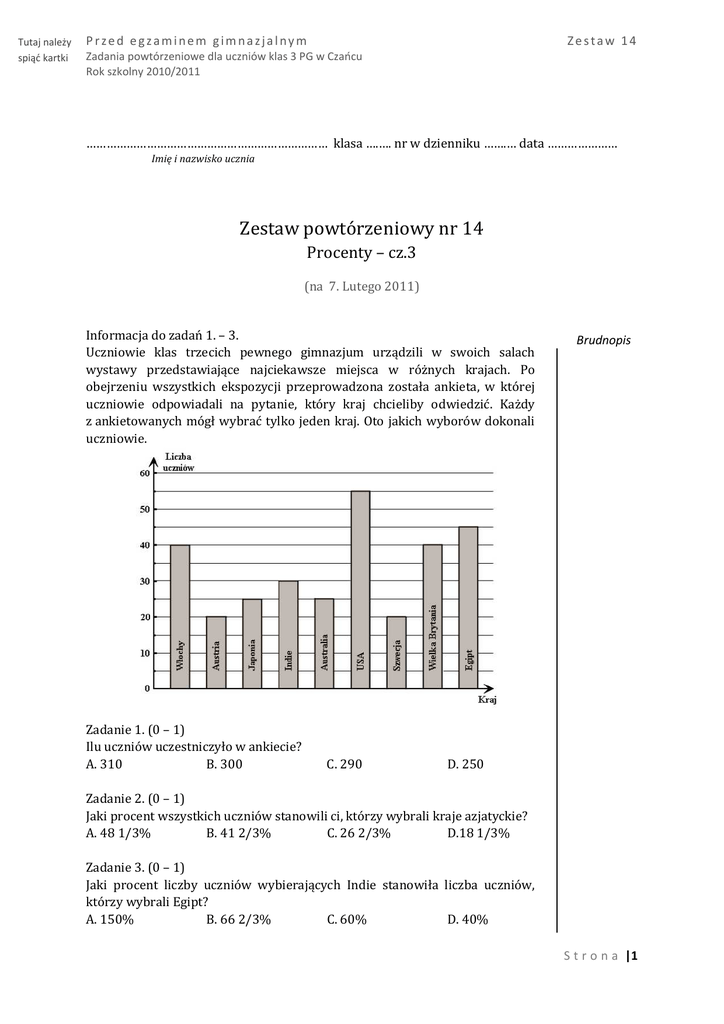 Tutaj należy spiąć kartki Przed egzaminem gimnazjalnym Zestaw 14 Zadania powtórzeniowe dla uczniów klas 3 PG w Czańcu Rok szkolny 2010/2011 ……………………………………………………………… klasa ….…. nr w dzienniku …….… data ………………… Imię i nazwisko ucznia Zestaw powtórzeniowy nr 14 Procenty – cz.3 (na 7. Lutego 2011) Informacja do zadań 1. – 3. Uczniowie klas trzecich pewnego gimnazjum urządzili w swoich salach wystawy przedstawiające najciekawsze miejsca w różnych krajach. Po obejrzeniu wszystkich ekspozycji przeprowadzona została ankieta, w której uczniowie odpowiadali na pytanie, który kraj chcieliby odwiedzić. Każdy z ankietowanych mógł wybrać tylko jeden kraj. Oto jakich wyborów dokonali uczniowie. Zadanie 1. (0 – 1) Ilu uczniów uczestniczyło w ankiecie? A. 310 B. 300 C. 290 Brudnopis D. 250 Zadanie 2. (0 – 1) Jaki procent wszystkich uczniów stanowili ci, którzy wybrali kraje azjatyckie? A. 48 1/3% B. 41 2/3% C. 26 2/3% D.18 1/3% Zadanie 3. (0 – 1) Jaki procent liczby uczniów wybierających Indie stanowiła liczba uczniów, którzy wybrali Egipt? A. 150% B. 66 2/3% C. 60% D. 40% S t r o n a |1 Przed egzaminem gimnazjalnym Zestaw 14 Zadania powtórzeniowe dla uczniów klas 3 PG w Czańcu Rok szkolny 2010/2011 Informacja do zadania 4. Diagram przedstawia wyniki ankiety przeprowadzonej wśród grupy gimnazjalistów na temat ulubionego miejsca wypoczynku. Każdy wskazał tylko jedno miejsce. Zadanie 4. (0-6) Uzupełnij tabelę Miejsce odpoczynku Liczba osób jezioro 90 Procent góry 20% boisko 15% rzeka morze Kąt środkowy (w stopniach) 36 25% Liczba ankietowanych: …………………………… Zadanie 5. (0-2) Do 200 g herbaty dodano łyżeczkę cukru (3 g). Oblicz stężenie procentowe otrzymanego roztworu. S t r o n a |2 Przed egzaminem gimnazjalnym Zestaw 14 Zadania powtórzeniowe dla uczniów klas 3 PG w Czańcu Rok szkolny 2010/2011 Informacja do zadań 6. i 7. W czasie snu zdrowy człowiek, średniego wzrostu i ciężaru ciała, zużywa około 1800 kcal na dobę. Tabela ilustruje zmiany dobowego zapotrzebowania na energię ludzi różnych zawodów. Zawód Dobowe zużycie energii w stosunku o 1800 kcal Krawiec 149% Mechanik 177% Stolarz 181% Brudnopis Zadanie 6. (0-1) Zużycie energii w czasie doby przez osobę pracującą w zawodzie mechanika jest równe A. 3186 kcal B. 1977 kcal C. 1623 kcal D. 177 kcal Zadanie 7. (0-1) O ile kilokalorii więcej zużyje organizm człowieka pracującego w zawodzie stolarza niż krawca? A. 32 kcal B. 72 kcal C. 330 kcal D. 576 kcal Informacja do zadań 8. i 9. Na diagramach przedstawiono udział głównych pierwiastków w masie każdej z podanych geosfer. Zadanie 8. (0-1) Jaki jest procentowy udział węgla w masie biosfery? A. około 50% B. około 30% C. około 20% D. około 10% Zadanie 9. (0-1) W której geosferze stosunek masy tlenu do masy pozostałych pierwiastków jest najmniejszy A. w litosferze B. w atmosferze C. w biosferze D. w hydrosferze S t r o n a |3 Przed egzaminem gimnazjalnym Zestaw 14 Zadania powtórzeniowe dla uczniów klas 3 PG w Czańcu Rok szkolny 2010/2011 Zadanie 10. (0–4) Klub Janka za zwycięstwo w regatach otrzymał nagrodę w wysokości 2000 zł. Nagrodę tę członkowie klubu chcą ulokować w banku na okres jednego roku. Rozważane są dwie oferty: I – lokata na okres 12 miesięcy według stałej stopy procentowej w wysokości 8% w stosunku rocznym, II – lokata na okres pół roku oprocentowana według stałej stopy procentowej w wysokości 4% w stosunku półrocznym. Po 6 miesiącach dopisywane są odsetki i nowa kwota jest ulokowana ponownie na koncie o takim samym oprocentowaniu. Oblicz kwotę odsetek przy każdej z proponowanych ofert. Zapisz obliczenia. S t r o n a |4 Przed egzaminem gimnazjalnym Zestaw 14 Zadania powtórzeniowe dla uczniów klas 3 PG w Czańcu Rok szkolny 2010/2011 Zadanie 11. (0–2) Złoty pierścionek waży 3,5 g i wykonany został ze złota próby 750 (próba oznacza liczbę gramów czystego złota w 1000 g wyrobu). Ile gramów czystego złota jest w tym pierścionku? Zapisz obliczenia. Zadanie 12. (0–5) Koszt nadruku na koszulkach oblicza się według pewnej stawki. Gdy zamówienie przekracza 100 nadruków, to każdy następny nadruk wykonuje się ze stałym procentowym rabatem i wówczas cena jednego nadruku wynosi 1,2 zł. Za wykonanie 250 nadruków zapłacono 330 zł. Ile procent wynosi rabat?. Zapisz obliczenia. W zestawie wykorzystano materiały opracowane przez OKE S t r o n a |5