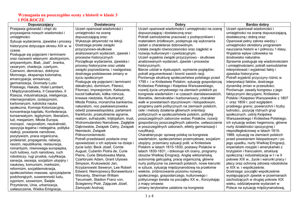Wymagania na poszczególne oceny z historii w klasie 3 I PÓŁROCZE Dopuszczający Przejawia gotowość i chęć do przyswajania nowych wiadomości i umiejętności. Sytuuje wydarzenia, zjawiska i procesy historyczne dotyczące okresu XIX w. w czasie. Posługuje się pojęciami i terminami oraz nazwami własnymi: abolicjonizm, antysemityzm, Biali, „biali”, branka, cezaryzm, chadecja, czartyzm, Czerwoni, demokraci, doktryna Monroego, ekspansja kolonialna, emancypacja, emisariusz, germanizacja, Gromady Ludu Polskiego, Hakata, Hotel Lambert, I Międzynarodówka, II Cesarstwo, II Rzesza, industrializacja, inteligencja, internacjonalizm, izolacjonizm, karbonaryzm, katolicka nauka społeczna, Komisja Kolonizacyjna, koncentracja kapitału, Konfederacja, konserwatyzm, legitymizm, liberalizm, lud, mesjanizm, Młoda Europa, monopol, nacjonalizm, neutralność, opozycja legalna i nielegalna, polityka reakcji, powstanie narodowe, pozytywizm, praca organiczna, proletariat, propaganda, rabacja, rasizm, republikanie, restauracja, romantyzm, równowaga europejska, ruch ludowy, ruch narodowy, ruch robotniczy, rugi pruskie, rusyfikacja, sanacja, secesja, socjalizm utopijny i naukowy, komunizm, marksizm, reformizm, socjaldemokracja, społeczeństwo masowe, sprzysiężenie podchorążych, suwerenność ludu, syjonizm, szowinizm, Święte Przymierze, Unia, urbanizacja, uwłaszczenie, Wielka Emigracja, Dostateczny Uczeń opanował wiadomości i umiejętności na ocenę dopuszczającą oraz: Wykazuje aktywność na lekcji. Dostrzega proste związki przyczynowo-skutkowe analizowanych wydarzeń, zjawisk i procesów historycznych Porządkuje wydarzenia, zjawiska i procesy historyczne oraz ustala związki poprzedzania, i następstwa; dostrzega podstawowe zmiany w życiu społecznym Posługuje się pojęciami i terminami dekabryści, dominium, Filareci, Filomaci, impresjonizm, Kaliszanie, kocioł bałkański, kółka rolnicze, krwawa niedziela, Kulturkampf, Młoda Polska, monarchia bankierów, naturalizm, noc paskiewiczowska odwilż posewastopolska, parlament frankfurcki, przeludnienie agrarne, realizm, sufrażystki, trójlojalizm, trust, Wolnomularstwo Narodowe, Zagłębie Dąbrowskie, Związek Celny, Związek Niemiecki, Związek Północnoniemiecki. Potrafi przedstawić postacie oraz opowiedzieć o ich wpływie na dzieje i życie ludzi: Beck Józef, Comte August, Cubertin Piotra de, Curie Pierre, Curie Skłodowska Maria, Czartoryski Adam, Grant Ulysses Simpson, Krukowiecki Jan, Krzyżanowski Seweryn, Lee Robert Edward, Niemojowscy Bonawentura i Wincenty, Sherman William Tecumseh, Stadion Franz von, Ściegienny Piotr, Zajączek Józef, Zamoyski Andrzej. Dobry Uczeń opanował wiadomości i umiejętności na ocenę dopuszczającą i dostateczną oraz: Potrafi samodzielnie pracować z podręcznikiem i materiałem źródłowym, podejmuje się wykonania zadań o charakterze dobrowolnym. Ustala związki równoczesności oraz ciągłość w rozwoju kulturowym i cywilizacyjnym. Uczeń wyjaśnia związki przyczynowo - skutkowe analizowanych wydarzeń, zjawisk i procesów historycznych; Bierze udział w dyskusjach, wymianie poglądów; potrafi argumentować i bronić swoich racji. Porównuje strukturę społeczeństwa polskiego przed 1795 r. i w Królestwie Polskim; sytuację gospodarczą Królestwa Polskiego i Księstwa Warszawskiego, rozwój życia umysłowego na ziemiach polskich po kongresie wiedeńskim i w czasach stanisławowskich, liberałów, demokratów i karbonariuszy, charakter walk w powstaniach styczniowym i listopadowym, programy partii politycznych na ziemiach polskich, cele i metody działania głównych orientacji politycznych w społeczeństwie polskim, politykę poszczególnych zaborców wobec Polaków, rozwój gospodarczy poszczególnych zaborów, uwłaszczenie w poszczególnych zaborach, efekty germanizacji i rusyfikacji, Charakteryzuje: sprawę polską na kongresie wiedeńskim, społeczeństwo przemysłowe, socjalizm utopijny, przemiany sytuacji polit. w Królestwie Polskim w latach 1815-1830, postawy Polaków w latach 1830-1831, i dokonuje ich oceny, programy obozów Wielkiej Emigracji, Anglię wiktoriańską. autonomię galicyjską, pracę organiczną, główne nurty polityczne na ziemiach polskich, nowe kierunki w sztuce, sytuację międzynarodową na przełomie wieków, zróżnicowanie poziomu rozwoju społecznego, gospodarczego, kulturowego i politycznego świata na początku XX w., Korzystając z mapy omawia: zmiany terytorialne ustalone na kongresie 1z4 Bardzo dobry Uczeń opanował wiadomości i umiejętności na ocenę dopuszczającą, dostateczną i dobrą oraz: Opanował pełny zakres wiedzy i umiejętności określony programem nauczania historii w I półroczu 1 klasy. Wyjaśnia wpływ człowieka na środowisko naturalne. Sprawnie posługuje się wiadomościami i umiejętnościami, potrafi samodzielnie interpretować i wyjaśniać fakty i zjawiska historyczne. Potrafi wyjaśnić przyczyny różnic w interpretacji faktów, dostrzega dynamikę zmian w przeszłości. Porównuje: zasady kongresu z jego faktycznymi decyzjami, Królestwo Polskie i Księstwo Warszawskie z 1807 r. oraz 1809 r. pod względem przebiegu granic, powierzchni i liczby ludności,, pozycję różnych grup społecznych, ustrój Księstwa Warszawskiego i Królestwa Polskiego, ich sytuację wobec hegemona, główne nurty działalności opozycyjnej i niepodległościowej w latach 18151989, sytuację na ziemiach polskich przed powstaniem listopadowym i po jego upadku, nurty Wielkiej Emigracji, imperializm rosyjski i amerykański z brytyjskim i francuskim, strukturę społeczną i industrializację w I i w II połowie XIX w., życie i warunki pracy i płacy oraz ochronę zdrowia robotników w XIX w. i współcześnie. Dostrzega: początki współcześnie występujących zjawisk w przemianach zachodzących w drugiej połowie XIX wieku, oddziaływanie wydarzeń w Polsce na sytuację międzynarodową, Wymagania na poszczegól