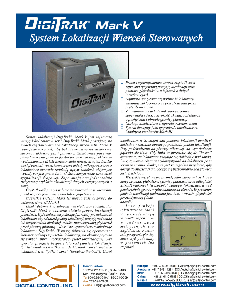 Mark V System Lokalizacji Wierceñ Sterowanych Praca z wykorzystaniem dwóch czêstotliwoœci zapewnia optymaln¹ precyzjê lokalizacji oraz pomiaru g³êbokoœci w miejscach o du¿ych interferencjach Najni¿sza spotykana czêstotliwoœæ lokalizacji eliminuje zak³ócenia przy przechodzeniu przez prêty zbrojeniowe Zaawansowane uk³ady mikroprocesorowe zapewniaj¹ wiêksz¹ szybkoœæ aktualizacji danych o pochyleniu i obrocie g³owicy pilotowej Obs³uga lokalizatora w oparciu o system menu System dostêpny jako upgrade do lokalizatorów i zdalnych monitorów Mark III System lokalizacji DigiTrak ® Mark V jest najnowsz¹ wersj¹ lokalizatorów serii DigiTrak® Mark pracuj¹c¹ na dwóch czêstotliwoœciach lokalizacji przewiertu. Mark V zaprojektowano tak, aby by³ niewra¿liwy na zak³ócenia zarówno aktywne jak i pasywne. Zak³ócenia pasywne, powodowane np. przez prêty zbrojeniowe, zosta³y praktycznie wyeliminowane dziêki zastosowaniu nowej, drugiej, bardzo niskiej czêstotliwoœci. Nowoczesne uk³ady mikroprocesorowe lokalizatora znacznie redukuj¹ wp³yw zak³óceñ aktywnych wywo³ywanych przez linie elektroenergetyczne oraz sieci sygnalizacji drogowej. Zapewniaj¹ one jednoczeœnie zwiêkszon¹ szybkoœæ aktualizacji danych otrzymywanych z sondy. Czêstotliwoœæ pracy sondy mo¿na zmieniaæ na powierzchni, przed rozpoczêciem wiercenia lub w jego trakcie. Wszystkie systemy Mark III mo¿na zaktualizowaæ do najnowszej wersji Mark V. Dziêki du¿emu i czytelnemu wyœwietlaczowi lokalizator DigiTrak ® Mark V znacznie u³atwia proces lokalizacji przewiertu. Wyœwietlacz ten pokazuje jak nale¿y przemieszczaæ lokalizator, aby odnaleŸæ punkty lokalizacji, pozycjê nad sond¹ lub bezpoœrednio obok niej, a tak¿e przewidywan¹ g³êbokoœæ przed g³owic¹ pilotow¹. „Kosz” na wyœwietlaczu symbolizuje lokalizator DigiTrak®. W miarê zbli¿ania siê operatora w kierunku jednego z punktów lokalizacji, na ekranie pojawia siê symbol “pi³ki” (oznaczaj¹cy punkt lokalizacyjny). Gdy operator przejdzie bezpoœrednio nad punktem lokalizacji, “pi³ka” znajdzie siê w “koszu”. Jest to bardzo prosta technika lokalizacji tzw. “pi³ka i kosz” (target-in-the-box®). Obrót lokalizatora o 90 stopni nad punktem lokalizacji umo¿liwi dok³adne wskazanie bocznego po³o¿enia punktu lokalizacji. Przy podchodzeniu do g³owicy pilotowej, na wyœwietlaczu pojawia siê linia. Gdy linia ta przesunie siê do “kosza” oznacza to, ¿e lokalizator znajduje siê dok³adnie nad sond¹. Liniê tê mo¿na równie¿ wykorzystywaæ do lokalizacji poza torem wiercenia. Funkcja ta jest szczególnie przydatna, gdy dostêp do miejsca znajduj¹cego siê bezpoœrednio nad g³owic¹ jest utrudniony. Wszystkie wysy³ane przez sondê informacje, w tym dane o mocy sygna³u, g³êbokoœci g³owicy pilotowej oraz odleg³oœci ultradŸwiêkowej (wysokoœci samego lokalizatora nad powierzchni¹ gruntu) wyœwietlane s¹ na ekranie. W przednim punkcie lokalizacji podawana jest tak¿e wartoœæ g³êbokoœci przewidywanej ( lookahead®). Inne funkcje lokalizatora Mark V umo¿liwiaj¹ wyœwietlanie pomiarów w jednostkach metrycznych lub angielskich. Pomiar k¹ta pochylenia g³owicy mo¿e byæ podawany w p ro c e n t a c h l u b stopniach. Headquarters 19625 62nd Ave. S., Suite B-103 Kent, Washington 98032 USA Tel 800-288-3610 / 425-251-0559 Fax 253-395-2800 E-mail [email protected] Europe Australia India China Russia +49-9394-990-990 | [email protected] +61-7-5531-4283 | [email protected] +91-172-464-0444 | [email protected] +86-21-6432-5186 | [email protected] +7-843-277-52-22 | [email protected] www.digitrak.com ® Lokalizator DigiTrak ® Mark V Funkcje Dane techniczne Dwie czêstotliwoœci pracy lokalizatora i sondy. Skuteczna eliminacja interferencji. Lokalizacja metod¹ look-ahead® zapewnia odczyt danych o po³o¿eniu, g³êbokoœci, pochyleniu oraz obrocie sondy oraz wskazuje stan na³adowania baterii i temperaturê pracy sondy. Technika lokalizacji “pi³ka i kosz” (target-in-the-box®). £atwa i prosta technika lokalizacji, która prowadzai operatora do miejsca po³o¿enia sondy lub przedniego i tylnego punktu lokalizacji. Udoskonalone funkcje lokalizacyjne powsta³y na bazie precyzyjnych badañ praktycznych. £agodne zmiany zakresów sygna³u s¹ niezauwa¿alne dla operatora. Wyœwietlacz pokazuje ruch lokalizatora w czasie rzeczywistym, umo¿liwiaj¹c prowadzenie lokalizacji podczas procesu wiercenia. Opatentowana procedura kalibracji zapewnia doskona³¹ precyzjê wskazañ oraz mo¿liwoœæ dokonywania rekalibracji podczas wiercenia. Mo¿liwoœæ zdalnego sterowania w prawo i w lewo. Seria modelu.............................................................. DRRV Czêstotliwoœæ pracy..........................................1,5 / 33 kHz Zród³o zasilania....................Akumulator NiCad DigiTrak® ¯ywotnoœæ akumulatora................................. Oko³o 8–12 h £adowarka ..........................12/28 V DC lub 110/220 V AC G³êbokoœæ - zasiêg.................................................... 12,2 m Wyœwietlanie g³êbokoœci..................W czasie rzeczywistym Funkcje............................ Uruchamiane przy pomocy menu Wyœwietlacz.............................................Ciek³okrystaliczny Wyjœcie audio.........................................................Brzêczyk Zasiêg pracy............................................................... 610 m Zakres temperatur pracy........................ Od -20°C do 60°C Szybkoœæ aktualizacji danych obrót............................................... 12 razy na sekundê pochylenie............................................ Raz na sekundê Dok³adnoœæ.............................................Bezwzglêdna ±5% Wysokoœæ................................................................. 27,9 cm Szerokoœæ................................................................. 12,7 cm D³ugoœæ...........