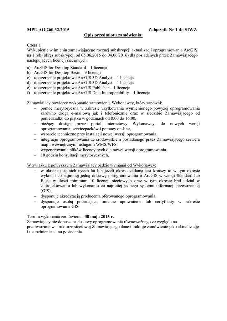 Załącznik Nr 1 do SIWZ MPU.AO.260.32.2015 Opis przedmiotu zamówienia: Część 1 Wykupienie w imieniu zamawiającego rocznej subskrypcji aktualizacji oprogramowania ArcGIS na 1 rok (okres subskrypcji od 05.06.2015 do 04.06.2016) dla posiadanych przez Zamawiającego następujących licencji sieciowych: a) b) c) d) e) f) ArcGIS for Desktop Standard – 1 licencja ArcGIS for Desktop Basic – 9 licencji rozszerzenie projektowe ArcGIS 3D Analyst – 1 licencja rozszerzenie projektowe ArcGIS 3D Analyst – 1 licencja rozszerzenie projektowe ArcGIS Publisher – 1 licencja rozszerzenie projektowe ArcGIS Data Interoperability – 1 licencja Zamawiający powierzy wykonanie zamówienia Wykonawcy, który zapewni: − pomoc merytoryczną w zakresie użytkowania wymienionego powyżej oprogramowania zarówno drogą e-mailową jak i telefonicznie oraz w siedzibie Zamawiającego od poniedziałku do piątku w godzinach od 8:00 do 16:00, − bieżący dostęp, przez portal internetowy Wykonawcy, do nowych wersji oprogramowania, servicepacków i pomocy on-line, − wsparcie techniczne przy instalacji nowej wersji oprogramowania, − integrację oprogramowania ze środowiskiem posiadanego przez Zamawiającego serwera map i wewnętrznymi usługami WMS/WFS, − wygenerowania plików licencyjnych dla nowej wersji oprogramowania, − 10 godzin konsultacji merytorycznych. W związku z powyższym Zamawiający będzie wymagał od Wykonawcy: − w okresie ostatnich trzech lat lub jeżeli okres działania jest krótszy to w tym okresie wykonał co najmniej jedną dostawę oprogramowania o ArcGIS w wersji Standard lub Basic w ilości minimum 10 licencji sieciowych oraz w tym okresie brał udział w zaprojektowaniu lub wykonaniu co najmniej jednego systemu informacji przestrzennej (GIS), − dysponuje akredytacją producenta oferowanego oprogramowania, − dysponuje osobą posiadającą imienne uprawnienia lub certyfikaty w zakresie oprogramowania GIS. Termin wykonania zamówienia: 30 maja 2015 r. Zamawiający nie dopuszcza dostawy oprogramowania równoważnego ze względu na przetwarzane w strukturze sieciowej Zamawiającego dane i traktuje zamówienie jako aktualizację i uzupełnienie stanu posiadania. Część 2 Wykupienie w imieniu zamawiającego rocznej subskrypcji aktualizacji oprogramowania Autodesk Infrastructure Design Suite Premium 2015 oraz oprogramowania Autodesk Infrastructure Map Server 2015 (okres subskrypcji od 07.04.2015r. do 06.04.2016r.) dla posiadanych przez Zamawiającego następujących licencji: a) roczna subskrypcja do pakietu Autodesk Infrastructure Design Suite Premium NLM – 25 licencji sieciowych, b) roczna subskrypcja do Autodesk Infrastructure Map Server – 1 licencja, c) Autodesk InfraWorks 360 Companion SLM – 1 licencja czasowa na 1 rok, d) Autodesk Bridge Design for InfraWorks 360 SLM – 1 licencja czasowa na 1 rok, e) Autodesk Roadway Design for InfraWorks 360 SLM – 1 licencja czasowa na 1 rok, f) Autodesk Drainage Design for InfraWorks 360 SLM – 1 licencja czasowa na 1 rok. Zamawiający powierzy wykonanie zadania Wykonawcy, który zapewni: − pomoc merytoryczną w zakresie użytkowania wymienionego powyżej oprogramowania zarówno drogą e-mailową jak i telefonicznie oraz w siedzibie Zamawiającego od poniedziałku do piątku w godzinach od 8:00 do 16:00; − wsparcie techniczne przy instalacji nowej wersji oprogramowania; − integrację oprogramowania ze środowiskiem posiadanego przez Zamawiającego serwera map i wewnętrznymi usługami WMS/WFS, − wygenerowanie plik licencyjny dla nowej wersji oprogramowania z pkt. a), − zapewnieni konsultacje merytoryczne w postaci dedykowanych szkoleń w zakresie oprogramowania: Autodesk InfraWorks (10 osób, 2 dni), Autodesk AutoCAD Map 3D (10 osób, 2 dni), Autodesk AutoCAD Civil 3D (5 osób, 2 dni), Autodesk Infrastructure Map Server (2 osoby, 2 dni). W związku z powyższym Zamawiający będzie wymagał od Wykonawcy: − autoryzacji firmy Autodesk na sprzedaż i wsparcie techniczne i szkolenia z zakresu przedmiotu zamówienia oraz serwerów map firmy Autodesk − w okresie ostatnich trzech lat, a jeżeli okres działalności jest krótszy to w tym okresie, wykonali należycie co najmniej jedną dostawę oprogramowania Autodesk Infrastructure Design Suite Premium lub pakiet wyższy dla więcej niż 5 licencji sieciowych, − w okresie ostatnich trzech lat, a jeżeli okres działalności jest krótszy to w tym okresie wykonał co najmniej jedno wdrożenie rozwiązań opartych na modelach branżowych w Autodesk Infrastructure Map Server i Autodesk AutoCAD Map 3D, − posiada certyfikat ukończenia autoryzowanych szkoleń z zakresu obsługi i wdrażania systemów opartych o modele branżowe w Autodesk Infrastructure Map Server i Autodesk AutoCAD Map 3D, − posiada certyfikat w stopniu Autodesk Certified Professional: AutoCAD Civil 3D co najmniej 2014, − posiada certyfikat z programu Autodesk Infrastructure Modeler 2013 lub Autodesk Autodesk InfraWorks 2014/15 Termin wykonania zamówienia: 7 kwietnia 2015 r. Zamawiający nie dopuszcza dostawy oprogramowania równoważnego ze względu na przetwarzane w strukturze sieciowej Zamawiającego dane i traktuje zamówienie jako aktualizację i uzupełnienie stanu posiadania.