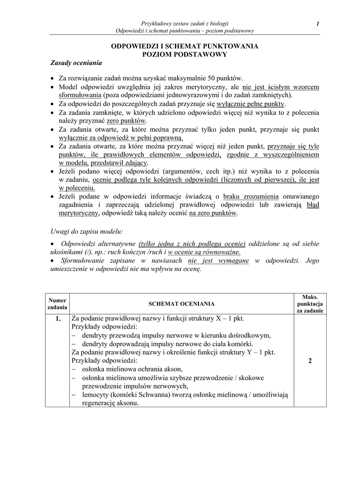 Przykładowy zestaw zadań z biologii Odpowiedzi i schemat punktowania – poziom podstawowy 1 ODPOWIEDZI I SCHEMAT PUNKTOWANIA POZIOM PODSTAWOWY Zasady oceniania • Za rozwiązanie zadań można uzyskać maksymalnie 50 punktów. • Model odpowiedzi uwzględnia jej zakres merytoryczny, ale nie jest ścisłym wzorcem sformułowania (poza odpowiedziami jednowyrazowymi i do zadań zamkniętych). • Za odpowiedzi do poszczególnych zadań przyznaje się wyłącznie pełne punkty. • Za zadania zamknięte, w których udzielono odpowiedzi więcej niż wynika to z polecenia należy przyznać zero punktów. • Za zadania otwarte, za które można przyznać tylko jeden punkt, przyznaje się punkt wyłącznie za odpowiedź w pełni poprawną. • Za zadania otwarte, za które można przyznać więcej niż jeden punkt, przyznaje się tyle punktów, ile prawidłowych elementów odpowiedzi, zgodnie z wyszczególnieniem w modelu, przedstawił zdający. • Jeżeli podano więcej odpowiedzi (argumentów, cech itp.) niż wynika to z polecenia w zadaniu, ocenie podlega tyle kolejnych odpowiedzi (liczonych od pierwszej), ile jest w poleceniu. • Jeżeli podane w odpowiedzi informacje świadczą o braku zrozumienia omawianego zagadnienia i zaprzeczają udzielonej prawidłowej odpowiedzi lub zawierają błąd merytoryczny, odpowiedź taką należy ocenić na zero punktów. Uwagi do zapisu modelu: • Odpowiedzi alternatywne (tylko jedna z nich podlega ocenie) oddzielone są od siebie ukośnikami (/), np.: ruch kończyn /ruch i w ocenie są równoważne. • Sformułowanie zapisane w nawiasach nie jest wymagane w odpowiedzi. Jego umieszczenie w odpowiedzi nie ma wpływu na ocenę. Numer zadania 1. SCHEMAT OCENIANIA Za podanie prawidłowej nazwy i funkcji struktury X – 1 pkt. Przykłady odpowiedzi: − dendryty przewodzą impulsy nerwowe w kierunku dośrodkowym, − dendryty doprowadzają impulsy nerwowe do ciała komórki. Za podanie prawidłowej nazwy i określenie funkcji struktury Y – 1 pkt. Przykłady odpowiedzi: − osłonka mielinowa ochrania akson, − osłonka mielinowa umożliwia szybsze przewodzenie / skokowe przewodzenie impulsów nerwowych, − lemocyty (komórki Schwanna) tworzą osłonkę mielinową / umożliwiają regenerację aksonu. Maks. punktacja za zadanie 2 Przykładowy zestaw zadań z biologii Odpowiedzi i schemat punktowania – poziom podstawowy 2 2. 3. 4. 5. 6. 7. 8. 9. Za podanie poprawnego przykładu – 1 pkt. Przykłady odpowiedzi: soczewka / tęczówka / źrenica. Za określenie na czym polega adaptacja podanej struktury – 1 pkt. Przykład odpowiedzi: − przez zmianę kształtu soczewki możliwe jest ostre widzenie przedmiotów z różnej odległości, − zwężanie i rozszerzanie tęczówki dostosowuje wielkość źrenicy do natężenia światła, − zmienia się wielkość źrenicy stosownie do natężenia światła. Za poprawny wpis do tabeli określeń opisujących tętnice i żyłę po 1 pkt. Tętnica: odprowadza krew z serca, ma grubą warstwę mięśniową, wytrzymuje wysokie ciśnienie / 5, 2, 3. Żyła: doprowadza krew do serca, ma zastawki, zapobiega cofaniu się krwi / 4, 1, 6. Za prawidłowe podanie numeru kolumny dla każdej tkanki po 1 pkt. Poprawna odpowiedź: a) III, b) II. Za poprawne podanie bodźca i reakcji po 1 pkt. Poprawna odpowiedź: a) Bodziec – niski poziom glukozy. b) Reakcja – jedzenie. Za poprawne uzupełnienie zdania – 1 pkt. Poprawna odpowiedź: Filtracja polega na przenikaniu substancji drobnocząsteczkowych m.in. wody, glukozy, mocznika z krwi do wnętrza torebki kłębuszka naczyniowego (torebki Bowmana), w wyniku czego powstaje mocz pierwotny spływający do kanalika. Za poprawne określenie cechy budowy – 1 pkt. Przykłady odpowiedzi: − Tętniczka / naczynie doprowadzające jest szersze niż odprowadzające (krew z kłębuszka naczyniowego), − różnica w średnicy tętniczki / naczynia doprowadzającego i odprowadzającego. Za podanie poprawnego argumentu – 1 pkt. Przykłady odpowiedzi: − w wielu chorobach zmienia się skład moczu, np. pojawia się cukier / mogą pojawić się w nim substancje, które nie występują w moczu osób zdrowych, np. cukier / białko, − ilość poszczególnych składników moczu może ulec zmianie, np. zbyt dużo kwasu moczowego może być objawem choroby, − zbyt duża / mała dobowa ilość moczu może sugerować chorobę. − jeżeli wszystkie parametry moczu są w normie to pacjent jest zdrowy. a) Za każde dwie poprawne nazwy elementów budowy u. oddechowego po 1 pkt. Poprawna odpowiedź: A – gardło, B – krtań, C – tchawica, D – oskrzele / oskrzela. b) Za podanie poprawnej nazwy procesu – 1 pkt. Poprawna odpowiedź: wymiana gazowa. 2 2 2 2 1 1 1 3 Przykładowy zestaw zadań z biologii Odpowiedzi i schemat punktowania – poziom podstawowy 10. 11. 12. Za poprawne wyjaśnienie związku między miażdżycą a zawałem – 1 pkt. Przykład odpowiedzi: Złogi cholesterolu odkładane na / w ścianach naczyń wieńcowych zwężają je / zatykają, powodując niedokrwienie serca / niedotlenienie będące przyczyną martwicy. Za wypisanie jednego z zaleceń i uzasadnienie jego roli w zapobieganiu miażdżycy – 1 pkt. Przykłady odpowiedzi: − Ograniczenie spożycia tłuszczów zwierzęcych, zawierających cholesterol zmniejsza osadzanie się złogów cholesterolu w tętnicach / naczyniach. − Regularne ćwiczenia fizyczne usprawniają przepływ krwi / pozwalają dłużej zachować sprawność / elastyczność naczyń, utrudniając gromadzenie się złogów. Za opisanie osi X i Y – 1 pkt. Poprawna odpowiedź: X – grupy krwi, Y – procent populacji / procentowy udział grup krwi. Za wyskalowanie osi, prawidłowe narysowanie diagramu z uwzględnieniem w każdej z grup osób z czynnikiem Rh dodatnim i ujemnym (zsumowanie liczby osób z grupą A Rh+ i A Rh - itd.) – 1 pkt. Przykład odpowiedzi: 3 1 1 Procentowy udział głównych grup krwi 2 40 % udział grup krwi 35