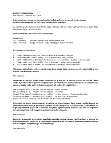 ŻYCIORYS ZAWODOWY Aktualny na 1 czerwca 2015 roku Imię, nazwisko, zajmowane stanowisko lub funkcje pełnione w ramach emitenta oraz termin upływu kadencji, na jaką dana osoba została powołana Andrzej Kurowski, Członek Rady Nadzorczej, kadencja upływa wraz z upływem kadencji całej Rady Nadzorczej Orion Investment S.A. Opis kwalifikacji i doświadczenia zawodowego Kwalifikacje: 2011 – obecnie 2002 – obecnie Syndyk – wpis na listę pod numerem 428 Biegły rewident – wpis na listę pod numerem 9813 Doświadczenie zawodowe: 1993 – 1997 Regionalna Izba Obrachunkowa w Krakowie – kontrola 1997 –1999 A&E Consult Spółka z o.o. w Warszawie – audyt, analizy 1999 – 2003 Telefony Brzeskie S.A./ Telenet Sp. z o.o. w Mielcu – budżet, rachunkowość 2004 – nadal Lexus Audit Spółka z o.o. w Krakowie – audyt, analizy, podatki 2011 – nadal Sanacja Spółka z o.o. w Krakowie – upadłości, nadzory sądowe Wskazanie działalności wykonywanej przez daną osobę poza emitentem, gdy działalność ta ma istotne znaczenie dla emitenta Nie wykonuje Wskazanie wszystkich spółek prawa handlowego, w których, w okresie ostatnich trzech lat, dana osoba była członkiem organów zarządzających lub nadzorczych albo wspólnikiem, ze wskazaniem, czy dana osoba nadal pełni funkcje w organach lub jest nadal wspólnikiem Lexus Audit sp. z o.o. – od 2004 roku do obecnie - Prezes Zarządu Lexus Audit sp. z o.o. – od 2004 roku do obecnie – wspólnik Sanacja A.Kurowski, T.Łabuda sp. z o.o. – od 2011 roku do obecnie – Vice Prezes Zarządu Sanacja A.Kurowski, T.Łabuda sp. z o.o. – od 2011 roku do obecnie – wspólnik Aupro sp. z o.o. w likwidacji – od 2013 roku do 2014 roku - likwidator Informacje na temat prawomocnych wyroków, na mocy których dana osoba została skazana za przestępstwa oszustwa w okresie co najmniej ostatnich pięciu lat oraz wskazanie, czy w okresie co najmniej ostatnich pięciu lat osoba taka otrzymała sądowy zakaz działania jako członek organów zarządzających lub nadzorczych w spółkach prawa handlowego Nie występują Szczegóły wszystkich przypadków upadłości, zarządu komisarycznego lub likwidacji, w okresie co najmniej ostatnich pięciu lat, w odniesieniu do podmiotów, w których dana osoba pełniła funkcje członka organu zarządzającego lub nadzorczego Nie występują Informacje, czy dana osoba prowadzi działalność, która jest konkurencyjna w stosunku do działalności emitenta, oraz czy jest wspólnikiem konkurencyjnej spółki cywilnej lub osobowej albo członkiem organu spółki kapitałowej lub członkiem organu jakiejkolwiek konkurencyjnej osoby prawnej Nie prowadzi oraz nie jest Informacje, czy dana osoba figuruje w rejestrze dłużników niewypłacalnych, prowadzonym na podstawie ustawy z dnia 20 sierpnia 1997 r. o Krajowym Rejestrze Sadowym Nie figuruje