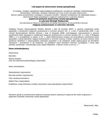List poparcia utworzenia nowej specjalizacji. W związku z brakiem specjalizacji odpowiadającej kwalifikacjom zawodow ym biologów, biotechnologów, biochemików, biofizyków, biologów molekular nych oraz innych zaw odów pokrew nych, któr ych zakres przedmiotowy wynikający z programu studiów i nabytych kompetencji nie odpowiada żadnej z utworzonych dotąd specjalizacji a mających zastosowanie w ochronie zdrowia, popieram postulat utworzenia nowej specjalizacji, w zakresie Biologii Medycznej (lub alternatywnie Medycyny Molekularnej lub Biologii Mo lekularnej, do decyzji Min istra Zdrowia) mającej zastosowanie w ochronie zdrowia. Podstawa Prawna: Rozporządzenie Ministra Zdrowia z dnia 30 września 2002r. w sprawie uzyskiwania tytułu specjalisty w dziedzinach mających zastosowanie w ochronie zdrowia. (Dz. U. z dnia 17 października 2002 r.) jak również Rozporządzenie Ministra Zdrowia z dnia 14 listopada 2008r, zmieniającego rozporządzenie w sprawie uzyskiwania tytułu specjalisty w dziedzinach mających zastosowanie w ochronie zdrowia (Dz. U. z dnia 27 listopada 2008 r.), a w szczególności w zapisie: § 34. 1. „Jeżeli dotychczasowe przepisy nie przewidywał y uzyskiwania tytułu specjalisty w danej dziedzinie mającej zastosowanie w ochronie zdrowia, minister właściwy do spraw zdrowia może powierzyć określone w rozporządzeniu obowiązki specjalisty w tej dziedzinie osobie legitymującej się dorobkiem naukowym i zawodowym w tej dziedzinie, na podstawie opinii Dyrektora Centrum wynikającej z oceny tego dorobku naukowego i zawodowego przez zespół ekspertów, o którym mowa w § 8 ust. 1.” Dane wnioskodawcy: Imię/imiona: ……………………………………………………………………. Nazwisko: ……………………………………………………………………. Dowód osobisty: ……………………………………………………………………. (lub inny dokument potwierdzający tożsamość) Adres zamieszkania: ……………………………………………………………………. Wykształcenie (opcjonalnie): ……………………………………………………………………. Kierunek studiów (opcjonalnie): ……………………………………………………………………. Tytuł naukowy/zawodow y: ……………………………………………………………………. Zakład Pracy (opcjonalnie): ……………………………………………………………………. Dodatkowe uwagi dotyczące w niosku utworzenia nowej specjalizacji (opcjonalnie): ……………………………………………………………………. Wyrażam zgodę na przetwarzanie podanych powyżej danych osobowych wyłącznie dla celów związanych z poparciem postulatu utworzenia nowej specjalizacji. ……………………………………………………. Miejscowość, Data. ……………………………………………………. Podpis. Lista poparcia utworzenia nowej specjalizacji. W związku z brakiem specjalizacji odpowiadającej kwalifikacjom zawodow ym biologów, biotechnologów, biochemików, biofizyków, biologów molekular nych oraz innych zaw odów pokrew nych, któr ych zakres przedmiotowy wynikający z programu studiów i nabytych kompetencji nie odpowiada żadnej z utworzonych dotąd specjalizacji a mających zastosowanie w ochronie zdrowia, popieram postulat utworzenia nowej specjalizacji, w zakresie Biologii Medycznej (lub alternatywnie Medycyny Molekularnej lub Biologii Mo lekularnej, do decyzji Min istra Zdrowia) mającej zastosowanie w ochronie zdrowia. Podstawa Prawna: Rozporządzenie Ministra Zdrowia z dnia 30 września 2002r. w sprawie uzyskiwania tytułu specjalisty w dziedzinach mających zastosowanie w ochronie zdrowia. (Dz. U. z dnia 17 październ ika 2002 r.) jak również Rozporządzenie Ministra Zdrowia z dnia 14 listopada 2008r, zmieniającego rozporządzenie w sprawie uzyskiwania tytułu specjalisty w dziedzinach mających zastosowanie w ochronie zdrowia (Dz. U. z dnia 27 listopada 2008 r.), a w szczególności w zapisie: § 34. 1. „Jeżeli dotychczasowe przepisy nie przewidywały uzyskiwania tytułu specjalisty w danej dziedzinie mającej zastosowanie w ochronie zdrowia, minister właściwy do spraw zdrowia może powierzyć określone w rozporządzeniu obowiązki specjalisty w tej dziedzinie osobie legitymującej się dorobkiem naukowym i zawodowym w tej dziedzinie, na podstawie opinii Dyrektora Centrum wynikającej z oceny tego dorobku naukowego i zawodowego przez zespół ekspertów, o którym mowa w § 8 ust. 1.” Wyrażam zgodę na przetwarzanie podanych poniżej danych osobowych wyłącznie dla celów związanych z poparciem postulatu utworzenia nowej specjalizacji. N r. Imię i nazwiskoczytelnie Dowód osobisty lub inny dokument potwierdzający tożsamość Adres miejsca zamieszkania Telefon, e-mail (dane kontaktowe) Zakład Pracy Wykształcenie, Kierunek studiów (opcjonalnie) (opcjonalnie) Miejscowość, data, podpis 1 2 3 4 5 6 7 8 9 10 Dane osoby zbierającej podpisy poparcia: ………………………………………… Podpis osoby zbierającej dane. WYTYCZNE ZGŁOSZENIA: 1. Proszę wykonać kopię listu – dla siebie, 2. Wypełniony formularz poparcia powinien zostać przesłany alternatyw nie: • • albo bezpośrednio do Ministerstwa Zdrowia z informacją na kopercie, że „list stanowi uzupełnienie do postulatu utw orzenia nowej specjalizacji w zakresie biologii medycznej z dnia 05.07.2010, złożonego przez Adama Master w kancelarii Ministerstwa Zdrowia przy ul. Miodowej 15, 00950 Warszawa, lub też proszę o przesłanie niniejszych dokumentów do mnie bezpośrednio, tak bym mógł uporządkować listę i przesłać ją jako uzupełnienie: Adam Master, ul. Ceglars ka 27 lok. 11, 30-362 Kraków. Byłbym wdzięczny za wszelką pomoc w zakresie zbierania dokumentacji dla Ministerstwa Zdrowia w powyższej sprawie. Z poważ