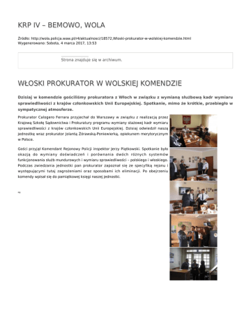 KRP IV – BEMOWO, WOLA Źródło: http://wola.policja.waw.pl/r4/aktualnosci/18572,Wloski-prokurator-w-wolskiej-komendzie.html Wygenerowano: Sobota, 4 marca 2017, 13:53 Strona znajduje się w archiwum. WŁOSKI PROKURATOR W WOLSKIEJ KOMENDZIE Dzisiaj w komendzie gościliśmy prokuratora z Włoch w związku z wymianą służbową kadr wymiaru sprawiedliwości z krajów członkowskich Unii Europejskiej. Spotkanie, mimo że krótkie, przebiegło w sympatycznej atmosferze. Prokurator Calogero Ferrara przyjechał do Warszawy w związku z realizacją przez Krajową Szkołę Sądownictwa i Prokuratury programu wymiany stażowej kadr wymiaru sprawiedliwości z krajów członkowskich Unii Europejskiej. Dzisiaj odwiedził naszą jednostkę wraz prokurator Jolantą Żórawską-Poniewierką, opiekunem merytorycznym w Polsce. Gości przyjął Komendant Rejonowy Policji inspektor Jerzy Piątkowski. Spotkanie było okazją do wymiany doświadczeń i porównania dwóch różnych systemów funkcjonowania służb mundurowych i wymiaru sprawiedliwości – polskiego i włoskiego. Podczas zwiedzania jednostki pan prokurator zapoznał się ze specyfiką rejonu i występującymi tutaj zagrożeniami oraz sposobami ich eliminacji. Po obejrzeniu komendy wpisał się do pamiątkowej księgi naszej jednostki. eg Ocena: 0/5 (0) Tweetnij