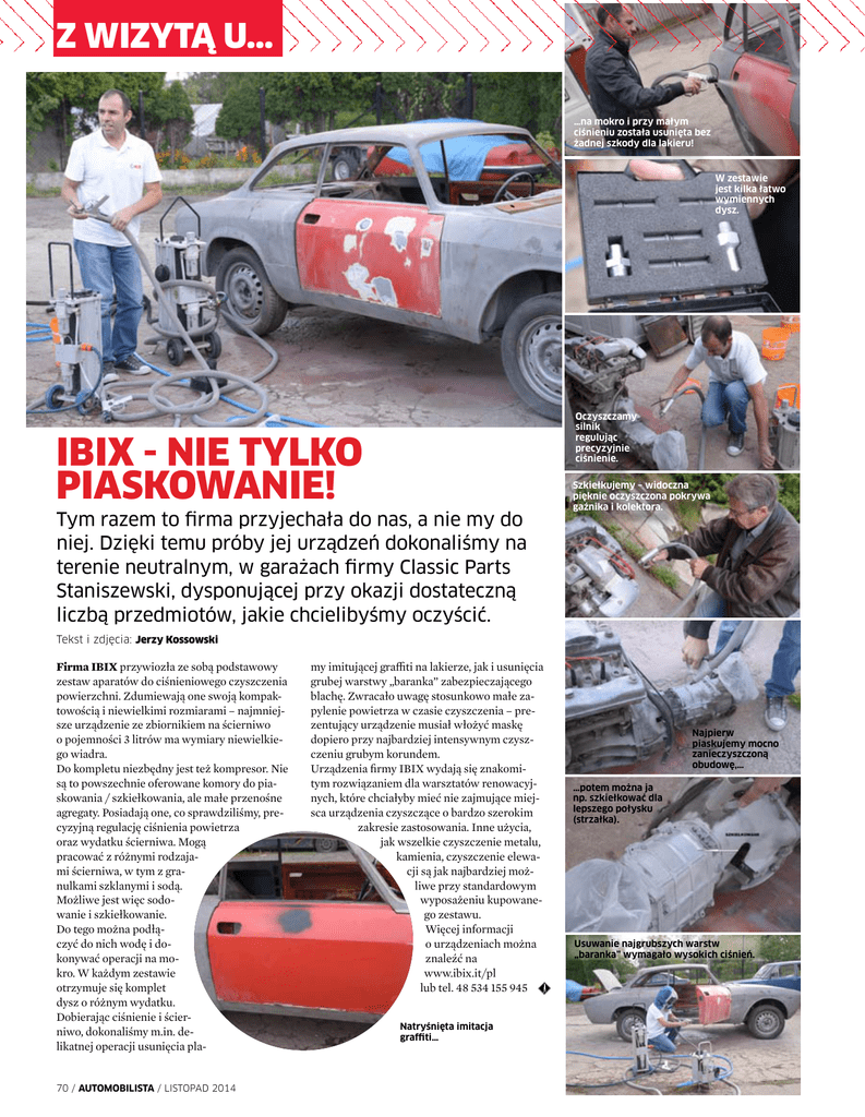 Z WIZYTĄ U... …na mokro i przy małym ciśnieniu została usunięta bez żadnej szkody dla lakieru! W zestawie jest kilka łatwo wymiennych dysz. Oczyszczamy silnik regulując precyzyjnie ciśnienie. IBIX - nie tylko piaskowanie! Tym razem to firma przyjechała do nas, a nie my do niej. Dzięki temu próby jej urządzeń dokonaliśmy na terenie neutralnym, w garażach firmy Classic Parts Staniszewski, dysponującej przy okazji dostateczną liczbą przedmiotów, jakie chcielibyśmy oczyścić. Szkiełkujemy – widoczna pięknie oczyszczona pokrywa gaźnika i kolektora. Tekst i zdjęcia: Jerzy Kossowski Firma IBIX przywiozła ze sobą podstawowy zestaw aparatów do ciśnieniowego czyszczenia powierzchni. Zdumiewają one swoją kompaktowością i niewielkimi rozmiarami – najmniejsze urządzenie ze zbiornikiem na ścierniwo o pojemności 3 litrów ma wymiary niewielkiego wiadra. Do kompletu niezbędny jest też kompresor. Nie są to powszechnie oferowane komory do piaskowania / szkiełkowania, ale małe przenośne agregaty. Posiadają one, co sprawdziliśmy, precyzyjną regulację ciśnienia powietrza oraz wydatku ścierniwa. Mogą pracować z różnymi rodzajami ścierniwa, w tym z granulkami szklanymi i sodą. Możliwe jest więc sodowanie i szkiełkowanie. Do tego można podłączyć do nich wodę i dokonywać operacji na mokro. W każdym zestawie otrzymuje się komplet dysz o różnym wydatku. Dobierając ciśnienie i ścierniwo, dokonaliśmy m.in. delikatnej operacji usunięcia pla70 / AUTOMOBILISTA / listopad 2014 my imitującej graffiti na lakierze, jak i usunięcia grubej warstwy „baranka” zabezpieczającego blachę. Zwracało uwagę stosunkowo małe zapylenie powietrza w czasie czyszczenia – prezentujący urządzenie musiał włożyć maskę dopiero przy najbardziej intensywnym czyszczeniu grubym korundem. Urządzenia firmy IBIX wydają się znakomitym rozwiązaniem dla warsztatów renowacyjnych, które chciałyby mieć nie zajmujące miejsca urządzenia czyszczące o bardzo szerokim zakresie zastosowania. Inne użycia, jak wszelkie czyszczenie metalu, kamienia, czyszczenie elewacji są jak najbardziej możliwe przy standardowym wyposażeniu kupowanego zestawu. Więcej informacji o urządzeniach można znaleźć na www.ibix.it/pl lub tel. 48 534 155 945 Natryśnięta imitacja graffiti… Najpierw piaskujemy mocno zanieczyszczoną obudowę,… …potem można ja np. szkiełkować dla lepszego połysku (strzałka). Usuwanie najgrubszych warstw „baranka” wymagało wysokich ciśnień.