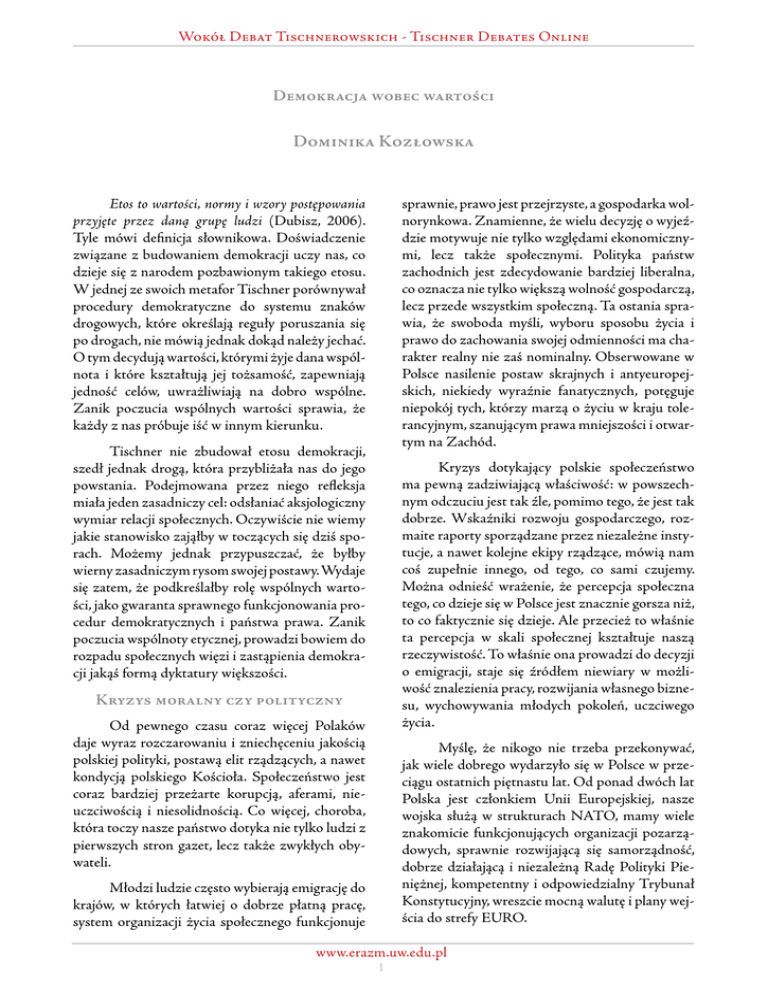 Wokół Debat Tischnerowskich - Tischner Debates Online Demokracja wobec wartości Dominika Kozłowska sprawnie, prawo jest przejrzyste, a gospodarka wolnorynkowa. Znamienne, że wielu decyzję o wyjeździe motywuje nie tylko względami ekonomicznymi, lecz także społecznymi. Polityka państw zachodnich jest zdecydowanie bardziej liberalna, co oznacza nie tylko większą wolność gospodarczą, lecz przede wszystkim społeczną. Ta ostania sprawia, że swoboda myśli, wyboru sposobu życia i prawo do zachowania swojej odmienności ma charakter realny nie zaś nominalny. Obserwowane w Polsce nasilenie postaw skrajnych i antyeuropejskich, niekiedy wyraźnie fanatycznych, potęguje niepokój tych, którzy marzą o życiu w kraju tolerancyjnym, szanującym prawa mniejszości i otwartym na Zachód. Etos to wartości, normy i wzory postępowania przyjęte przez daną grupę ludzi (Dubisz, 2006). Tyle mówi definicja słownikowa. Doświadczenie związane z budowaniem demokracji uczy nas, co dzieje się z narodem pozbawionym takiego etosu. W jednej ze swoich metafor Tischner porównywał procedury demokratyczne do systemu znaków drogowych, które określają reguły poruszania się po drogach, nie mówią jednak dokąd należy jechać. O tym decydują wartości, którymi żyje dana wspólnota i które kształtują jej tożsamość, zapewniają jedność celów, uwrażliwiają na dobro wspólne. Zanik poczucia wspólnych wartości sprawia, że każdy z nas próbuje iść w innym kierunku. Tischner nie zbudował etosu demokracji, szedł jednak drogą, która przybliżała nas do jego powstania. Podejmowana przez niego refleksja miała jeden zasadniczy cel: odsłaniać aksjologiczny wymiar relacji społecznych. Oczywiście nie wiemy jakie stanowisko zająłby w toczących się dziś sporach. Możemy jednak przypuszczać, że byłby wierny zasadniczym rysom swojej postawy. Wydaje się zatem, że podkreślałby rolę wspólnych wartości, jako gwaranta sprawnego funkcjonowania procedur demokratycznych i państwa prawa. Zanik poczucia wspólnoty etycznej, prowadzi bowiem do rozpadu społecznych więzi i zastąpienia demokracji jakąś formą dyktatury większości. Kryzys dotykający polskie społeczeństwo ma pewną zadziwiającą właściwość: w powszechnym odczuciu jest tak źle, pomimo tego, że jest tak dobrze. Wskaźniki rozwoju gospodarczego, rozmaite raporty sporządzane przez niezależne instytucje, a nawet kolejne ekipy rządzące, mówią nam coś zupełnie innego, od tego, co sami czujemy. Można odnieść wrażenie, że percepcja społeczna tego, co dzieje się w Polsce jest znacznie gorsza niż, to co faktycznie się dzieje. Ale przecież to właśnie ta percepcja w skali społecznej kształtuje naszą rzeczywistość. To właśnie ona prowadzi do decyzji o emigracji, staje się źródłem niewiary w możliwość znalezienia pracy, rozwijania własnego biznesu, wychowywania młodych pokoleń, uczciwego życia. Kryzys moralny czy polityczny Od pewnego czasu coraz więcej Polaków daje wyraz rozczarowaniu i zniechęceniu jakością polskiej polityki, postawą elit rządzących, a nawet kondycją polskiego Kościoła. Społeczeństwo jest coraz bardziej przeżarte korupcją, aferami, nieuczciwością i niesolidnością. Co więcej, choroba, która toczy nasze państwo dotyka nie tylko ludzi z pierwszych stron gazet, lecz także zwykłych obywateli. Myślę, że nikogo nie trzeba przekonywać, jak wiele dobrego wydarzyło się w Polsce w przeciągu ostatnich piętnastu lat. Od ponad dwóch lat Polska jest członkiem Unii Europejskiej, nasze wojska służą w strukturach NATO, mamy wiele znakomicie funkcjonujących organizacji pozarządowych, sprawnie rozwijającą się samorządność, dobrze działającą i niezależną Radę Polityki Pieniężnej, kompetentny i odpowiedzialny Trybunał Konstytucyjny, wreszcie mocną walutę i plany wejścia do strefy EURO. Młodzi ludzie często wybierają emigrację do krajów, w których łatwiej o dobrze płatną pracę, system organizacji życia społecznego funkcjonuje www.erazm.uw.edu.pl Wokół Debat Tischnerowskich - Tischner Debates Online Okazuje się jednak, że osiągnięcia, o których piętnaście lat temu nawet nie śmieliśmy marzyć, nie przyczyniają się do poprawy nastrojów społecznych, wręcz przeciwnie, pogłębiają naszą frustrację. Kolejne ekipy rządzące odchodzą w atmosferze skandalu, obwiniając się wzajemnie o katastrofalny stan finansów publicznych, upadek autorytetu państwa i społecznego zaufania do instytucji publicznych. Wydaje się zatem, że źródeł problemu nie odnajdziemy analizując tylko i wyłącznie wskaźniki gospodarcze, badając tempo reform czy śledząc decyzje polityczne kolejnych ekip rządzących. Okazuje się bowiem, że coraz więcej Polaków zwraca uwagę na fakt, że kryzys, o jakim mowa, ma przede wszystkim wymiar moralny, nie zaś polityczny. wolny od grzechów, o które oskarża innych. Skoro są tacy wyborcy, muszą się znaleźć politycy, którzy wyrażają ich mniemania (Tischner, 1993, s. 154). Pytania które mnożą się, gdy tylko wkroczymy w obszar refleksji nad stanem polskiego społeczeństwa, stawiane są dziś przez wielu. Tym bardziej niepokojące jest to, że zamiast odpowiedzi i konkretnych wskazówek jak zaradzić nasilającym się problemom, pozostajemy coraz bardziej zagubieni, bliscy utraty wiary w to, że uda się znaleźć jakieś wyjście z impasu. Pojawiające się odpowiedzi są bowiem zwykle niesatysfakcjonujące i nie motywują do działania. Być może zatem warto się zastanowić, czy przypadkiem choroba, która toczy polski naród, nie zniekształciła naszego sposobu myślenia, do tego stopnia, że to nie odpowiedzi, które udzielamy, lecz głębiej, pytania, które stawiamy, są niewłaściwe? Być może błędny jest sam sposób myślenia, krótkowzroczny, powierzchowny, niekonsekwentny, nakierowany na efektowność, pozbawiony odniesienia do wartości? 