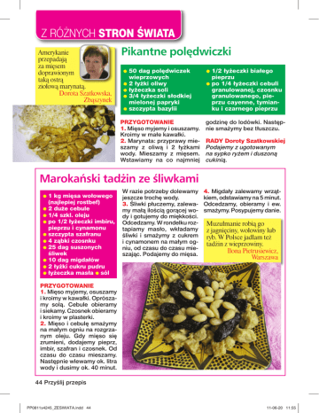 Z RÓŻNYCH STRON ŚWIATA Amerykanie przepadają za mięsem doprawionym taką ostrą ziołową marynatą. Dorota Szatkowska, Zbąszynek Pikantne polędwiczki ● ● ● ● ● 50 dag polędwiczek wieprzowych 2 łyżki oliwy łyżeczka soli 3/4 łyżeczki słodkiej mielonej papryki szczypta bazylii PRZYGOTOWANIE 1. Mięso myjemy i osuszamy. Kroimy w małe kawałki. 2. Marynata: przyprawy mieszamy z oliwą i 2 łyżkami wody. Mieszamy z mięsem. Wstawiamy na co najmniej ● ● 1/2 łyżeczki białego pieprzu po 1/4 łyżeczki cebuli granulowanej, czosnku granulowanego, pieprzu cayenne, tymianku i czarnego pieprzu godzinę do lodówki. Następnie smażymy bez tłuszczu. RADY Doroty Szatkowskiej Podajemy z ugotowanym na sypko ryżem i duszoną cukinią. Marokański tadżin ze śliwkami 1 kg mięsa wołowego (najlepiej rostbef) ● 2 duże cebule ● 1/4 szkl. oleju ● po 1/2 łyżeczki imbiru, pieprzu i cynamonu ● szczypta szafranu ● 4 ząbki czosnku ● 25 dag suszonych śliwek ● 10 dag migdałów ● 2 łyżki cukru pudru ● łyżeczka masła ● sól ● W razie potrzeby dolewamy jeszcze trochę wody. 3. Śliwki płuczemy, zalewamy małą ilością gorącej wody i gotujemy do miękkości. Odcedzamy. W rondelku roztapiamy masło, wkładamy śliwki i smażymy z cukrem i cynamonem na małym ogniu, od czasu do czasu mieszając. Podajemy do mięsa. 4. Migdały zalewamy wrzątkiem, odstawiamy na 5 minut. Odcedzamy, obieramy i ew. smażymy. Posypujemy danie. Muzułmanie robią go z jagnięciny, wołowiny lub ryb. W Polsce jadłam też tadżin z wieprzowiny. Ilona Pietrusiewicz, Warszawa PRZYGOTOWANIE 1. Mięso myjemy, osuszamy i kroimy w kawałki. Oprószamy solą. Cebule obieramy i siekamy. Czosnek obieramy i kroimy w plasterki. 2. Mięso i cebulę smażymy na małym ogniu na rozgrzanym oleju. Gdy mięso się zrumieni, dodajemy pieprz, imbir, szafran i czosnek. Od czasu do czasu mieszamy. Następnie wlewamy ok. litra wody i dusimy ok. 40 minut. 44 Przyślij przepis PP0811s4245_ZESWIATA.indd 44 11-06-20 11:55