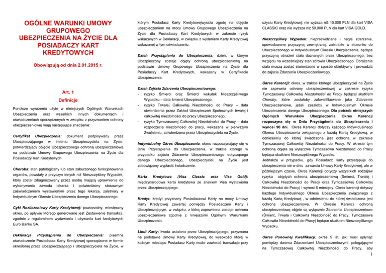 OGÓLNE WARUNKI UMOWY GRUPOWEGO UBEZPIECZENIA NA ŻYCIE DLA POSIADACZY KART KREDYTOWYCH Obowiązują od dnia 2.01.2015 r. Art. 1 Definicje Poniższe wyrażenia użyte w niniejszych Ogólnych Warunkach Ubezpieczenia oraz wszelkich innych dokumentach i oświadczeniach sporządzonych w związku z przyznaniem ochrony ubezpieczeniowej mają następujące znaczenie: Certyfikat Ubezpieczenia: dokument podpisywany przez Ubezpieczającego w imieniu Ubezpieczyciela na Życie, potwierdzający objęcie Ubezpieczonego ochroną ubezpieczeniową na podstawie Umowy Grupowego Ubezpieczenia na Życie dla Posiadaczy Kart Kredytowych Choroba: stan patologiczny lub stan zaburzonego funkcjonowania organów, powstały z przyczyn innych niż Nieszczęśliwy Wypadek, który został zdiagnozowany przez osobę mającą uprawnienia do wykonywania zawodu lekarza i potwierdzony stosownym zaświadczeniem wystawionym przez tego lekarza, zaistniały w Indywidualnym Okresie Ubezpieczenia danego Ubezpieczonego. Cykl Rozliczeniowy Karty Kredytowej: powtarzalny, miesięczny okres, po upływie którego generowane jest Zestawienie transakcji, zgodnie z regulaminem wydawania i używania kart kredytowych Euro Banku SA. Deklaracja Przystąpienia do Ubezpieczenia: pisemne oświadczenie Posiadacza Karty Kredytowej sporządzone w formie określonej przez Ubezpieczającego i Ubezpieczyciela na Życie, w którym Posiadacz Karty Kredytowejwyraża zgodę na objęcie ubezpieczeniem na mocy Umowy Grupowego Ubezpieczenia na Życie dla Posiadaczy Kart Kredytowych w zakresie ryzyk wskazanych w Deklaracji, w związku z wydaniem Karty Kredytowej wskazanej w tym oświadczeniu. Dzień Przystąpienia do Ubezpieczenia: dzień, w którym Ubezpieczony zostaje objęty ochroną ubezpieczeniową na podstawie Umowy Grupowego Ubezpieczenia na Życie dla Posiadaczy Kart Kredytowych, wskazany w Certyfikacie Ubezpieczenia. Dzień Zajścia Zdarzenia Ubezpieczeniowego: - ryzyko Śmierci oraz Śmierci wskutek Nieszczęśliwego Wypadku – data śmierci Ubezpieczonego, - ryzyko Trwałej Całkowitej Niezdolności do Pracy – data stwierdzenia przez Zakład Ubezpieczeń Społecznych trwałej i całkowitej niezdolności do pracy Ubezpieczonego, - ryzyko Tymczasowej Całkowitej Niezdolności do Pracy – data rozpoczęcia niezdolności do pracy, wskazana w pierwszym Zwolnieniu, zatwierdzona przez Ubezpieczyciela na Życie. Indywidualny Okres Ubezpieczenia: okres rozpoczynający się w Dniu Przystąpienia do Ubezpieczenia, w trakcie którego w przypadku zajścia Zdarzenia Ubezpieczeniowego dotyczącego danego Ubezpieczonego, Ubezpieczyciel na Życie jest zobowiązany wypłacić świadczenie. Karta Kredytowa (Visa Classic oraz Visa Gold): międzynarodowa karta kredytowa ze znakiem Visa wystawiona przez Ubezpieczającego. Kredyt: kredyt przyznany Posiadaczowi Karty na mocy Umowy Karty Kredytowej zawartej pomiędzy Posiadaczem Karty i Ubezpieczającym, w związku, z którą zapewniona zostaje ochrona ubezpieczeniowa zgodnie z niniejszymi Ogólnymi Warunkami Ubezpieczenia. Limit Karty: kwota ustalona przez Ubezpieczającego, przyznana na podstawie Umowy Karty Kredytowej, do wysokości której w każdym miesiącu Posiadacz Karty może zawierać transakcje przy użyciu Karty Kredytowej; nie wyższa niż 10.000 PLN dla kart VISA CLASSIC oraz nie wyższa niż 50.000 PLN dla kart VISA GOLD. Nieszczęśliwy Wypadek: nieprzewidziane i nagłe zdarzenie, spowodowane przyczyną zewnętrzną, zaistniałe w stosunku do Ubezpieczonego w Indywidualnym Okresie Ubezpieczenia, będące przyczyną obrażeń ciała doznanych przez Ubezpieczonego, bez względu na wcześniejszy stan zdrowia Ubezpieczonego. Obrażenia ciała muszą zostać stwierdzone w sposób obiektywny i prowadzić do zajścia Zdarzenia Ubezpieczeniowego. Okres Karencji: okres, w trakcie którego Ubezpieczyciel na Życie nie zapewnia ochrony ubezpieczeniowej w zakresie ryzyka Tymczasowej Całkowitej Niezdolności do Pracy będącej skutkiem Choroby, które zostałoby zakwalifikowane jako Zdarzenie Ubezpieczeniowe, jeżeli zaszłoby w Indywidualnym Okresie Ubezpieczenia danego Ubezpieczonego. Dla potrzeb niniejszych Ogólnych Warunków Ubezpieczenia Okres Karencji rozpoczyna się w Dniu Przystąpienia do Ubezpieczenia i wynosi 90 dni. Okres Karencji dotyczy każdego Indywidualnego Okresu Ubezpieczenia związanego z każdą Kartą Kredytową, w odniesieniu do której świadczona jest ochrona w zakresie Tymczasowej Całkowitej Niezdolności do Pracy. W okresie tym ochroną objęta są wyłącznie Tymczasowa Niezdolność do Pracy będąca skutkiem Nieszczęśliwego Wypadku. Jednakże w przypadku, gdy Posiadacz Karty przystępuje do ubezpieczenia nie w dniu zawarcia Umowy Karty Kredytowej, ale w późniejszym czasie, Okres Karencji dotyczy wszystkich rodzajów ryzyka objętych ochroną ubezpieczeniową (Śmierci, Trwałej i Całkowitej Niezdolności do Pracy oraz Tymczasowej Całkowitej Niezdolności do Pracy) i wynosi 6 miesięcy. Okres karencji dotyczy każdego Indywidualnego Okresu Ubezpieczenia związanego z każdą Kartą Kredytową , w odniesieniu do której świadczona jest ochrona ubezpieczeniowa. W Okresie Karencji ochroną ubezpieczeniową objęte są wyłącznie Zdarzenia Ubezpieczeniowe (Śmierć, Trwała i Całkowita Niezdolność do Pracy, Tymczasowa Całkowita Niezdolność do Pracy) będące skutkiem Nieszczęśliwego Wypadku. Okres Ponownej Kwalifikacji: okres 5 lat, jaki musi upłynąć pomiędzy dwoma Zdarzeniami Ubezpieczeniowymi, polegającymi na Tymczasowej Całkowitej Niezdolności do Pracy, aby 1 Ubezpieczony był uprawniony do otrzymania świadczenia za późniejsze z tych dwóch Zdarzeń Ubezpieczeniowych; okres ten liczy się począwszy od 30 dnia po dacie zapłaty ostatniego świadczenia należnego z tytułu poprzedniego Zdarzenia Ubezpieczeniowego. Posiadacz Karty: osoba fizyczna, której dane osobowe są umieszczone na Karcie Kredytowej, z którą Ubezpieczający zawarł Umowę Karty Kredytowej