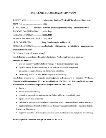FORMULARZ DLA OGŁOSZENIODAWCÓW INSTYTUCJA:................................. Uniwersytet Łódzki, Wydział Filozoficzno-Historyczny MIASTO: .......................................... Łódź STANOWISKO: … adiunkt – Katedra Archeologii Historycznej i Bronioznawstwa DYSCYPLINA NAUKOWA: ..... archeologia DATA OGŁOSZENIA: ................ 28.01.2015 TERMIN SKŁADANIA OFERT: 18.02.2015 LINK DO STRONY: ................. http://archeologia.uni.lodz.pl/ SŁOWA KLUCZOWE: .................archeologia historyczna, architektura przemysłowa, architektura sakralna OPIS (tematyka, oczekiwania, uwagi): Kandydaci na stanowisko adiunkta w Instytucie Archeologii powinni spełniać następujące kryteria: stopień naukowy doktora habilitowanego w dyscyplinie archeologia; opublikowany dorobek naukowy w zakresie archeologii historycznej; co najmniej pięcioletni staż na stanowisku adiunkta; ukończony kurs z zakresu badań zabytków architektury Kandydaci proszeni są o złożenie następujących dokumentów w siedzibie Wydziału Filozoficzno-Historycznego UŁ, ul. Kamińskiego 27a, 90–210 Łódź, pokój 05 (parter), osobiście lub listownie w nieprzekraczalnym terminie 18.02.2015. życiorys kwestionariusz osobowy podanie o zatrudnienie skierowane do Rektora Uniwersytetu Łódzkiego opinia kierownika jednostki informacja o działalności naukowej, organizacyjnej i społecznej oraz wykaz publikacji odpis dyplomu doktora habilitowanego lub zaświadczenie jednostki o nadaniu stopnia doktora habilitowanego kopia świadectwa (dyplomu) ukończenia kursu z zakresu badań zabytków architektury Rozstrzygnięcie konkursu nastąpi do dnia: 24.02.2015.