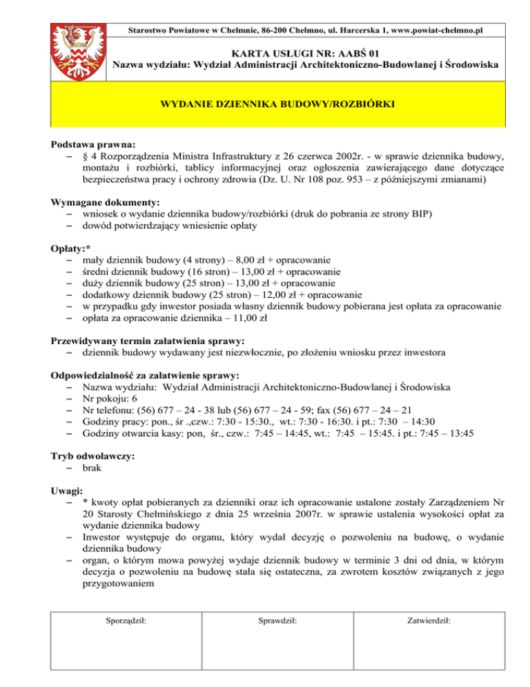 Starostwo Powiatowe w Chełmnie, 86-200 Chełmno, ul. Harcerska 1, www.powiat-chelmno.pl KARTA USŁUGI NR: AABŚ 01 Nazwa wydziału: Wydział Administracji Architektoniczno-Budowlanej i Środowiska WYDANIE DZIENNIKA BUDOWY/ROZBIÓRKI Podstawa prawna: – § 4 Rozporządzenia Ministra Infrastruktury z 26 czerwca 2002r. - w sprawie dziennika budowy, montażu i rozbiórki, tablicy informacyjnej oraz ogłoszenia zawierającego dane dotyczące bezpieczeństwa pracy i ochrony zdrowia (Dz. U. Nr 108 poz. 953 – z późniejszymi zmianami) Wymagane dokumenty: – wniosek o wydanie dziennika budowy/rozbiórki (druk do pobrania ze strony BIP) – dowód potwierdzający wniesienie opłaty Opłaty:* – mały dziennik budowy (4 strony) – 8,00 zł + opracowanie – średni dziennik budowy (16 stron) – 13,00 zł + opracowanie – duży dziennik budowy (25 stron) – 13,00 zł + opracowanie – dodatkowy dziennik budowy (25 stron) – 12,00 zł + opracowanie – w przypadku gdy inwestor posiada własny dziennik budowy pobierana jest opłata za opracowanie – opłata za opracowanie dziennika – 11,00 zł Przewidywany termin załatwienia sprawy: – dziennik budowy wydawany jest niezwłocznie, po złożeniu wniosku przez inwestora Odpowiedzialność za załatwienie sprawy: – Nazwa wydziału: Wydział Administracji Architektoniczno-Budowlanej i Środowiska – Nr pokoju: 6 – Nr telefonu: (56) 677 – 24 - 38 lub (56) 677 – 24 - 59; fax (56) 677 – 24 – 21 – Godziny pracy: pon., śr .,czw.: 7:30 - 15:30., wt.: 7:30 - 16:30. i pt.: 7:30 – 14:30 – Godziny otwarcia kasy: pon, śr., czw.: 7:45 – 14:45, wt.: 7:45 – 15:45. i pt.: 7:45 – 13:45 Tryb odwoławczy: – brak Uwagi: – * kwoty opłat pobieranych za dzienniki oraz ich opracowanie ustalone zostały Zarządzeniem Nr 20 Starosty Chełmińskiego z dnia 25 września 2007r. w sprawie ustalenia wysokości opłat za wydanie dziennika budowy – Inwestor występuje do organu, który wydał decyzję o pozwoleniu na budowę, o wydanie dziennika budowy – organ, o którym mowa powyżej wydaje dziennik budowy w terminie 3 dni od dnia, w którym decyzja o pozwoleniu na budowę stała się ostateczna, za zwrotem kosztów związanych z jego przygotowaniem Sporządził: Sprawdził: Zatwierdził: