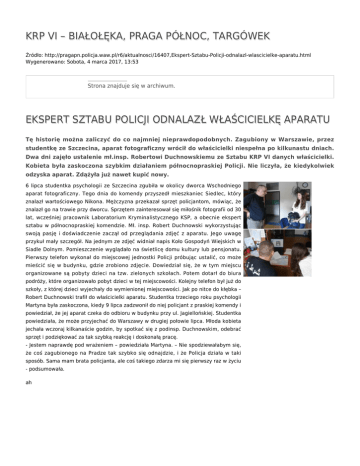 KRP VI – BIAŁOŁĘKA, PRAGA PÓŁNOC, TARGÓWEK Źródło: http://pragapn.policja.waw.pl/r6/aktualnosci/16407,Ekspert-Sztabu-Policji-odnalazl-wlascicielke-aparatu.html Wygenerowano: Sobota, 4 marca 2017, 13:53 Strona znajduje się w archiwum. EKSPERT SZTABU POLICJI ODNALAZŁ WŁAŚCICIELKĘ APARATU Tę historię można zaliczyć do co najmniej nieprawdopodobnych. Zagubiony w Warszawie, przez studentkę ze Szczecina, aparat fotograficzny wrócił do właścicielki niespełna po kilkunastu dniach. Dwa dni zajęło ustalenie mł.insp. Robertowi Duchnowskiemu ze Sztabu KRP VI danych właścicielki. Kobieta była zaskoczona szybkim działaniem północnopraskiej Policji. Nie liczyła, że kiedykolwiek odzyska aparat. Zdążyła już nawet kupić nowy. 6 lipca studentka psychologii ze Szczecina zgubiła w okolicy dworca Wschodniego aparat fotograficzny. Tego dnia do komendy przyszedł mieszkaniec Siedlec, który znalazł wartościowego Nikona. Mężczyzna przekazał sprzęt policjantom, mówiąc, że znalazł go na trawie przy dworcu. Sprzętem zainteresował się miłośnik fotografii od 30 lat, wcześniej pracownik Laboratorium Kryminalistycznego KSP, a obecnie ekspert sztabu w północnopraskiej komendzie. Mł. insp. Robert Duchnowski wykorzystując swoją pasję i doświadczenie zaczął od przeglądania zdjęć z aparatu. Jego uwagę przykuł mały szczegół. Na jednym ze zdjęć widniał napis Koło Gospodyń Wiejskich w Siadle Dolnym. Pomieszczenie wyglądało na świetlicę domu kultury lub pensjonatu. Pierwszy telefon wykonał do miejscowej jednostki Policji próbując ustalić, co może mieścić się w budynku, gdzie zrobiono zdjęcie. Dowiedział się, że w tym miejscu organizowane są pobyty dzieci na tzw. zielonych szkołach. Potem dotarł do biura podróży, które organizowało pobyt dzieci w tej miejscowości. Kolejny telefon był już do szkoły, z której dzieci wyjechały do wymienionej miejscowości. Jak po nitce do kłębka – Robert Duchnowski trafił do właścicielki aparatu. Studentka trzeciego roku psychologii Martyna była zaskoczona, kiedy 9 lipca zadzwonił do niej policjant z praskiej komendy i powiedział, że jej aparat czeka do odbioru w budynku przy ul. Jagiellońskiej. Studentka powiedziała, że może przyjechać do Warszawy w drugiej połowie lipca. Młoda kobieta jechała wczoraj kilkanaście godzin, by spotkać się z podinsp. Duchnowskim, odebrać sprzęt i podziękować za tak szybką reakcję i doskonałą pracę. - Jestem naprawdę pod wrażeniem – powiedziała Martyna. – Nie spodziewałabym się, że coś zagubionego na Pradze tak szybko się odnajdzie, i że Policja działa w taki sposób. Sama mam brata policjanta, ale coś takiego zdarza mi się pierwszy raz w życiu - podsumowała. ah Ocena: 0/5 (0) Tweetnij