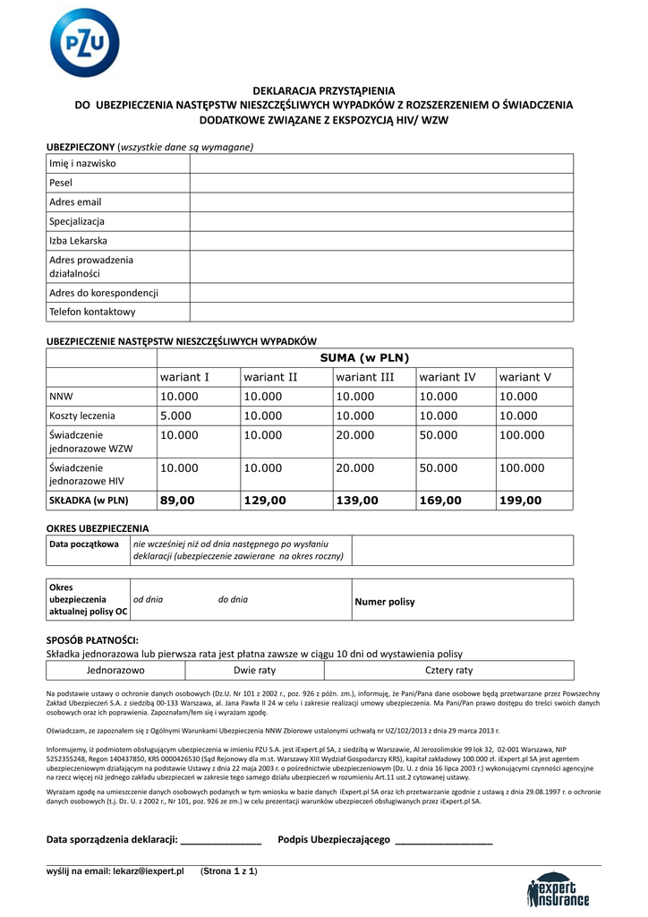 DEKLARACJA PRZYSTĄPIENIA DO UBEZPIECZENIA NASTĘPSTW NIESZCZĘŚLIWYCH WYPADKÓW Z ROZSZERZENIEM O ŚWIADCZENIA DODATKOWE ZWIĄZANE Z EKSPOZYCJĄ HIV/ WZW UBEZPIECZONY (wszystkie dane są wymagane) Imię i nazwisko Pesel Adres email Specjalizacja Izba Lekarska Adres prowadzenia działalności Adres do korespondencji Telefon kontaktowy UBEZPIECZENIE NASTĘPSTW NIESZCZĘŚLIWYCH WYPADKÓW SUMA (w PLN) wariant I wariant II wariant III wariant IV wariant V NNW 10.000 10.000 10.000 10.000 10.000 Koszty leczenia 5.000 10.000 10.000 10.000 10.000 Świadczenie jednorazowe WZW 10.000 10.000 20.000 50.000 100.000 Świadczenie jednorazowe HIV 10.000 10.000 20.000 50.000 100.000 SKŁADKA (w PLN) 89,00 129,00 139,00 169,00 199,00 OKRES UBEZPIECZENIA Data początkowa nie wcześniej niż od dnia następnego po wysłaniu deklaracji (ubezpieczenie zawierane na okres roczny) Okres ubezpieczenia od dnia aktualnej polisy OC do dnia Numer polisy SPOSÓB PŁATNOŚCI: Składka jednorazowa lub pierwsza rata jest płatna zawsze w ciągu 10 dni od wystawienia polisy Jednorazowo Dwie raty Cztery raty Na podstawie ustawy o ochronie danych osobowych (Dz.U. Nr 101 z 2002 r., poz. 926 z późn. zm.), informuję, że Pani/Pana dane osobowe będą przetwarzane przez Powszechny Zakład Ubezpieczeń S.A. z siedzibą 00-133 Warszawa, al. Jana Pawła II 24 w celu i zakresie realizacji umowy ubezpieczenia. Ma Pani/Pan prawo dostępu do treści swoich danych osobowych oraz ich poprawienia. Zapoznałam/łem się i wyrażam zgodę. Oświadczam, ze zapoznałem się z Ogólnymi Warunkami Ubezpieczenia NNW Zbiorowe ustalonymi uchwałą nr UZ/102/2013 z dnia 29 marca 2013 r. Informujemy, iż podmiotem obsługującym ubezpieczenia w imieniu PZU S.A. jest iExpert.pl SA, z siedzibą w Warszawie, Al Jerozolimskie 99 lok 32, 02-001 Warszawa, NIP 5252355248, Regon 140437850, KRS 0000426530 (Sąd Rejonowy dla m.st. Warszawy XIII Wydział Gospodarczy KRS), kapitał zakładowy 100.000 zł. iExpert.pl SA jest agentem ubezpieczeniowym działającym na podstawie Ustawy z dnia 22 maja 2003 r. o pośrednictwie ubezpieczeniowym (Dz. U. z dnia 16 lipca 2003 r.) wykonującymi czynności agencyjne na rzecz więcej niż jednego zakładu ubezpieczeń w zakresie tego samego działu ubezpieczeń w rozumieniu Art.11 ust.2 cytowanej ustawy. Wyrażam zgodę na umieszczenie danych osobowych podanych w tym wniosku w bazie danych iExpert.pl SA oraz ich przetwarzanie zgodnie z ustawą z dnia 29.08.1997 r. o ochronie danych osobowych (t.j. Dz. U. z 2002 r., Nr 101, poz. 926 ze zm.) w celu prezentacji warunków ubezpieczeń obsługiwanych przez iExpert.pl SA. Data sporządzenia deklaracji: _______________ wyślij na email: [email protected] (Strona 1 z 1) Podpis Ubezpieczającego __________________
