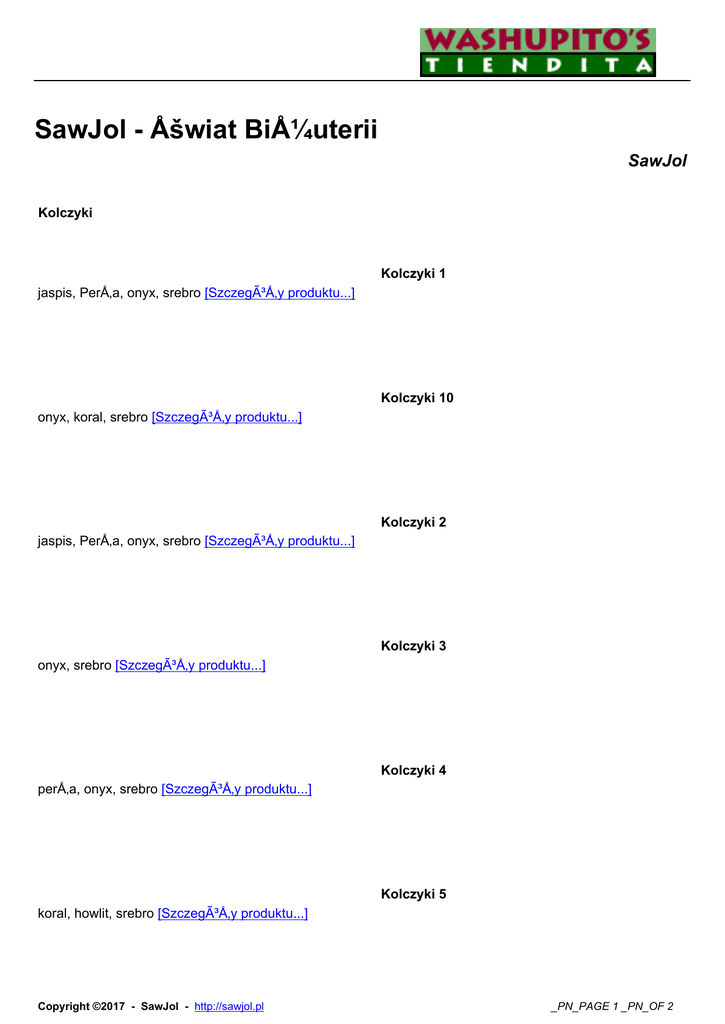 SawJol - Åšwiat Biżuterii SawJol Kolczyki Kolczyki 1 jaspis, PerÅ‚a, onyx, srebro [Szczegóły produktu...] Kolczyki 10 onyx, koral, srebro [Szczegóły produktu...] Kolczyki 2 jaspis, PerÅ‚a, onyx, srebro [Szczegóły produktu...] Kolczyki 3 onyx, srebro [Szczegóły produktu...] Kolczyki 4 perÅ‚a, onyx, srebro [Szczegóły produktu...] Kolczyki 5 koral, howlit, srebro [Szczegóły produktu...] Copyright ©2017 - SawJol - http://sawjol.pl _PN_PAGE 1 _PN_OF 2 Kolczyki 6 cytryn, onyx, srebro [Szczegóły produktu...] Kolczyki 7 muszla, onyx, metal, srebro [Szczegóły produktu...] Kolczyki 8 agat ognisty, tygrysie oko, drewno, Swarowski, srebro [Szczegóły produktu...] Kolczyki 9 kwarc, onyx, perÅ‚a, Swarowski, srebro [Szczegóły produktu...] Copyright ©2017 - SawJol - http://sawjol.pl _PN_PAGE 2 _PN_OF 2