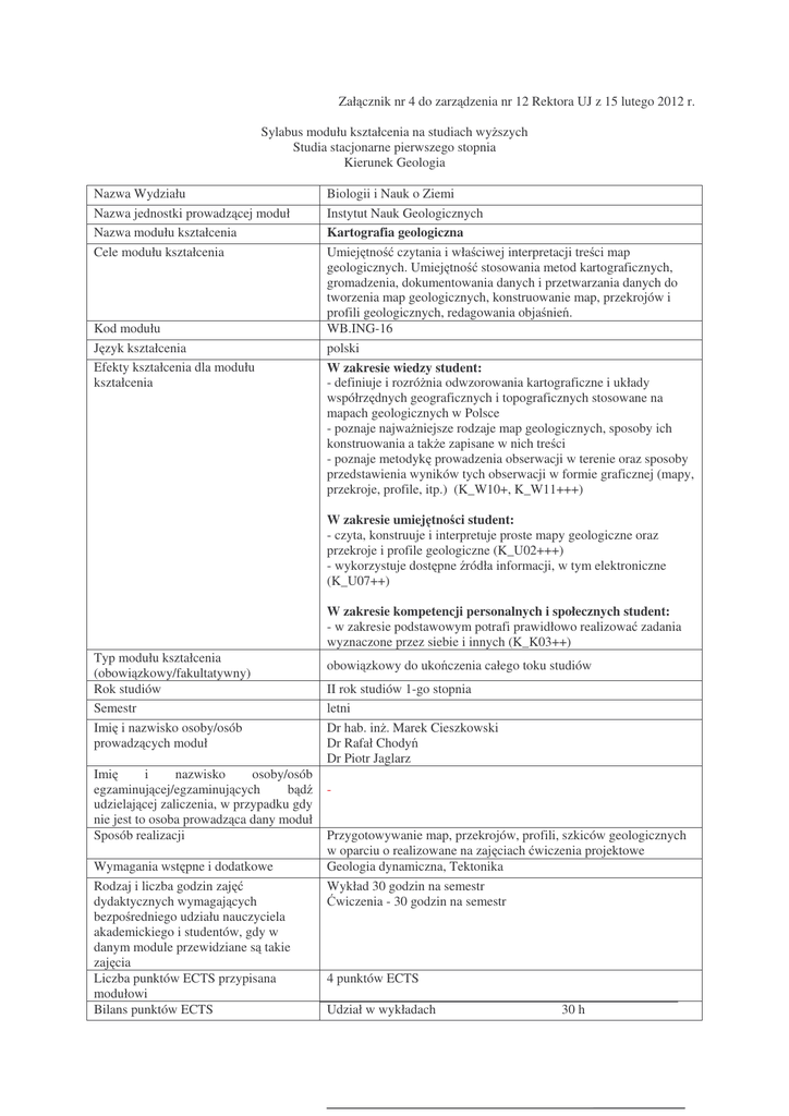 Zał cznik nr 4 do zarz dzenia nr 12 Rektora UJ z 15 lutego 2012 r. Sylabus modułu kształcenia na studiach wy szych Studia stacjonarne pierwszego stopnia Kierunek Geologia Nazwa Wydziału Nazwa jednostki prowadz cej moduł Nazwa modułu kształcenia Cele modułu kształcenia Kod modułu J zyk kształcenia Efekty kształcenia dla modułu kształcenia Biologii i Nauk o Ziemi Instytut Nauk Geologicznych Kartografia geologiczna Umiej tno czytania i wła ciwej interpretacji tre ci map geologicznych. Umiej tno stosowania metod kartograficznych, gromadzenia, dokumentowania danych i przetwarzania danych do tworzenia map geologicznych, konstruowanie map, przekrojów i profili geologicznych, redagowania obja nie . WB.ING-16 polski W zakresie wiedzy student: - definiuje i rozró nia odwzorowania kartograficzne i układy współrz dnych geograficznych i topograficznych stosowane na mapach geologicznych w Polsce - poznaje najwa niejsze rodzaje map geologicznych, sposoby ich konstruowania a tak e zapisane w nich tre ci - poznaje metodyk prowadzenia obserwacji w terenie oraz sposoby przedstawienia wyników tych obserwacji w formie graficznej (mapy, przekroje, profile, itp.) (K_W10+, K_W11+++) W zakresie umiej tno ci student: - czyta, konstruuje i interpretuje proste mapy geologiczne oraz przekroje i profile geologiczne (K_U02+++) - wykorzystuje dost pne ródła informacji, w tym elektroniczne (K_U07++) Typ modułu kształcenia (obowi zkowy/fakultatywny) Rok studiów Semestr Imi i nazwisko osoby/osób prowadz cych moduł Imi i nazwisko osoby/osób egzaminuj cej/egzaminuj cych b d udzielaj cej zaliczenia, w przypadku gdy nie jest to osoba prowadz ca dany moduł Sposób realizacji Wymagania wst pne i dodatkowe Rodzaj i liczba godzin zaj dydaktycznych wymagaj cych bezpo redniego udziału nauczyciela akademickiego i studentów, gdy w danym module przewidziane s takie zaj cia Liczba punktów ECTS przypisana modułowi Bilans punktów ECTS W zakresie kompetencji personalnych i społecznych student: - w zakresie podstawowym potrafi prawidłowo realizowa zadania wyznaczone przez siebie i innych (K_K03++) obowi zkowy do uko czenia całego toku studiów II rok studiów 1-go stopnia letni Dr hab. in . Marek Cieszkowski Dr Rafał Chody Dr Piotr Jaglarz Przygotowywanie map, przekrojów, profili, szkiców geologicznych w oparciu o realizowane na zaj ciach wiczenia projektowe Geologia dynamiczna, Tektonika Wykład 30 godzin na semestr wiczenia - 30 godzin na semestr 4 punktów ECTS Udział w wykładach 30 h Udział w wiczeniach Przygotowanie si do wicze Przygotowanie si do zaliczenia Przygotowanie si do egzaminu Suma stosowane metody dydaktyczne Metody sprawdzania i kryteria oceny efektów kształcenia uzyskanych przez studentów Forma i warunki zaliczenia modułu, w tym zasady dopuszczenia do egzaminu, zaliczenia, a tak e forma i warunki zaliczenia poszczególnych zaj wchodz cych w zakres danego modułu 30 h 10 h 10 h 25 h 105 h Kurs obejmuje 3 godziny wykładu tygodniowo w ci gu 10 tygodni oraz wiczenia praktyczne po 2 godziny tygodniowo w ci gu 15 tygodni. W ramach wykładu przedstawiane s prezentacje z u yciem komputera natomiast na wiczeniach studenci pracuj z mapami topograficznymi, geologicznymi w formie wydruków wielkoformatowych oraz z modelami przestrzennymi obrazuj cymi poszczególne typy struktur geologicznych. Dodatkowo wykorzystywane s zdj cia lotnicze (ortofotomapy) oraz zdj cia stereoskopowe. Egzamin pisemny składaj cy si z cz ci opisowej i praktycznej (graficznej) umo liwia ocen wiedzy teoretycznej z zakresu przedmiotu oraz umiej tno ci praktycznych w rozpoznawaniu i interpretowaniu podstawowych struktur geologicznych prezentowanych na mapie geologicznej. Efekty z zakresu umiej tno ci i kompetencji sprawdzane s na bie co w trakcie wicze . wiczenia: zaliczenie na ocen . Podstaw zaliczenia s wiczenia praktyczne, które oceniane s na bie co w trakcie zaj . rednia z tych wicze /projektów jest jedn z ocen branych pod uwag przy zaliczeniu ko cowym. Na ocen ko cow składaj si równie oceny z kolokwiów oraz zada praktycznych. Podstaw do dopuszczenia do egzaminu jest uzyskanie zaliczenia z wicze . Egzamin pisemny składa si z cz ci opisowej i cz ci praktycznej (graficznej/rysunkowej). Ka dy punkt egzaminu jest osobno oceniany a ocena ko cowa jest sum ocen cz stkowych. Tre ci modułu kształcenia Kartografia geologiczna powierzchniowa i wgł bna. Rodzaje, metody i techniki kartowania geologicznego. Mapa geologiczna – definicja, skale, rodzaje map i ich charakterystyka. Symbole i znaki konwencjonalne na mapach geologicznych. Zapis warstwy na mapie: stratygrafia, litostratygrafia, uło enie warstw, struktury ci głe i nieci głe. Obja nienia do mapy. Odczytywanie geologicznej tre ci map podstawowych i specjalistycznych. ródła danych w kartografii geologicznej. Kartowanie geologiczne w terenie: kartowanie odsłoni , kartowanie mi dzy odsłoni ciami, kartowanie kontaktów ukrytych, dokumentacja fotograficzna, opróbowanie odsłoni . Zapis, przetwarzanie i interpretacja zebranych danych mapa dokumentacyjna. Konstruowanie geologicznej mapy podstawowej, przekrojów geologicznych, profili litostratygraficznych, szkiców specjalistycznych. Geologiczne kartowanie wgł bne. Wiercenia, metody geofizyczne, i teledetekcyjne oraz techniki komputerowe w kartowaniu geologicznym. Geologiczne kartowanie kopal . Geologiczne mapy ilo ciowe. Edycja mapy geologicznej. Zakres wicze : Konturowanie map geologicznych, intersekcja, sporz dzanie przekrojów geologicznych, kre lenie map szczegółowych w oparciu o mapy dokumentacyjne, wykorzystanie zdj lotniczych i metod cyfrowych przy konstruowaniu map geologicznych, odczytywanie i interpretacja tre ci map geologicznych. Wykaz literatury podstawowej i uzupełniaj cej, obowi zuj cej do zaliczenia danego modułu Wymiar, zasady i forma odbywania praktyk, w przypadku, gdy program kształcenia przewiduje praktyki Literatura podstawowa: Alexandrowicz S., 1959. Atlas do wicze z kartograf