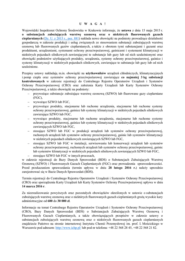 U W A G A ! Wojewódzki Inspektorat Ochrony Środowiska w Krakowie informuje, że ustawa z dnia 15 maja 2015 r. o substancjach zubożających warstwę ozonową oraz o niektórych fluorowanych gazach cieplarnianych (Dz. U. z 2015 r., poz. 881) nakłada nowe obowiązki na podmioty prowadzące działalność gospodarczą w zakresie produkcji i usług związanych ze stosowaniem substancji zubożających warstwę ozonową lub fluorowanych gazów cieplarnianych, a także z obrotem tymi substancjami i gazami oraz produktami, urządzeniami, systemami ochrony przeciwpożarowej, gaśnicami i systemami klimatyzacji w niektórych pojazdach silnikowych zawierającymi te substancje lub gazy lub od nich uzależnionymi oraz obowiązki podmiotów użytkujących produkty, urządzenia, systemy ochrony przeciwpożarowej, gaśnice i systemy klimatyzacji w niektórych pojazdach silnikowych, zawierające te substancje lub gazy lub od nich uzależnione. Przepisy ustawy nakładają m.in. obowiązki na użytkowników urządzeń chłodniczych, klimatyzacyjnych i pomp ciepła oraz systemów ochrony przeciwpożarowej zawierające co najmniej 3 kg substancji kontrolowanych w zakresie rejestracji do Centralnego Rejestru Operatorów Urządzeń i Systemów Ochrony Przeciwpożarowej (CRO) oraz założenia Karty Urządzeń lub Karty Systemów Ochrony Przeciwpożarowej, a także obowiązki na podmioty: przywożące substancje zubożające warstwę ozonową (SZWO) lub fluorowane gazy cieplarniane (FGC), wywożące SZWO lub FGC, przywożące produkty, stacjonarne lub ruchome urządzenia, stacjonarne lub ruchome systemy ochrony przeciwpożarowej, gaśnice lub systemy klimatyzacji w niektórych pojazdach silnikowych zawierające SZWO lub FGC, wywożące produkty, stacjonarne lub ruchome urządzenia, stacjonarne lub ruchome systemy ochrony przeciwpożarowej, gaśnice lub systemy klimatyzacji w niektórych pojazdach silnikowych zawierających SZWO lub FGC, stosujące SZWO lub FGC w produkcji urządzeń lub systemów ochrony przeciwpożarowej, ruchomych urządzeń lub systemów ochrony przeciwpożarowej, gaśnic lub systemów klimatyzacji w niektórych pojazdach silnikowych zawierających SZWO lub FGC, stosujące SZWO lub FGC w instalacji, serwisowaniu lub konserwacji urządzeń lub systemów ochrony przeciwpożarowej, ruchomych urządzeń lub systemów ochrony przeciwpożarowej, gaśnic lub systemów klimatyzacji w niektórych pojazdach silnikowych zawierających SZWO lub FGC, stosujące SZWO lub FGC w innych procesach, w zakresie rejestracji do Bazy Danych Sprawozdań (BDS) o Substancjach Zubażających Warstwę Ozonową (SZWO) i Fluorowanych Gazach Cieplarnianych (FGC) oraz prowadzenia sprawozdawczości. Przed przekazaniem sprawozdania (termin upływa w dniu 28 lutego 2016 r.) należy uprzednio zarejestrować się w Bazie Danych Sprawozdań (BDS). Termin rejestracji do Centralnego Rejestru Operatorów Urządzeń i Systemów Ochrony Przeciwpożarowej (CRO) oraz sporządzenia Karty Urządzeń lub Karty Systemów Ochrony Przeciwpożarowej upływa w dniu 14 marca 2016 r. Za niezrealizowanie powyższych oraz pozostałych obowiązków określonych w ustawie o substancjach zubożających warstwę ozonową oraz o niektórych fluorowanych gazach cieplarnianych grożą wysokie kary administracyjne od 600 do 30 000 zł. Informacje na temat Centralnego Rejestru Operatorów Urządzeń i Systemów Ochrony Przeciwpożarowej (CRO), Bazy Danych Sprawozdań (BDS) o Substancjach Zubażających Warstwę Ozonową i Fluorowanych Gazach Cieplarnianych, a także obowiązujących przepisów w zakresie ustawy o substancjach zubożających warstwę ozonową oraz o niektórych fluorowanych gazach cieplarnianych znajdziecie Państwo na stronie internetowej Instytutu Chemii Przemysłowej im. prof. I. Mościckiego w Warszawie pod adresem: http://www.ichp.pl/ lub pod nr telefonu: +48 22 568 28 45, +48 22 568 21 82.