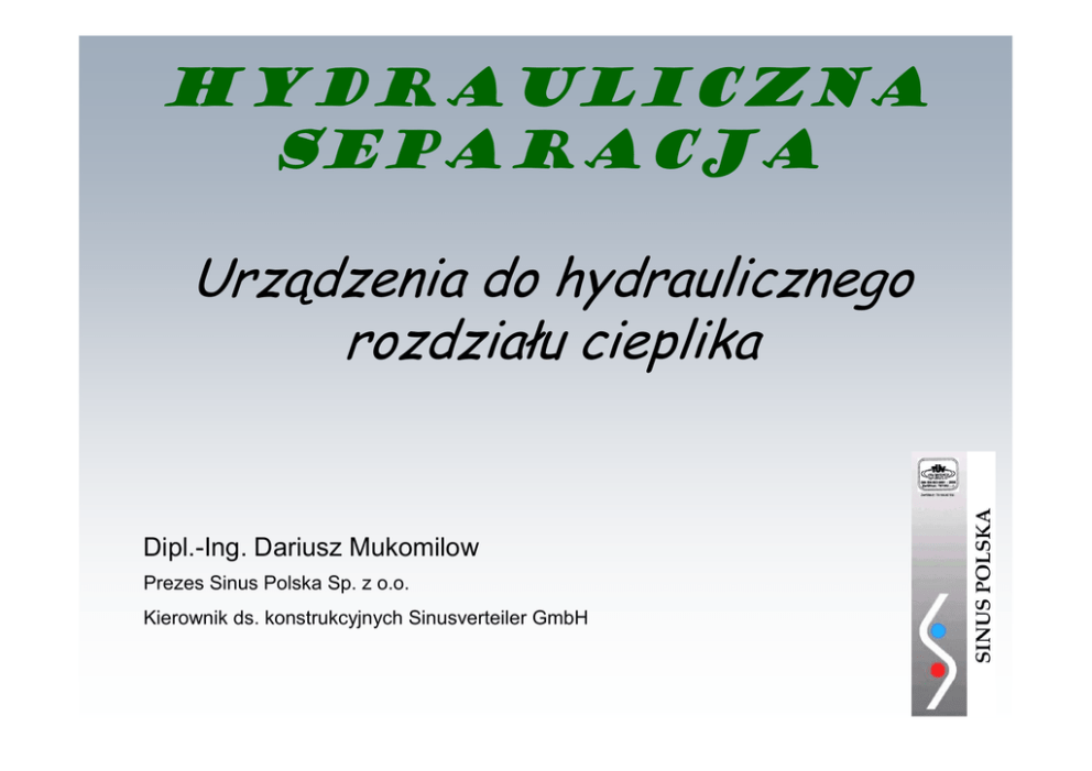Hydrauliczna separacja Urządzenia do hydraulicznego rozdziału cieplika Dipl.-Ing. Dariusz Mukomilow Prezes Sinus Polska Sp. z o.o. Kierownik ds. konstrukcyjnych Sinusverteiler GmbH Hydrauliczna separacja Wprowadzenie: Systemy grzewcze, w których woda stanowi medium, używane są na całym świecie. Mimo, iż na przestrzeni lat wiele się zmieniło w tym temacie, podejście wielu ekspertów pozostało niezmienione. Celem tej prezentacji jest przedstawienie technologii z zastosowaniem sprzęgła hydraulicznego w wodnych systemach grzewczych. Hydrauliczna separacja Wodne systemy grzewcze: Wodne systemy grzewcze posiadają zdolność, umożliwiającą pracę kilku, niezależnie kontrolowanych stref (np. wewnątrz jednego budynku). W systemach tradycyjnych o zwykłym ułożeniu orurowania, stosuje się źródło ciepła o małym oporze przepływu (np. kocioł żeliwny). Dzięki temu w systemie występują niewielkie opory, umożliwiając zarazem relatywnie wysokie wielkości przepływów, przy minimalnych interferencjach pomiędzy obiegami dystrybucyjnymi. Krótko mówiąc hydrauliczne charakterystyki tych systemów rzadko stwarzają komplikacje. Hydrauliczna separacja Nowoczesne wodne systemy grzewcze: W dzisiejszych czasach w wodnych systemach grzewczych jako źródło ciepła stosuje się kotły naścienne. Niestety, kotły tego typu posiadają dużo większe opory przepływu w porównaniu do kotłów żeliwnych. Na przykład w przypadku zastąpienia kotła żeliwnego kotłem naściennym mogą wystąpić pewnego typu komplikacje spowodowane mocno zróżnicowanymi wielkościami przepływu. Rozwiązaniem tego problemu może być hydrauliczna separacja. Krótko mówiąc, jest to zapobiegnięcie interferencj jednego obiegu na drugi (np. w przypadku dwóch obiegów dystrybucji). Takie rozwiązanie nie tylko upraszcza analizę systemu, ale także zapobiega licznym komplikacjom. Hydrauliczna separacja Nowoczesne wodne systemy grzewcze: W prostej postaci takim rozwiązaniem może być system z obiegami pierwotnym/wtórnymi, których orurowanie zawiera umieszczone blisko siebie dwa trójniki. Takiego typu zastosowania występują głównie poza terenami Europy. Z powodu małej odległości dzielącej dwa trójniki, spadek ciśnienia między nimi jest bliski zeru. Ponieważ nie występuje różnica ciśnień pomiędzy trójnikami, nie zachodzi tendencja pojawienia się przepływu w obiegu wtórnym. Z tego powodu można powiedzieć, że obieg wtórny jest “hydraulicznie odseparowany” od obiegu pierwotnego. Hydrauliczna separacja Nowoczesne wodne systemy grzewcze: Pomimo, iż pomiędzy obiegami występuje hydrauliczna separacja, niestety występuje także efekt niepożądany, jakim jest spadek temperatury medium grzewczego, w przypadku jednoczesnej pracy dwóch, lub większej ilości, obiegów dystrybucji. Oczywiście istnieją sytuacje, w których taki spadek temperatury nie stanowi problemu, jednakże z całą pewnością komplikuje to projektantom planowanie instalacji. Hydrauliczna separacja Zapobieganie spadkowi temperatury: Jednym ze sposobów zapobiegnięcia spadkowi temperatury jest zastosowanie systemu z równoległymi obiegami pierwotnym/wtórnymi. W systemie takiego typu obieg pierwotny podzielony jest na dwie lub więcej tak zwanych “pomostów łączących”. Na każdy taki pomost przypada para blisko ułożonych trójników, umożliwiających hydrauliczną separację. Przy założeniu, że straty cieplne na orurowaniu są pomijalne, system z równoległymi obiegami pierwotnym/wtórnymi zapewnia jednakową temperaturę czynnika grzewczego w każdym z obiegów wtórnych (niezależnie od ilości jednocześnie pracujących obiegów). Ta metoda posiada jedną znaczącą wadę, jaką jest skomplikowane i kosztowne orurowanie. Hydrauliczna separacja System z równoległymi obiegami wtórnym/pierwotnym: obieg wtórny umiejscowione blisko siebie trójniki równoległy obieg pierwotny Hydrauliczna separacja Zapobieganie spadkowi temperatury: Każdy z pomostów wyposażony jest w zawór regulujący przepływ. W przypadku braku takowych zaworów, lub ich złej regulacji, mogą wystąpić komplikacje, takie jak deficyt przepływu czynnika grzewczego w pomostach ulokowanych dalej od obiegu pierwotnego. Dodatkowo należy wspomnieć, że wszystkie wcześniej omówione systemy wymagają dodatkowej pompy cyrkulacyjnej obiegu pierwotnego. Podnosi to koszty instalacji całego systemu, jak również koszty eksploatacji przez całą jego żywotność. Hydrauliczna separacja Sprzęgło hydrauliczne: A gdyby tak istniał sposób osiągnięcia zalet hydraulicznej separacji bez spadków temperatur, a także bez kosztów związanych z dodatkową pompą cyrkulacyjną i regulacji równoległego systemu obiegów pierwotnego/wtórnych? Istnieje prosta odpowiedź na to pytanie: zastosowanie sprzęgła hydraulicznego. Hydrauliczna separacja Sprzęgło hydrauliczne: sprzęgło hydrauliczne obieg grzewczy obieg dystrybucji Hydrauliczna separacja Czym jest sprzęgło hydrauliczne? Jest to urządzenie łączące zasilanie (obieg pierwotny) i powrót (system dystrybucji ) przewodem, którego przekrój jest od 2 do 3 większy niż średnice przewodów zasilania i powrotu. W jego górnej i dolnej części znajdują się króćce do podłączenia zasilania i powrotu. Duży przekrój tego połączenia zapewnia sporo większe przepływy w jego wnętrzu. Z tego powodu następuje hydrauliczne odsprzęglanie dwóch oddzielnych obwodów. Hydrauliczna separacja Jak to działa? Na następnych trzech slajdach przedstawiono zasadę działania sprzęgła hydraulicznego. Hydrauliczna separacja Pierwszy przypadek: Objętość medium płynącego po stronie pierwotnej (VI) jest równa objętości medium płynącego po stronie wtórnej (VO ). Temperatury są także takie same zatem ilość dostarczonego ciepła (QI) jest równa ilości ciepła odebranego (QO). T1 T3 VI T2 • • • • VI = VO T1 = T3 T2 =T4 QI = QO VO T4 Hydraulicz