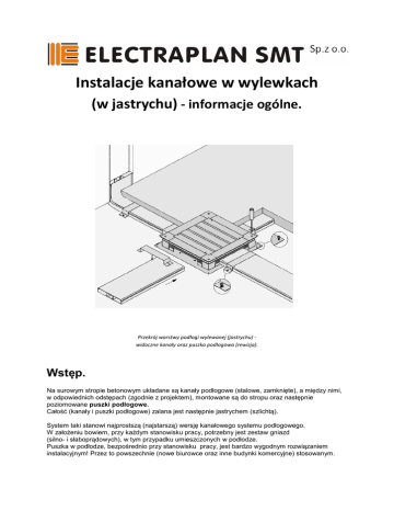 Instalacje kanałowe w wylewkach (w jastrychu) - informacje ogólne. Przekrój warstwy podłogi wylewanej (jastrychu) widoczne kanały oraz puszka podłogowa (rewizja). Wstęp. Na surowym stropie betonowym układane są kanały podłogowe (stalowe, zamknięte), a między nimi, w odpowiednich odstępach (zgodnie z projektem), montowane są do stropu oraz następnie poziomowane puszki podłogowe. Całość (kanały i puszki podłogowe) zalana jest następnie jastrychem (szlichtą). System taki stanowi najprostszą (najstarszą) wersję kanałowego systemu podłogowego. W założeniu bowiem, przy każdym stanowisku pracy, potrzebny jest zestaw gniazd (silno- i słaboprądowych), w tym przypadku umieszczonych w podłodze. Puszka w podłodze, bezpośrednio przy stanowisku pracy, jest bardzo wygodnym rozwiązaniem instalacyjnym! Przez to powszechnie (nowe biurowce oraz inne budynki komercyjne) stosowanym. A. Kanały podłogowe. System kanałowy Electraplan oferuje 3 szerokości kanałów (190, 240 i 340 mm) oraz 3 wysokości: 28, 38 i 48 mm. Każdy kanał może mieć 1 lub 2 przegrody (kanały 2 - lub 3 - torowe). Widok kanału 2 - i 3 - torowego. Kanały są całkowicie zalane warstwą wylewki (jastrychu). Są przez to niewidoczne i od góry niedostępne. Dostęp do nich zapewniają puszki podłogowe (rewizyjne i sprzętowe). Przekrój warstwy wierzchniej podłogi wylewanej widoczne połączenie: kanał - puszka podłogowa. Uwaga: min. grubość warstwy wylewki na kanale to ok.40 mm! Przekrój warstwy jastrychu z widocznym kanałem podłogowym. Mocowanie kanałów do stropu. Najprostszy element mocujący kanał do podłoża to blaszany kabłąk (pałąk) - patrz poniżej. Montowany zwykle co 1 mb. Inne mocowanie kanału stanowi obejma (pałąk z podkładką od spodu). Stosowana zwykle na połączeniach odcinków kanałów (co 2 mb.). Połączenie kanałów z rozdzielnicami zapewniają łuki kanałów (wyjścia kątowe kanałów z warstwy podłogi na ścianę). Łuki kanałów podłogowych. Uwagi ogólne: - do systemu podłogowego Electraplan pasują dowolne kanały podłogowe, różnych producentów, dostępne na rynku polskim. Z uwagi na pełną kompatybilność (wymiary, grubość blach itd.), zalecane są kanały podłogowe firmy Baks, - zamiast kanałów mogą być stosowane rury instalacyjne (peszle). B. Puszki podłogowe UDH (z boczną folią osłonową). Widok puszki podłogowej UDH. Puszkę podłogową UDH stanowi aluminiowa rama, poziomowana w 4 narożach oraz osłonięta z 4 boków elastyczną folią. Poziomowanie puszki podłogowej. Poziomowanie puszek (gwintowane kołki M8) przeprowadza się w określonych zakresach. Najczęściej stosowane zakresy poziomowania to: 50 - 110 mm i 70 - 130 mm. Inne zakresy poziomowania: na życzenie Odbiorcy. Puszka UDH montowana jest do surowego stropu, poziomowana, połączona z kanałami podłogowymi lub rurami (peszlami) i zalana jastrychem (z boków). Przekrój podłogi wylewanej z widoczną puszką UDH. Rama puszki jest na czas jej obsadzenia zakryta od góry cienką blachą, chroniącą wnętrze puszki przed wylewką i innymi niepotrzebnymi przedmiotami, śmieciami itp. W otwór puszki UDH (po usunięciu blaszki), montowana jest finalnie pokrywa uchylna, a w niej różne gniazda instalacyjne. Uwagi ogólne: - przed zalaniem kanałów i puszek należy zadbać o ich solidne uziemienie na budowie! - generalnie połączenia puszek i kanałów podłogowych należy prowadzić pod kątem 90 °. W razie konieczności - dopuszcza się niewielkie odstępstwa od tej zasady (patrz poniżej dopuszczalne kąty). - w otwór puszki podłogowej UDH montowana jest (etap prac wykończeniowych pomieszczeń) pokrywa uchylna. Uwagi: - w zależności od wielkości puszek UDH, stosowane są odpowiednie kanały podłogowe, - puszki UDB stanowią mocną (blacha od spodu) odmianę puszek UDH.