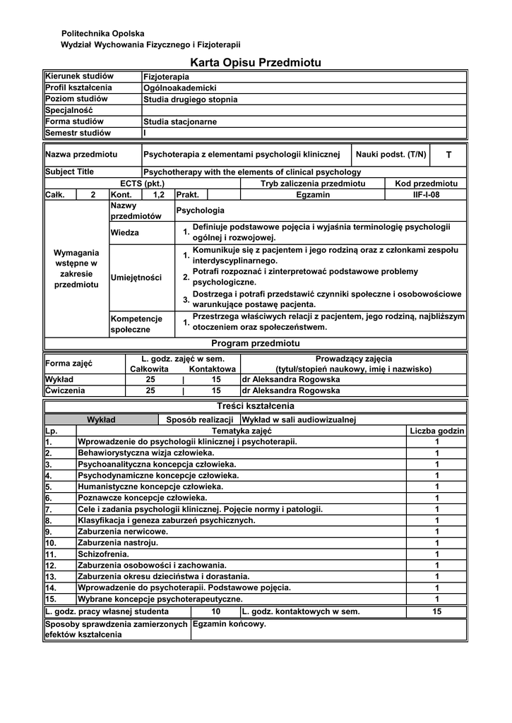 Politechnika Opolska Wydział Wychowania Fizycznego i Fizjoterapii Karta Opisu Przedmiotu Kierunek studiów Profil kształcenia Poziom studiów Specjalność Forma studiów Semestr studiów Fizjoterapia Ogólnoakademicki Studia drugiego stopnia Nazwa przedmiotu Psychoterapia z elementami psychologii klinicznej Subject Title Całk. 2 Wymagania wstępne w zakresie przedmiotu Studia stacjonarne I Nauki podst. (T/N) T Psychotherapy with the elements of clinical psychology ECTS (pkt.) Tryb zaliczenia przedmiotu Kod przedmiotu Kont. 1,2 Prakt. Egzamin IIF-I-08 Nazwy Psychologia przedmiotów Definiuje podstawowe pojęcia i wyjaśnia terminologię psychologii 1. Wiedza ogólnej i rozwojowej. Komunikuje się z pacjentem i jego rodziną oraz z członkami zespołu interdyscyplinarnego. Potrafi rozpoznać i zinterpretować podstawowe problemy 2. psychologiczne. Dostrzega i potrafi przedstawić czynniki społeczne i osobowościowe 3. warunkujące postawę pacjenta. Przestrzega właściwych relacji z pacjentem, jego rodziną, najbliższym 1. otoczeniem oraz społeczeństwem. 1. Umiejętności Kompetencje społeczne Program przedmiotu Forma zajęć Wykład Ćwiczenia L. godz. zajęć w sem. Prowadzący zajęcia Całkowita Kontaktowa (tytuł/stopień naukowy, imię i nazwisko) 25 15 dr Aleksandra Rogowska | 25 15 dr Aleksandra Rogowska | Treści kształcenia Wykład Lp. 1. 2. 3. 4. 5. 6. 7. 8. 9. 10. 11. 12. 13. 14. 15. Sposób realizacji Wykład w sali audiowizualnej Tematyka zajęć Wprowadzenie do psychologii klinicznej i psychoterapii. Behawiorystyczna wizja człowieka. Psychoanalityczna koncepcja człowieka. Psychodynamiczne koncepcje człowieka. Humanistyczne koncepcje człowieka. Poznawcze koncepcje człowieka. Cele i zadania psychologii klinicznej. Pojęcie normy i patologii. Klasyfikacja i geneza zaburzeń psychicznych. Zaburzenia nerwicowe. Zaburzenia nastroju. Schizofrenia. Zaburzenia osobowości i zachowania. Zaburzenia okresu dzieciństwa i dorastania. Wprowadzenie do psychoterapii. Podstawowe pojęcia. Wybrane koncepcje psychoterapeutyczne. L. godz. pracy własnej studenta 10 L. godz. kontaktowych w sem. Sposoby sprawdzenia zamierzonych Egzamin końcowy. efektów kształcenia Liczba godzin 1 1 1 1 1 1 1 1 1 1 1 1 1 1 1 15 Ćwiczenia Lp. 1. 2. 3. 4. 5. 6. 7. 8. 9. 10. 11. 12. 13. 14. 15. Sposób realizacji Ćwiczenia w sali ćwiczeniowej Tematyka zajęć Wprowadzenie do psychoterapii w perspektywie psychologii klinicznej. Psychologia zdrowia a psychologia kliniczna. Efekt placebo i nocebo. Człowiek a choroba (reakcje, postawy, radzenie sobie). Interakcja pacjent – personel medyczny. Błędy jatrogenne. Podstawowe zasady pomocy psychologicznej i psychoterapii w kontaktach terapeuta-pacjent (klient). Empatia. Inteligencja emocjonalna i społeczna. Wybrane koncepcje psychoterapeutyczne. Metody psychoterapeutyczne. Pacjenci w chorobach przewlekłych i nieuleczalnych. Problematyka opieki paliatywnej. Zaburzenia organiczne (objawy, przyczyny, leczenie, psychoterapia). Zaburzenia nerwicowe (objawy, przyczyny, leczenie, psychoterapia). Zaburzenia nastroju (objawy, przyczyny, leczenie, psychoterapia). Zaburzenia osobowości (objawy, przyczyny, leczenie, psychoterapia). Schizofrenia (objawy, przyczyny, leczenie, psychoterapia). Zaburzenia zachowania (objawy, przyczyny, leczenie, psychoterapia). Integracja wiadomości i umiejętności. Kolokwium zaliczeniowe. Liczba godzin 1 1 1 1 1 1 1 1 1 1 1 1 1 1 1 L. godz. pracy własnej studenta 10 L. godz. kontaktowych w sem. 15 Ustna prezentacja wiedzy i umiejętności, pisemne kolokwium, Sposoby sprawdzenia zamierzonych obserwacja postawy i zachowań studenta efektów kształcenia Efekty kształcenia dla przedmiotu - po zakończonym cyklu kształcenia Wiedza 1. KF_W09 Zna i poddaje analizie przyczyny i objawy zaburzeń psychicznych oraz rozumie celowość psychoterapii Umiejętności 1. KF_U02 umie wykorzystywać elementy metod psychoterapii i psychologii klinicznej w pracy z pacjentem Kompetencje społeczne 1. KF_K10 odnosi się z szacunkiem do pacjenta i jego bliskich oraz wykazuje zrozumienie i tolerancję dla ich problemów, uwarunkowań społecznych, kulturowych i religijnych Metody dydaktyczne: Wykład, prezentacja multimedialna, film DVD, dyskusja, pogadanka, metoda indywidualnego przypadku, pokaz Forma i warunki zaliczenia przedmiotu: Wykonanie ustnej prezentacji wiedzy na zadany temat z zakresu psychologii klinicznej i psychoterapii, opracowanie referatu na podstawie literatury naukowej, obecność i aktywny udział w ćwiczeniach, pozytywne zaliczenie kolokwium z ćwiczeń i egzaminu z wykładów. Literatura podstawowa: [1] Carson R.C., Butcher J.N. i Mineka S., 2011, Psychologia zaburzeń, t. 1 i 2., Gdańsk: GWP. [2] Kowalik S., 2007, Psychologia rehabilitacji, Warszawa: WAiP. [3] Kratochvil S., 2003, Podstawy psychoterapii, Poznań: Zysk i S-ka Wydawnictwo. [4] Meyer R., 2003, Psychopatologia, Gdańsk: GWP. [5] Sęk H. (red.), 2006, Psychologia kliniczna, t. 1 i 2, Warszawa: Wydawnictwo Naukowe PWN Literatura uzupełniająca: [1] Feltham C i Horton I. (red.), 2013, Psychoterapia i poradnictwo, t. 1 i 2, Gdańsk: GWP. [2] Heszen I i Sęk H., 2007, Psychologia zdrowia, Warszawa: Wydawnictwo Naukowe PWN [3] Kępiński A., 2003, Podstawowe zagadnienia współczesnej psychiatrii, Kraków: WL. [4] Klimasiński K., 2000, Elementy psychopatologii i psychologii klinicznej, Kraków: UJ. [5] Sheridan Ch.L. i Radmacher S.A., 1998, Psychologia zdrowia. Wyzwanie dla biomedycznego modelu zdrowia, Warszawa: Instytut Psychologii Zdrowia PTP. Bennett P., 2003, Abnormal and Clinical Psychology : An Introductory Textbook, Philadelphia: Open [6] University. ______________ * niewłaściwe przekreślić ………………………………………………….. ………………………………………………………. (kierownik jednostki organizacyjnej/bezpośredni przełożony: pieczęć/podpis (Dziekan Wydziału pieczęć/podpis)