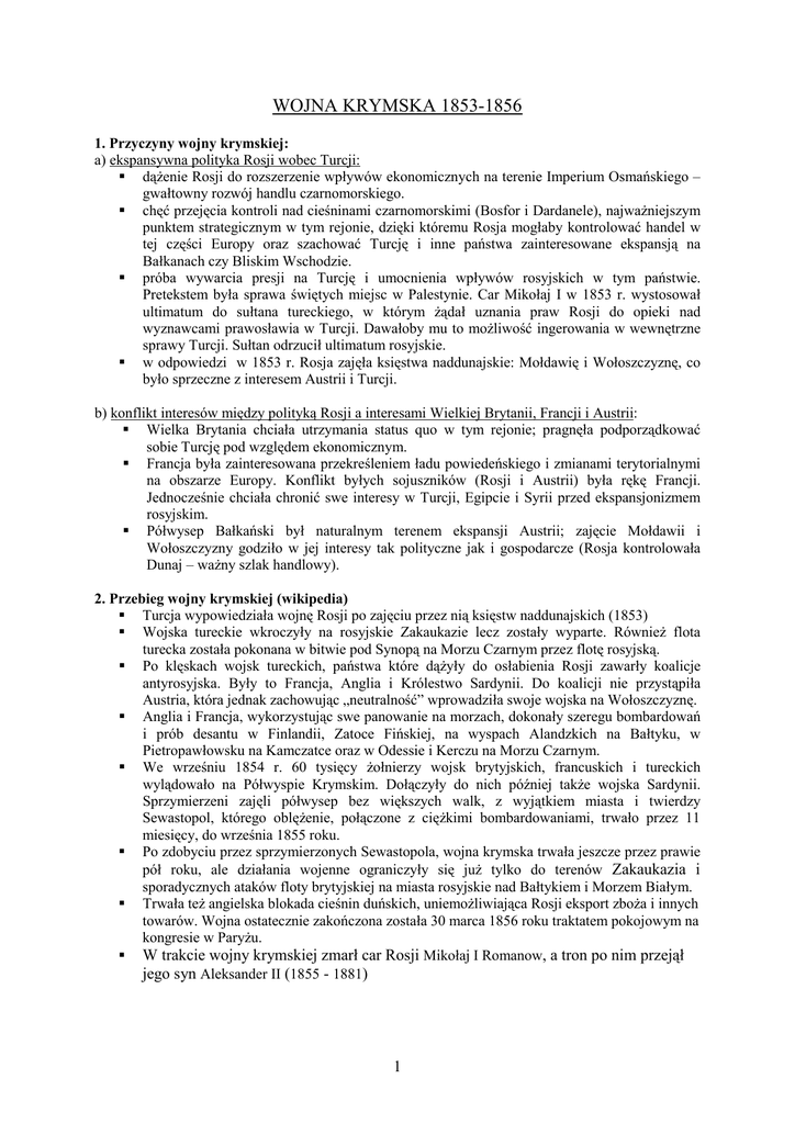 WOJNA KRYMSKA 1853-1856 1. Przyczyny wojny krymskiej: a) ekspansywna polityka Rosji wobec Turcji: dąŜenie Rosji do rozszerzenie wpływów ekonomicznych na terenie Imperium Osmańskiego – gwałtowny rozwój handlu czarnomorskiego. chęć przejęcia kontroli nad cieśninami czarnomorskimi (Bosfor i Dardanele), najwaŜniejszym punktem strategicznym w tym rejonie, dzięki któremu Rosja mogłaby kontrolować handel w tej części Europy oraz szachować Turcję i inne państwa zainteresowane ekspansją na Bałkanach czy Bliskim Wschodzie. próba wywarcia presji na Turcję i umocnienia wpływów rosyjskich w tym państwie. Pretekstem była sprawa świętych miejsc w Palestynie. Car Mikołaj I w 1853 r. wystosował ultimatum do sułtana tureckiego, w którym Ŝądał uznania praw Rosji do opieki nad wyznawcami prawosławia w Turcji. Dawałoby mu to moŜliwość ingerowania w wewnętrzne sprawy Turcji. Sułtan odrzucił ultimatum rosyjskie. w odpowiedzi w 1853 r. Rosja zajęła księstwa naddunajskie: Mołdawię i Wołoszczyznę, co było sprzeczne z interesem Austrii i Turcji. b) konflikt interesów między polityką Rosji a interesami Wielkiej Brytanii, Francji i Austrii: Wielka Brytania chciała utrzymania status quo w tym rejonie; pragnęła podporządkować sobie Turcję pod względem ekonomicznym. Francja była zainteresowana przekreśleniem ładu powiedeńskiego i zmianami terytorialnymi na obszarze Europy. Konflikt byłych sojuszników (Rosji i Austrii) była rękę Francji. Jednocześnie chciała chronić swe interesy w Turcji, Egipcie i Syrii przed ekspansjonizmem rosyjskim. Półwysep Bałkański był naturalnym terenem ekspansji Austrii; zajęcie Mołdawii i Wołoszczyzny godziło w jej interesy tak polityczne jak i gospodarcze (Rosja kontrolowała Dunaj – waŜny szlak handlowy). 2. Przebieg wojny krymskiej (wikipedia) Turcja wypowiedziała wojnę Rosji po zajęciu przez nią księstw naddunajskich (1853) Wojska tureckie wkroczyły na rosyjskie Zakaukazie lecz zostały wyparte. RównieŜ flota turecka została pokonana w bitwie pod Synopą na Morzu Czarnym przez flotę rosyjską. Po klęskach wojsk tureckich, państwa które dąŜyły do osłabienia Rosji zawarły koalicje antyrosyjska. Były to Francja, Anglia i Królestwo Sardynii. Do koalicji nie przystąpiła Austria, która jednak zachowując „neutralność” wprowadziła swoje wojska na Wołoszczyznę. Anglia i Francja, wykorzystując swe panowanie na morzach, dokonały szeregu bombardowań i prób desantu w Finlandii, Zatoce Fińskiej, na wyspach Alandzkich na Bałtyku, w Pietropawłowsku na Kamczatce oraz w Odessie i Kerczu na Morzu Czarnym. We wrześniu 1854 r. 60 tysięcy Ŝołnierzy wojsk brytyjskich, francuskich i tureckich wylądowało na Półwyspie Krymskim. Dołączyły do nich później takŜe wojska Sardynii. Sprzymierzeni zajęli półwysep bez większych walk, z wyjątkiem miasta i twierdzy Sewastopol, którego oblęŜenie, połączone z cięŜkimi bombardowaniami, trwało przez 11 miesięcy, do września 1855 roku. Po zdobyciu przez sprzymierzonych Sewastopola, wojna krymska trwała jeszcze przez prawie pół roku, ale działania wojenne ograniczyły się juŜ tylko do terenów Zakaukazia i sporadycznych ataków floty brytyjskiej na miasta rosyjskie nad Bałtykiem i Morzem Białym. Trwała teŜ angielska blokada cieśnin duńskich, uniemoŜliwiająca Rosji eksport zboŜa i innych towarów. Wojna ostatecznie zakończona została 30 marca 1856 roku traktatem pokojowym na kongresie w ParyŜu. W trakcie wojny krymskiej zmarł car Rosji Mikołaj I Romanow, a tron po nim przejął jego syn Aleksander II (1855 - 1881) 1 3. Skutki i znaczenie wojny krymskiej: a) traktaty pokojowe podpisano: z Francją, Wielką Brytanią i Królestwem Sardynii w ParyŜu 30.03.1856 r. – Rosja zrzekła się: zdobyczy na Kaukazie (twierdza Kars w Armenii tureckiej), i Besarabii, którą przekazano Turcji. Rosja musiała rozwiązać flotę czarnomorską, zobowiązała się przestrzegać neutralności Morza Czarnego – Rosja miała zakaz posiadania floty wojennej i budowy twierdz przybrzeŜnych na Morzu Czarnym, które stało się otwartym dla innych flot; zrzekła się protektoratu nad Mołdawią, Wołoszczyzną i Serbią, które od tej pory miały otrzymać autonomię pod protektoratem Turcji. Mołdawia i Wołoszczyzna zjednoczyły się ogłosiły swoją niepodległość (powstała Rumunia), która pełną suwerenność uzyskała w 1878 r. z Austrią w Wiedniu – 1.02.1856 r. – car Aleksander II zobowiązał się do zrzeczenia się przez Rosją protektoratu nad księstwami naddunajskimi; przestrzegania swobody Ŝeglugi na Dunaju; zaprzestania Ŝądań opieki nad prawosławnymi w Turcji. b) skutki i znaczenie: Rosja utraciła korzyści polityczne w rejonie Morza Czarnego wojna ukazała słabość imperium rosyjskiego i jego zacofanie techniczne oraz gospodarcze. przyczyniła się do zmiany polityki wewnętrznej Rosji. W 1861 r. w Rosji zniesiono poddaństwo osobiste chłopów, a car Aleksander II zapowiedział i inne reformy. Rozpoczął się okres odwilŜy czyli tzw. wiosny posewastopolskiej. Austria mimo pozornego zwycięstwa została całkowicie izolowana przez pozostałe państwa europejskie, tracąc swojego dotychczasowego sojusznika – Rosję. Izolacja ta przyczyniła się do klęski politycznej Austrii w latach 1858- 1866. zakończył się okres, w którym Austria obok Rosji pełniła rolę hegemona na kontynencie europejskim i gwarantowała status quo w Europie. wojna krymska oznaczała koniec Świętego Przymierza i porządku powiedeńskiego i zapoczątkowała proces tworzenia się nowego systemu sojuszy, zakończony utworzeniem Trójprzymierza i Trójporozumienia. c) umiędzynarodowienie sprawy polskiej ( dzięki walce Anglii i Francji przeciwko Rosji) Polacy mieli nadzieję, Ŝe państwa zachodnie po pokonaniu Rosji poruszą kwestię polską i pomogą Polakom odzyskać suwerenność. Miały temu słuŜyć działania