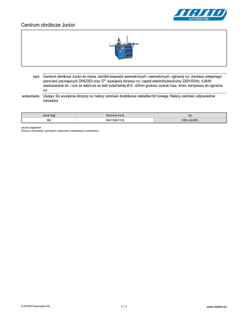 Centrum obróbcze Junior opis Centrum obróbcze Junior do ciecia, obróbki krawedzi wewnetrznych i zewnetrznych, zginania rur, montazu wstepnego pierscieni zacinajacych DIN2353 oraz 37° wywijania obrzezy rur; naped elektrohydrauliczny 220V/50Hz, 4,6kW; zastosowanie do - rura ze stali/rura ze stali szlachetnej Ø 6...42mm grubosc scianki max. 4mm; kompresor do zginania rur wskazówka Uwaga: Do wywijania obrzezy rur nalezy zamówic dodatkowa nakladke<br>Uwaga: Nalezy zamówic odpowiednie narzedzia ciezar [kg] dl/sz/wys [mm] typ 262 830/1260/1210 CEN-JUUSFL rysunki pogladowe Zmiany w konstrukcji, wymiarach i wykonaniu materialowym zastrzezone © STASTO Automation KG 1/1 www.stasto.eu