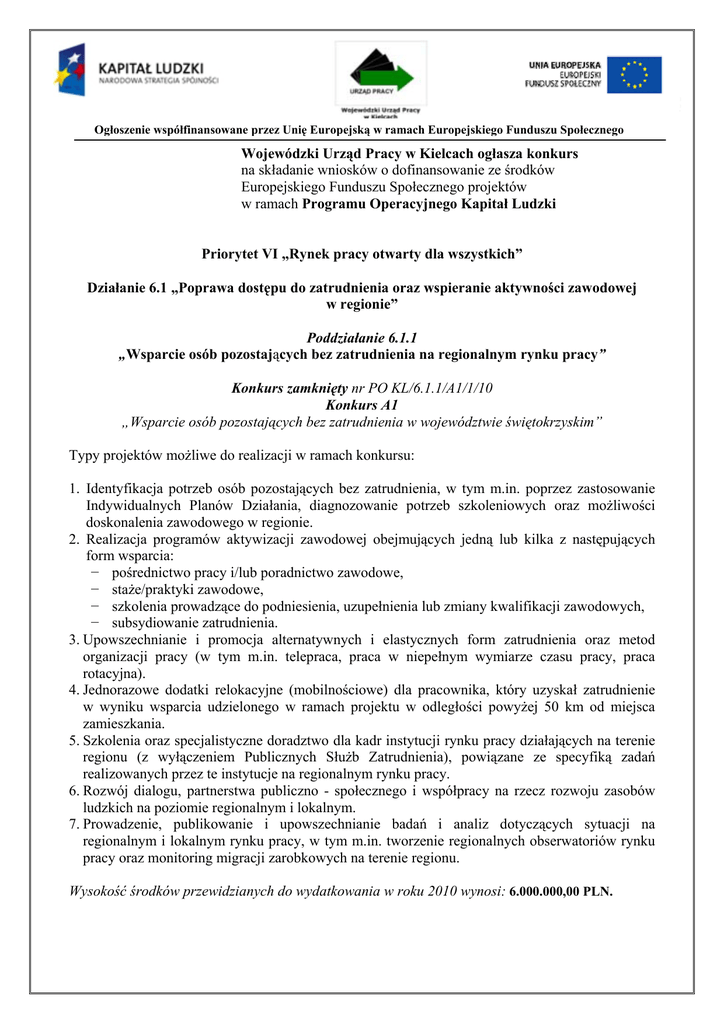 Ogłoszenie współfinansowane przez Unię Europejską w ramach Europejskiego Funduszu Społecznego Wojewódzki Urząd Pracy w Kielcach ogłasza konkurs na składanie wniosków o dofinansowanie ze środków Europejskiego Funduszu Społecznego projektów w ramach Programu Operacyjnego Kapitał Ludzki Priorytet VI „Rynek pracy otwarty dla wszystkich” Działanie 6.1 „Poprawa dostępu do zatrudnienia oraz wspieranie aktywności zawodowej w regionie” Poddziałanie 6.1.1 „Wsparcie osób pozostających bez zatrudnienia na regionalnym rynku pracy” Konkurs zamknięty nr PO KL/6.1.1/A1/1/10 Konkurs A1 „Wsparcie osób pozostających bez zatrudnienia w województwie świętokrzyskim” Typy projektów możliwe do realizacji w ramach konkursu: 1. Identyfikacja potrzeb osób pozostających bez zatrudnienia, w tym m.in. poprzez zastosowanie Indywidualnych Planów Działania, diagnozowanie potrzeb szkoleniowych oraz możliwości doskonalenia zawodowego w regionie. 2. Realizacja programów aktywizacji zawodowej obejmujących jedną lub kilka z następujących form wsparcia: − pośrednictwo pracy i/lub poradnictwo zawodowe, − staże/praktyki zawodowe, − szkolenia prowadzące do podniesienia, uzupełnienia lub zmiany kwalifikacji zawodowych, − subsydiowanie zatrudnienia. 3. Upowszechnianie i promocja alternatywnych i elastycznych form zatrudnienia oraz metod organizacji pracy (w tym m.in. telepraca, praca w niepełnym wymiarze czasu pracy, praca rotacyjna). 4. Jednorazowe dodatki relokacyjne (mobilnościowe) dla pracownika, który uzyskał zatrudnienie w wyniku wsparcia udzielonego w ramach projektu w odległości powyżej 50 km od miejsca zamieszkania. 5. Szkolenia oraz specjalistyczne doradztwo dla kadr instytucji rynku pracy działających na terenie regionu (z wyłączeniem Publicznych Służb Zatrudnienia), powiązane ze specyfiką zadań realizowanych przez te instytucje na regionalnym rynku pracy. 6. Rozwój dialogu, partnerstwa publiczno - społecznego i współpracy na rzecz rozwoju zasobów ludzkich na poziomie regionalnym i lokalnym. 7. Prowadzenie, publikowanie i upowszechnianie badań i analiz dotyczących sytuacji na regionalnym i lokalnym rynku pracy, w tym m.in. tworzenie regionalnych obserwatoriów rynku pracy oraz monitoring migracji zarobkowych na terenie regionu. Wysokość środków przewidzianych do wydatkowania w roku 2010 wynosi: 6.000.000,00 PLN. Konkurs zamknięty nr PO KL/6.1.1/A2/1/10 Konkurs A2 „Wsparcie dla osób pozostających bez zatrudnienia w wieku powyżej 45 roku życia” Typy projektów możliwe do realizacji w ramach konkursu: 1. 2. 3. Identyfikacja potrzeb osób pozostających bez zatrudnienia, w tym m.in. poprzez zastosowanie Indywidualnych Planów Działania, diagnozowanie potrzeb szkoleniowych oraz możliwości doskonalenia zawodowego w regionie. Realizacja programów aktywizacji zawodowej obejmujących jedną lub kilka z następujących form wsparcia: − pośrednictwo pracy i/lub poradnictwo zawodowe, − staże/praktyki zawodowe, − szkolenia prowadzące do podniesienia, uzupełnienia lub zmiany kwalifikacji zawodowych, − subsydiowanie zatrudnienia. Upowszechnianie i promocja alternatywnych i elastycznych form zatrudnienia oraz metod organizacji pracy (w tym m.in. telepraca, praca w niepełnym wymiarze czasu pracy, praca rotacyjna). Wysokość środków przewidzianych do wydatkowania w roku 2010 wynosi: 3.390.000,00 PLN. Poddziałanie 6.1.2 „Wsparcie powiatowych i wojewódzkich urzędów pracy w realizacji zadań na rzecz aktywizacji zawodowej osób bezrobotnych w regionie” Konkurs otwarty nr PO KL/6.1.2/A1/1/10 Konkurs A1 „Wzmocnienie i rozwój publicznych służb zatrudnienia poprzez szkolenia, doradztwo, badania rynku pracy oraz dofinansowanie zatrudnienia doradców zawodowych i pośredników pracy” Typy projektów możliwe do realizacji w ramach konkursu: 1. Projekty służące wzmocnieniu i rozwojowi publicznych służb zatrudnienia w regionie m.in. poprzez szkolenia, doradztwo, badania rynku pracy, w tym: − upowszechnianie pośrednictwa pracy i poradnictwa zawodowego w regionie, m.in. poprzez dofinansowanie zatrudnienia doradców zawodowych i pośredników pracy, − szkolenia, doradztwo oraz dofinansowanie studiów podyplomowych, studiów licencjackich i studiów magisterskich uzupełniających dla kadr publicznych służb zatrudnienia działających na terenie regionu, powiązane bezpośrednio z potrzebami oraz ze specyfiką realizowanych przez nie zadań. 2. Prowadzenie, publikowanie i upowszechnianie badań i analiz sytuacji na regionalnym i lokalnym rynku pracy (w tym w ramach regionalnych obserwatoriów rynku pracy), m.in. w zakresie: − przewidywanej sytuacji na rynku pracy wybranych zawodów, sektorów/branż, − przewidywanych oczekiwań pracodawców odnośnie pożądanych kwalifikacji i usług szkoleniowych, − migracji zarobkowych na terenie regionu. Wysokość środków przewidzianych do wydatkowania w roku 2010 wynosi: 2.800.000,00 PLN. Działanie 6.2 Działanie 6.2 „Wsparcie oraz promocji przedsiębiorczości i samozatrudnienia” Konkurs otwarty nr PO KL/6.2/A1/1/10 Konkurs A1 „Wsparcie dla osób zamierzających rozpocząć działalność gospodarczą” Typy projektów możliwe do realizacji w ramach konkursu: 1. Wsparcie dla osób zamierzających rozpocząć działalność gospodarczą (w tym na założenie spółdzielni lub spółdzielni socjalnej) poprzez zastosowanie następujących instrumentów: − doradztwo (indywidualne i grupowe) oraz szkolenia umożliwiające uzyskanie wiedzy i umiejętności potrzebnych do założenia i prowadzenia działalności gospodarczej, − przyznanie środków finansowych na rozwój przedsiębiorczości (w tym w formie spółdzielni lub spółdzielni socjalnej – o ile wszyscy udziałowcy są osobami, które rozpoczęły prowadzenie działalności w wyniku uczestnictwa w projekcie realizowanym w ramach przedmiotowego Działania), do wysokości 40 tys. zł (lu