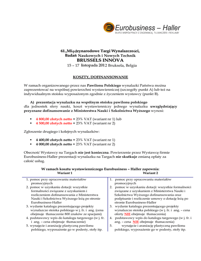 6611..,,M zyynnaarrooddoow cii,, Miiędz wee T Taarrggii W Wyynnaallaazzcczzoośc B Baaddaańń Naukowych i Nowych Technik B BR RU USSSSEELLSS IIN NN NO OV VA A 15 – 17 lliissttooppaaddaa 2200112 Bruksela, Belgia KOSZTY, DOFINANSOWANIE W ramach organizowanego przez nas Pawilonu Polskiego wynalazki Państwa moŜna zaprezentować na wspólnej powierzchni wystawienniczej (szczegóły punkt A) lub teŜ na indywidualnym stoisku wyposaŜonym zgodnie z Ŝyczeniem wystawcy (punkt B). A) prezentacja wynalazku na wspólnym stoisku pawilonu polskiego dla jednostek sfery nauki, koszt wystawienniczy jednego wynalazku uwzględniający przyznane dofinansowanie z Ministerstwa Nauki i Szkolnictwa WyŜszego wynosi: 4 800,00 złotych netto + 23% VAT (wariant nr 1) lub 4 500,00 złotych netto + 23% VAT (wariant nr 2) Zgłoszenie drugiego i kolejnych wynalazków: 4 400,00 złotych netto + 23% VAT (wariant nr 1) 4 000,00 złotych netto + 23% VAT (wariant nr 2) Obecność Wystawcy na Targach nie jest konieczna. Powierzenie przez Wystawcę firmie Eurobusiness-Haller prezentacji wynalazku na Targach nie skutkuje zmianą opłaty za całość usług. W ramach kosztu wystawienniczego Eurobusiness – Haller zapewnia: Wariant 1 Wariant 2 1. pomoc przy opracowaniu materiałów promocyjnych 2. pomoc w uzyskaniu dotacji: wszystkie formalności związane z uzyskaniem i rozliczeniem dofinansowania z Ministerstwa Nauki i Szkolnictwa WyŜszego leŜą po stronie Eurobusiness-Haller 3. wydanie katalogu prezentującego projekty wynalazcze stoiska polskiego w j. fr. i ang. (cena obejmuje tłumaczenie 800 znaków ze spacjami) 4. podstawowy wpis do katalogu targowego (w j. fr. i ang. – cena obejmuje tłumaczenie) 5. wynajęcie i aranŜację plastyczną pawilonu polskiego, wyposaŜenie go w podesty, stoły itp. 1. pomoc przy opracowaniu materiałów promocyjnych 2. pomoc w uzyskaniu dotacji: wszystkie formalności związane z uzyskaniem z Ministerstwa Nauki i Szkolnictwa WyŜszego dofinansowania oraz podpisanie i rozliczenie umowy o dotację leŜą po stronie Eurobusiness-Haller 3. wydanie katalogu prezentującego projekty wynalazcze stoiska polskiego (w j. fr. i ang. – cena oferty NIE obejmuje tłumaczenia) 4. podstawowy wpis do katalogu targowego (w j. fr. i ang. – cena NIE obejmuje tłumaczenia) 5. wynajęcie i aranŜację plastyczną pawilonu polskiego, wyposaŜenie go w podesty, stoły itp. Wariant 1 Wariant 2 6. powierzchnię wystawienniczą na wspólnym stoisku obejmującą: platformę ekspozycyjną (1m2), ściankę ekspozycyjną (2,25 x 0,95m szer.), ciągi komunikacyjne, zaplecze gospodarcze z bufetem z ciepłymi i zimnymi napojami 7. rezerwację hotelu (obecność przedstawicieli firmy wystawiającej nie jest konieczna) - hotel opłaca uczestnik Targów 8. transport eksponatu, planszy itp. Katowice Bruksela – Katowice 9. promocję wynalazku podczas Targów, obsługę językową stoisk 10. wykonanie planszy informacyjnej o wynalazku (900-1000 mm w języku francuskim) 11. tłumaczenie tekstu: do katalogu na język ang.i fr. (pkt 3, 4); na planszę informacyjną na j. fr. (pkt 10) 6. powierzchnię wystawienniczą na wspólnym stoisku obejmującą: platformę ekspozycyjną (1m2), ściankę ekspozycyjną (2,25 x 0,95m szer.), ciągi komunikacyjne, zaplecze gospodarcze z bufetem z ciepłymi i zimnymi napojami 7. rezerwację hotelu (obecność przedstawicieli firmy wystawiającej nie jest konieczna) - hotel opłaca uczestnik Targów 8. transport eksponatu, planszy itp. Katowice Bruksela – Katowice 9. promocję wynalazku podczas Targów, obsługę językową stoisk CENA 4 800 zł netto (5 904,00 zł brutto) CENA 4 500 zł netto (5 535,00 zł brutto) UWAGA: Cena udziału nie obejmuje tłumaczenia opisu wynalazku dla jury. 42,50 zł netto – cena tłumaczenia 1 strony obliczeniowej (1500 znaków ze spacjami) na j. francuski. B) Prezentacja wynalazku w ramach pawilonu polskiego na stoisku indywidualnym lub na większej powierzchni wystawienniczej niŜ proponowana w pkt A W przypadku zainteresowania wynajęciem większej powierzchni wystawienniczej lub osobnego stoiska prosimy o kontakt. Prześlemy Państwu kalkulację pod Państwa indywidualne potrzeby.
