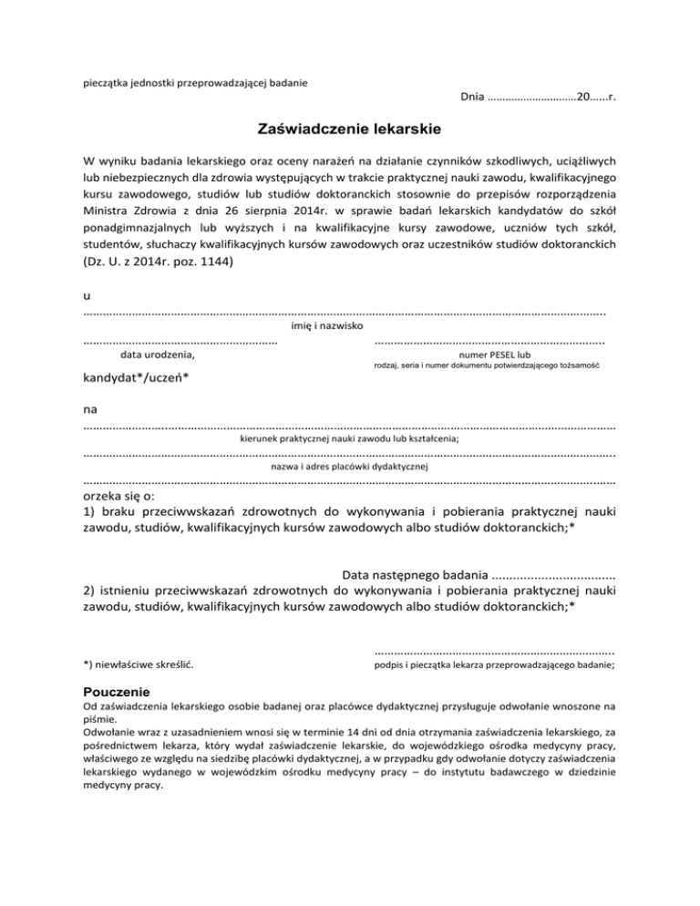 pieczątka jednostki przeprowadzającej badanie Dnia …………………………20…...r. Zaświadczenie lekarskie W wyniku badania lekarskiego oraz oceny narażeń na działanie czynników szkodliwych, uciążliwych lub niebezpiecznych dla zdrowia występujących w trakcie praktycznej nauki zawodu, kwalifikacyjnego kursu zawodowego, studiów lub studiów doktoranckich stosownie do przepisów rozporządzenia Ministra Zdrowia z dnia 26 sierpnia 2014r. w sprawie badań lekarskich kandydatów do szkół ponadgimnazjalnych lub wyższych i na kwalifikacyjne kursy zawodowe, uczniów tych szkół, studentów, słuchaczy kwalifikacyjnych kursów zawodowych oraz uczestników studiów doktoranckich (Dz. U. z 2014r. poz. 1144) u …………………………………………………………………………………………………………………………………………….. imię i nazwisko …………………………………………………… …………………………………………………………….. data urodzenia, numer PESEL lub rodzaj, seria i numer dokumentu potwierdzającego tożsamość kandydat*/uczeń* na ……………………..………………………………………………………………………………………………………………………… kierunek praktycznej nauki zawodu lub kształcenia; ……………………………………………………………………………………………………………………………………………….. nazwa i adres placówki dydaktycznej …………………………………………………………………………………………………………………………………………..…… orzeka się o: 1) braku przeciwwskazań zdrowotnych do wykonywania i pobierania praktycznej nauki zawodu, studiów, kwalifikacyjnych kursów zawodowych albo studiów doktoranckich;* Data następnego badania ................................... 2) istnieniu przeciwwskazań zdrowotnych do wykonywania i pobierania praktycznej nauki zawodu, studiów, kwalifikacyjnych kursów zawodowych albo studiów doktoranckich;* ……………………………………………………………….. *) niewłaściwe skreślić. podpis i pieczątka lekarza przeprowadzającego badanie; Pouczenie Od zaświadczenia lekarskiego osobie badanej oraz placówce dydaktycznej przysługuje odwołanie wnoszone na piśmie. Odwołanie wraz z uzasadnieniem wnosi się w terminie 14 dni od dnia otrzymania zaświadczenia lekarskiego, za pośrednictwem lekarza, który wydał zaświadczenie lekarskie, do wojewódzkiego ośrodka medycyny pracy, właściwego ze względu na siedzibę placówki dydaktycznej, a w przypadku gdy odwołanie dotyczy zaświadczenia lekarskiego wydanego w wojewódzkim ośrodku medycyny pracy – do instytutu badawczego w dziedzinie medycyny pracy.