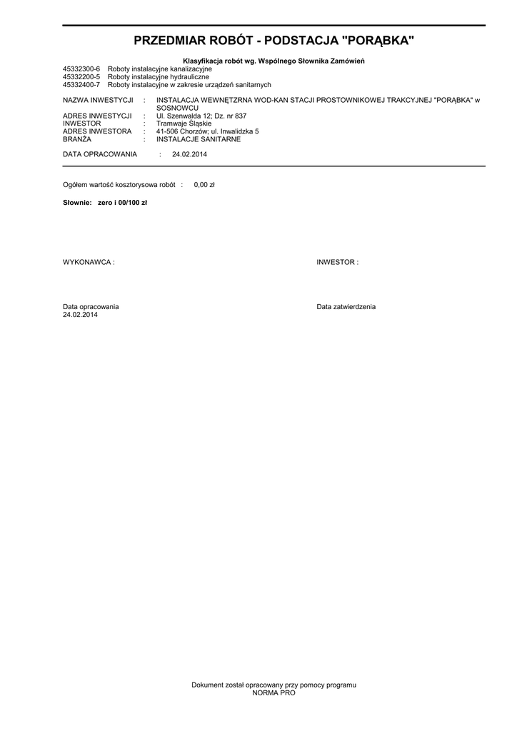 Sosnowiec Podstacja Porąbka PRZEDMIAR