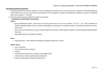 Załącznik Nr 1 do ogłoszenia ZO-PGO/02/2015 – SPECYFIKACJA PRZEDMIOTU ZAMÓWIENIA Specyfikacja przedmiotu zamówienia: 1. Przedmiotem zamówienia jest zakup i dostawa 4 szt. opon superelastycznych (pełnych) oraz 4 szt. felg do tych opon z montażem do ładowarki teleskopowej JCB 535-95AG oraz 4 szt. opon do samochodu ciężarowego DAF CF 85, pracujących w Zakładzie Unieszkodliwiania Odpadów komunalnych w Siedliskach k/Ełku, adres: Siedliska 77, 19-300 Ełk. 2. Minimalne parametry techniczno-jakościowe przedmiotu zamówienia: - ŁADOWARKA TELESKOPOWA JCB 535-95AG: OPONY: • opony superelastyczne (pełne) - rozmiar opony 13.00-24/8,5 (wymiar opony w mm (3): max. szerokość - 330; O.D. +/- 2% - 1290 z bieżnikiem TLH SolidAir posiadające trójkątne otwory w warstwie amortyzującej lub równoważnym we wszystkich opisanych minimalnych parametrach technicznojakościowych; • opony muszą być przystosowane do pracy w sortowni odpadów komunalnych w strefie załadunku odpadów na linię technologiczną (gładka posadzka betonowa); • gwarantujące odporność na przecięcia i przebicia. FELGI: • felgi pierścieniowe - rozmiar felgi 8.50-24 spełniające wymagania obciążeniowe maszyny; OPONY i FELGI: • nowe - nieużywane; • wolne od wad fizycznych i prawnych; • I gatunku; • wyprodukowana nie później niż 12 miesięcy od daty składania ofert; • przeznaczona do maszyn specjalistycznego zastosowania; • zgodne z obowiązującymi wymaganiami Polskich Norm. Strona 1 z 3 - SAMOCHÓD CIĘŻAROWY DAF CF 85: OPONY: • opony ciężarowe – rozmiar opony 315/80 R22.5, szerokość 315 mm, profil 80, średnica felgi 22.5 cali, indeks ładowności 156/150, typ (TT/TL) TL bezdętkowa, indeks prędkości L do 120 km/h, lub równoważnym we wszystkich opisanych parametrach techniczno-jakościowych; • opony muszą być przystosowane do jazdy lokalnej i na długich dystansach; • posiadające geometrię zapewniającą dobre parametry hamowania na mokrej nawierzchni, wysoką wytrzymałość i długie przebiegi; • posiadające konstrukcję pozwalającą na większą ładowność oraz mniejsze opory toczenia; • nowe - nieużywane; • wolne od wad fizycznych i prawnych; • I gatunku; • wyprodukowana nie później niż 12 miesięcy od daty składania ofert; • zgodne z obowiązującymi wymaganiami Polskich Norm. Strona 2 z 3 LP. I 1. WYSZCZEGÓLNIENIE PRZEDMIOTU ZAMÓWIENIA JEDNOSTKA MIARY ILOŚĆ II III IV ŁADOWARKA TELESKOPOWA JCB 535-95AG Opona superelastyczna (pełna) szt. CENA JEDNOSTKOWA ZA JEDNĄ SZTUKĘ ZŁ NETTO V WARTOŚĆ ZŁ NETTO VI 4 2. Felga pierścieniowa szt. 4 3. Montaż opon z felgami (komplety) szt. 4 szt. 4 SAMOCHÓD CIĘŻAROWY DAF CF 85 4. Opony ciężarowe CAŁKOWITA CENA NETTO OFERTY (ZŁ) WARTOŚĆ PODATKU VAT (ZŁ) CAŁKOWITA CENA BRUTTO OFERTY (ZŁ) ................................................ /miejscowość i data/ ................................................................. /podpis i imienna pieczątka osoby upoważnionej do reprezentowania Wykonawcy/ Strona 3 z 3