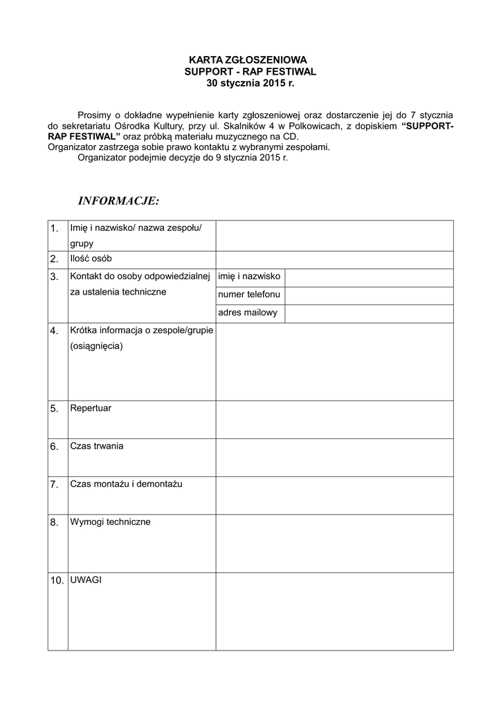 KARTA ZGŁOSZENIOWA SUPPORT - RAP FESTIWAL 30 stycznia 2015 r. Prosimy o dokładne wypełnienie karty zgłoszeniowej oraz dostarczenie jej do 7 stycznia do sekretariatu Ośrodka Kultury, przy ul. Skalników 4 w Polkowicach, z dopiskiem “SUPPORTRAP FESTIWAL” oraz próbką materiału muzycznego na CD. Organizator zastrzega sobie prawo kontaktu z wybranymi zespołami. Organizator podejmie decyzje do 9 stycznia 2015 r. INFORMACJE: 1. Imię i nazwisko/ nazwa zespołu/ grupy 2. Ilość osób 3. Kontakt do osoby odpowiedzialnej imię i nazwisko za ustalenia techniczne numer telefonu adres mailowy 4. Krótka informacja o zespole/grupie (osiągnięcia) 5. Repertuar 6. Czas trwania 7. Czas montażu i demontażu 8. Wymogi techniczne 10. UWAGI