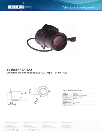 Telewizja przemysłowa YV10x5HR4A-SA2 Obiektyw zmiennoogniskowy 1/3", Mpx , 5~50 (10x) Specyfikacja techniczna Funkcje Ogniskowa Przysłona Kąt widzenia Rodzaj mocowania obiektywu Temperatura pracy Waga Producent / importer C&C Partners Telecom Sp. z o.o. ul. 17 Stycznia 119, 121 64-100 Leszno tel. +48 65 525 55 55 e-mail: [email protected] C&C Partners Telecom Sp. z o.o. ul. Polanki 67c 80-302 Gdańsk tel. +48 58 739 67 80 e-mail: [email protected] www.ccpartners.pl www.b2b-ccpartners.pl C&C Partners Telecom Sp. z o.o. ul. Malinowa 8 40-692 Katowice tel. +48 32 201 78 91 e-mail: [email protected] Parametry 5~50 (10x) F1.6 ~ T360 (ekwiwalent F360) Wide 51°17´ X 39° 36´ Tele 5°30´ X 4°07´ CS -10° C ~ +50° C 85 g Fujinon C&C Partners Telecom Sp. z o.o. Ursynów Business Park ul. Puławska 303 wejście B 02-785 Warszawa tel. +48 22 549 70 00 e-mail: [email protected]