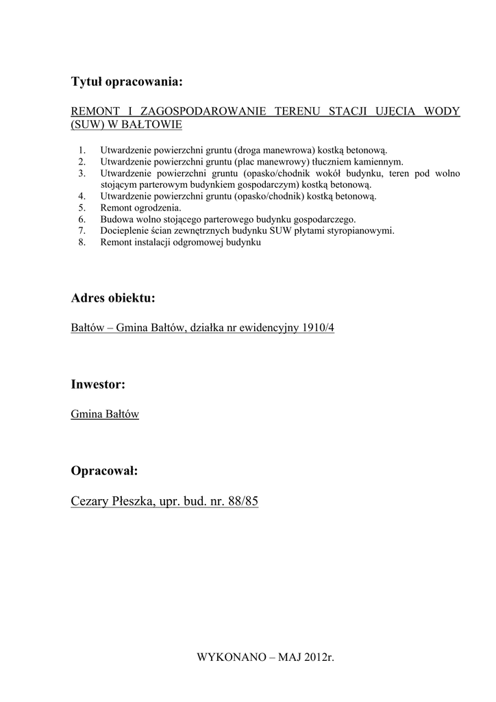 Tytuł opracowania: REMONT I ZAGOSPODAROWANIE TERENU STACJI UJĘCIA WODY (SUW) W BAŁTOWIE 1. 2. 3. 4. 5. 6. 7. 8. Utwardzenie powierzchni gruntu (droga manewrowa) kostką betonową. Utwardzenie powierzchni gruntu (plac manewrowy) tłuczniem kamiennym. Utwardzenie powierzchni gruntu (opasko/chodnik wokół budynku, teren pod wolno stojącym parterowym budynkiem gospodarczym) kostką betonową. Utwardzenie powierzchni gruntu (opasko/chodnik) kostką betonową. Remont ogrodzenia. Budowa wolno stojącego parterowego budynku gospodarczego. Docieplenie ścian zewnętrznych budynku SUW płytami styropianowymi. Remont instalacji odgromowej budynku Adres obiektu: Bałtów – Gmina Bałtów, działka nr ewidencyjny 1910/4 Inwestor: Gmina Bałtów Opracował: Cezary Płeszka, upr. bud. nr. 88/85 WYKONANO – MAJ 2012r. Zawartość opracowania : 1. Strona tytułowa 2. Część opisowa istniejącego stanu zagospodarowania terenu 3. Część opisowa planowanych robót 4. Sytuacja, rys. nr 1 - 1:500 5. Ukształtowanie powierzchni utwardzonych gruntu, rys. nr 2 - 1:250 6. Przekroje drogowe, rys. nr 3 - 1:15 7. Rysunki z rozwiązaniami systemowymi 2 2. Opis Istniejącego Stanu Zagospodarowania Terenu : Stacja Ujęcia Wody (SUW) znajduje się w górnej części miejscowości Bałtów przy lokalnej drodze posiadającej jezdnię asfaltową. Na placu nie utwardzonym, ogrodzonym elementami trwałymi (siatka + słupki stalowe i żelbetowe ) znajduje się budynek SUW murowany cegłą silikatową, dwie studnie głębinowe (podstawowa i awaryjna), zbiornik wyrównawczy stalowy oraz bezodpływowy zbiornik ścieków – fotografia 1, 2, 3,4. Fotografia 1 Fotografia 2 Fotografia 3 Fotografia 4 2.1.Występujące warunki gruntowe to: 1. gliny piaszczyste - 0,5- 0,2m 2. rumosz wapienny - 0,2- 2,0m 3. wapienie - 2,0-40,0m Odpór gruntu wynosi 0,15MPa 3 3. Opis planowanych robót: 3.1. BILANS TERENU: powierzchnia działki – 1200 m2 powierzchnia zabudowy – 79 m2 powierzchnia utwardzona – 321 m2 powierzchnia trawiasta – 800 m2 powierzchnia biologicznie czynna – 800 m2 procent powierzchni biologicznej czynnej wskaźnik gęstości zabudowy działki wskaźnik intensywności zabudowy (p.c./p.t.) – 66,66% – 7,58 % – 0,066 3.2. UTWARDZENIE POWIERZCHNI GRUNTU: Celem niniejszego opracowania jest zaprojektowanie drogi manewrowej, placu manewrowego, opasko/chodnika wokół budynku, terenu pod wolno stojącym parterowym budynkiem gospodarczym przy SUW w Bałtowie 3.2.1. opis warstw konstrukcyjnych Warstwę ścieralną konstrukcji nawierzchni drogi manewrowej, opasko/chodnika wokół budynku, terenu pod wolno stojącym parterowym budynkiem gospodarczym zaprojektowano z kostki betonowej na podbudowie z kruszywa łamanego 0-63 mm grub. 15 cm, a placu manewrowego nawierzchnię z kruszywa łamanego 8-16 mm na podbudowie z kruszywa łamanego 0-63 mm grub. 15 cm. Ze względu na występujące w podłożu grunty spoiste przechodzące w skaliste zaprojektowano 15 cm dodatkową warstwę odcinającą z piasku. Dla oddzielenia nawierzchni jezdni dróg manewrowych od opasek, chodników i pasów zieleni zastosowano krawężnik betonowy o szerokości 15 cm. Krawężnik wysunięto 10 cm nad nawierzchnię jezdni. Na wysokości wejść do budynków, wjazdu do planowanego wolnostojącego budynku gospodarczego oraz w miejscach zejść z chodnika na jezdnię krawężnik należy zaniżyć +2cm nad nawierzchnię jezdni. Powierzchnie zielone oddzielono od chodników obrzeżem trawnikowym o wymiarach 8x30 cm. Szczegóły warstw konstrukcyjnych ciągów komunikacyjnych znajdują się na rysunku Nr 3. 3.2.2. zestawienie powierzchni projektowanych ciągów komunikacyjnych 1. Plac Manewrowy - 115,0 m2 2. Droga manewrowa - 1145,2 m2 3. Opasko/Chodnik z dodatkową pow. pod wolno stojący budynek gosp. – 43,7 m2 4. Opasko/Chodnik do zbiornika – 17,1 m2 3.3. OCIEPLENIE ŚCIAN ZEWNĘTRZNYCH POWYŻEJ POZIOMU GRUNTU 3.3.1. Przygotowanie podłoża W każdym przypadku bardzo istotne jest dokładne sprawdzenie jakości podłoża ściennego. Dotyczy to jego wytrzymałości powierzchniowej, stopnia równości i płaskości powierzchni oraz czystości. Oceny jakości podłoża należy dokonać stosując metodę „pull off” pozwalającą określić wytrzymałość na rozciąganie (powinna wynosić ona co najmniej 0,08 MPa). Przy braku urządzenia do testów „pull off” można do oczyszczonego z kurzu, pyłu i powłok malarskich podłoża przykleić za pomocą kleju systemowego próbki materiału izolacyjnego o wymiarach 4 100 x 100 mm (8 – 10 próbek). Badanie wykonać po 3 dniach przeprowadzając próbę ręcznego odrywania przyklejonej próbki. Jeśli materiał izolacyjny zostanie zerwany w swej strukturze, oznacza to, że podłoże charakteryzuje się odpowiednią wytrzymałością. Natomiast w przypadku oderwania próbki z klejem i warstwą fakturową konieczne jest oczyszczenie elewacji ze słabo związanej z podłożem warstwy. Oczyszczone podłoże należy zagruntować preparatem i powtórzyć badanie. Jeżeli ponowna próba da wynik negatywny, należy rozważyć dodatkowe mocowanie mechaniczne. W przypadku ścian charakteryzujących się odpowiednią wytrzymałością, ale odznaczających się zbyt dużą nierównością powierzchni, skuteczne może się okazać nałożenie warstwy wyrównawczej. Przy nierównościach podłoża do 10 mm – należy zastosować szpachlówkę lub zaprawę cementową z dodatkiem emulsji kontaktowej. Przy nierównościach podłoża od 10 do 20 mm - można zastosować zaprawę cementową z dodatkiem emulsji kontaktowej. Jeśli nierówność przekroczy 20 mm, należy przeprowadzić naprawę naklejając materiał termoizolacyjny o odpowiedniej grubości (z uwzględnieniem dodatkowego mocowania warstwy zasadniczej za pomocą łączników mechanicznych). 3.3.2. Mocowanie płyt styropianowych Płyty styropianowe grubości 10 cm należy mocować do podłoża poziomo – z zachowaniem „mijankowego” układu spoin p