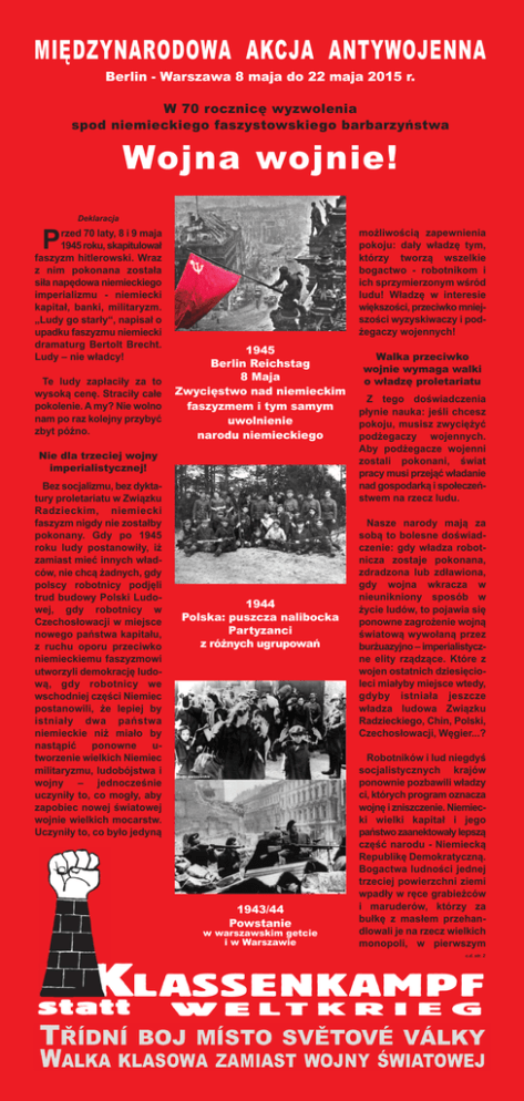 7 MiędZyNaRodoWa akcja aNtyWojeNNa Berlin - Warszawa 8 maja do 22 maja 2015 r. W 70 rocznicę wyzwolenia spod niemieckiego faszystowskiego barbarzyństwa Wojna wojnie! Deklaracja P rzed 70 laty, 8 i 9 maja 1945 roku, skapitulował faszyzm hitlerowski. Wraz z nim pokonana została siła napędowa niemieckiego imperializmu - niemiecki kapitał, banki, militaryzm. „Ludy go starły“, napisał o upadku faszyzmu niemiecki dramaturg Bertolt Brecht. Ludy – nie władcy! Te ludy zapłaciły za to wysoką cenę. Straciły całe pokolenie. A my? Nie wolno nam po raz kolejny przybyć zbyt późno. możliwością zapewnienia pokoju: dały władzę tym, którzy tworzą wszelkie bogactwo - robotnikom i ich sprzymierzonym wśród ludu! Władzę w interesie większości, przeciwko mniejszości wyzyskiwaczy i podżegaczy wojennych! 1945 Berlin Reichstag 8 Maja Zwycięstwo nad niemieckim faszyzmem i tym samym uwolnienie narodu niemieckiego Nie dla trzeciej wojny imperialistycznej! Bez socjalizmu, bez dyktatury proletariatu w Związku Radzieckim, niemiecki faszyzm nigdy nie zostałby pokonany. Gdy po 1945 roku ludy postanowiły, iż zamiast mieć innych władców, nie chcą żadnych, gdy polscy robotnicy podjęli trud budowy Polski Ludowej, gdy robotnicy w Czechosłowacji w miejsce nowego państwa kapitału, z ruchu oporu przeciwko niemieckiemu faszyzmowi utworzyli demokrację ludową, gdy robotnicy we wschodniej części Niemiec postanowili, że lepiej by istniały dwa państwa niemieckie niż miało by nastąpić ponowne utworzenie wielkich Niemiec militaryzmu, ludobójstwa i wojny – jednocześnie uczyniły to, co mogły, aby zapobiec nowej światowej wojnie wielkich mocarstw. Uczyniły to, co było jedyną 1944 Polska: puszcza nalibocka Partyzanci z różnych ugrupowań Getto warszawskie Warszawa 1943/44 Powstanie w warszawskim getcie i w Warszawie Walka przeciwko wojnie wymaga walki o władzę proletariatu Z tego doświadczenia płynie nauka: jeśli chcesz pokoju, musisz zwyciężyć podżegaczy wojennych. Aby podżegacze wojenni zostali pokonani, świat pracy musi przejąć władanie nad gospodarką i społeczeństwem na rzecz ludu. Nasze narody mają za sobą to bolesne doświadczenie: gdy władza robotnicza zostaje pokonana, zdradzona lub zdławiona, gdy wojna wkracza w nieunikniony sposób w życie ludów, to pojawia się ponowne zagrożenie wojną światową wywołaną przez burżuazyjno – imperialistyczne elity rządzące. Które z wojen ostatnich dziesięcioleci miałyby miejsce wtedy, gdyby istniała jeszcze władza ludowa Związku Radzieckiego, Chin, Polski, Czechosłowacji, Węgier...? Robotników i lud niegdyś socjalistycznych krajów ponownie pozbawili władzy ci, których program oznacza wojnę i zniszczenie. Niemiecki wielki kapitał i jego państwo zaanektowały lepszą część narodu - Niemiecką Republikę Demokratyczną. Bogactwa ludności jednej trzeciej powierzchni ziemi wpadły w ręce grabieżców i maruderów, którzy za bułkę z masłem przehandlowali je na rzecz wielkich monopoli, w pierwszym c.d. str. 2 LASSENKAMPF K ta tt s ta tt W E LT K R I E G ... Deklaracja rzędzie niemieckich, które wykorzystują skradzioną ludowi władzę do plądrowania przedsiębiorstw i spółdzielni produkcyjnych. Przeżycie wyzyskiwaczom i pasożytom zapewnia tylko prowadzenie imperialistycznych wojen o podział świata. być pewni kontroli nad nimi. Trwa zaciekła walka pomiędzy Ameryką i Niemcami o Polskę. Polscy wyzyskiwacze po raz kolejny stawiają naród przed zgubną alternatywą: ostateczne podporządkowanie się tym, którzy posiadają już większą część kraju i nią zarządzają albo podporządkowanie się tym, O ile gorsze stało się przez to życie nas którzy wszystko to chcą zakwestionować. Czy wszystkich? W krajach, których władcy siedzą przy Polska ponownie ma stać się dzieckiem, które stole zastawionym jadłem, wszyscy sobie wyszarpują? WcZeśNiej jak również w tych, które Aż w końcu zostanie Stocznia im. Lenina w rękach narodu znalazły się w jadłospisie, rozerwane? Gdy ostatnio jako potencjalne cele aneksji, polska burżuazja zadała się agresji i presji ekonomicznej, z niemieckim imperializmem, zgodnie z podziałem kondoprowadziło to do wojny, w tynentu dokonanym przez wyniku której kraj zamienił byłego polskiego premiera się w pustynię i zginął co Tuska. O ile bardziej niepiąty Polak. pewna jest nasza przyszła Jeszcze nie mają odwagi egzystencja? O ile gorsze na wielką wojnę. Również wyżywienie? O ile niższa przypominają sobie: po płaca? Plaga śmieciowych każdej z ich wojen światumów o pracę i leasingu owych kolejna jedna szósta pracowniczego, wprowadzczęść ziemi jednoczyła się ona przez niemieckich monopod czerwonym sztandarem polistów sięgająca po Polskę robotników, chłopów i ludu i Republikę Czeską, objawiła pracującego. się już dawno w postaci działań stanowiących przyRobotnicy i lud pracujący gotowanie do wojny przeciwobecnie jeszcze nie są w ko robotnikom w fabrykach stanie zagwarantować RFN i zaanektowanej NRD. pokoju. Tym pilniej musimy Wielkie rzesze pracujących, PóźNiej sobie przypomnieć naukę, w tym setki tysięcy polskich Stocznia im. Lenina w rękach kapitalistów którą niegdyś wynieśli pracowników, ponoszą robotnicy, wyniosły społeczogromne trudy, aby utrzymać eństwa. Dopiero wtedy, przy życiu i zapewnić gdy ponownie podejmiemy podstawowe, najskromniejwalkę o władzę sprawsze warunki swoim rodzinom. owaną przez lud pracujący, Około 2,2 miliona z nich będziemy w stanie zdecydowało się na unicestwić wojnę! opuszczenie nieprzyjaznego rodzinnego kraju, aby gdzie Podejmując w naszych indziej stać się obiektem krajach walkę przeciwko wyzysku. wyzyskowi, uciskowi i wojnie, Nędza w naszych krajach postanowiliśmy nie pozooraz wojna mają wspólne stawać jedynie przy papierkorzenie: społeczeństwo owych rezolucjach i deklaraoparte na wyzysku, którego