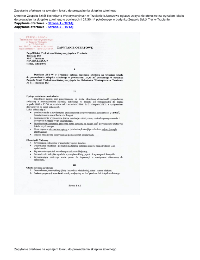 Zapytanie ofertowe na wynajem lokalu do prowadzenia sklepiku szkolnego Dyrektor Zespołu Szkół Techniczno-Weterynaryjnych w Trzcianie k.Rzeszowa ogłasza zapytanie ofertowe na wynajem lokalu do prowadzenia sklepiku szkolnego o powierzchni 27,50 m2 położonego w budynku Zespołu Szkół T-W w Trzcianie. Zapytanie ofertowe - Strona 1 - TUTAJ Zapytanie ofertowe - Strona 2 - TUTAJ Zapytanie ofertowe na wynajem lokalu do prowadzenia sklepiku szkolnego Zapytanie ofertowe na wynajem lokalu do prowadzenia sklepiku szkolnego Zapytanie ofertowe na wynajem lokalu do prowadzenia sklepiku szkolnego
