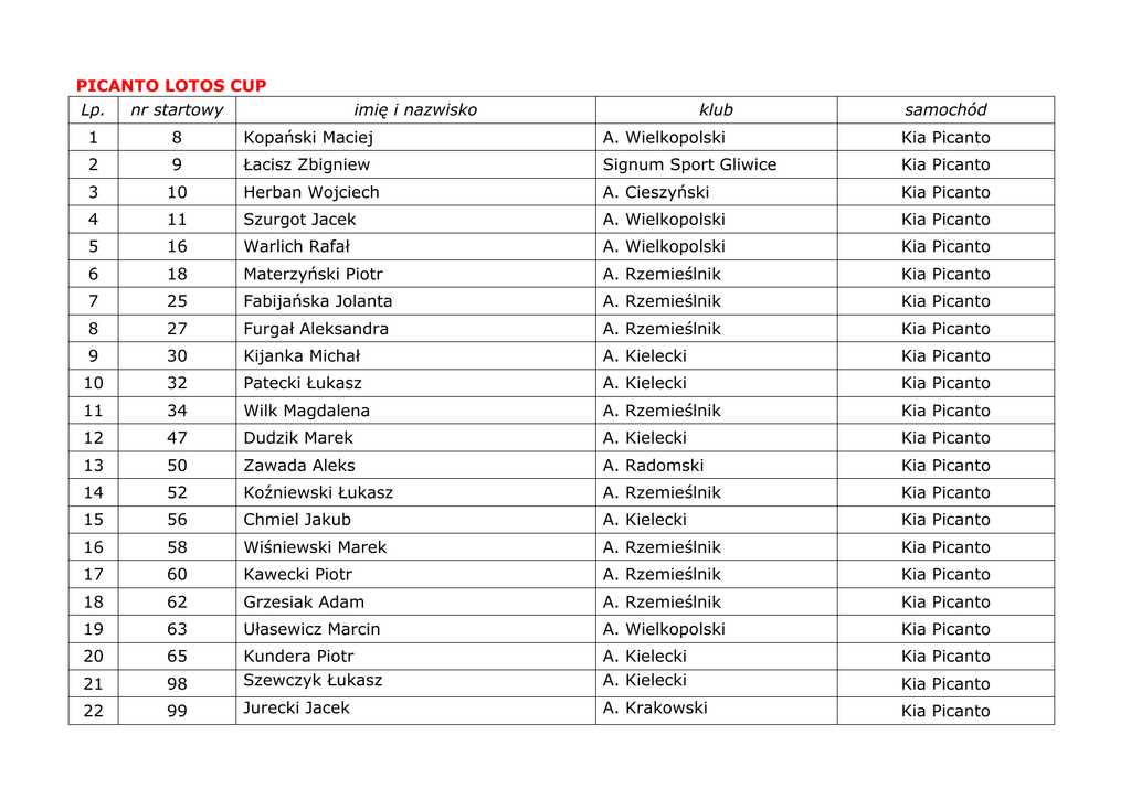 PICANTO LOTOS CUP Lp. nr startowy imię i nazwisko klub